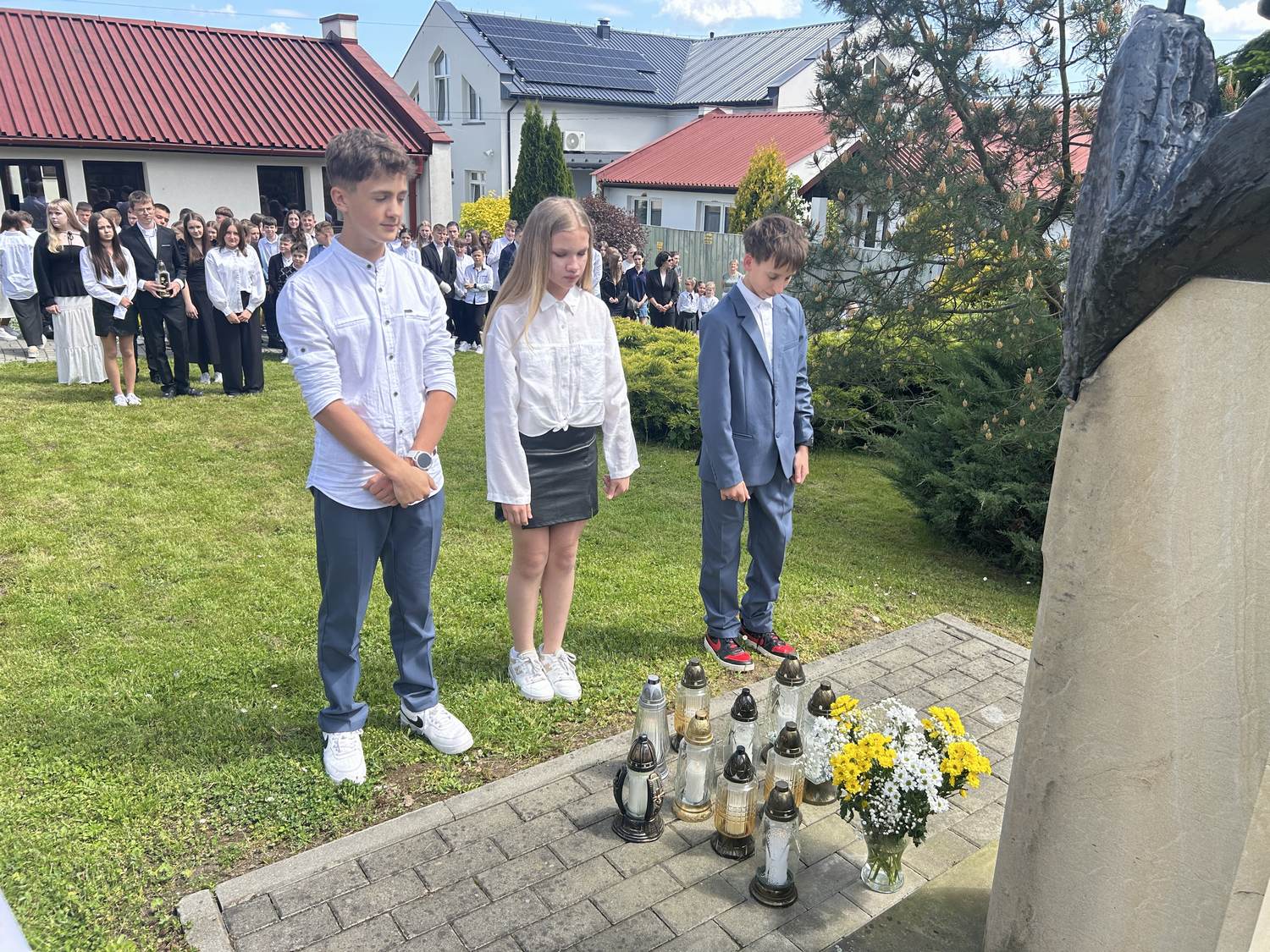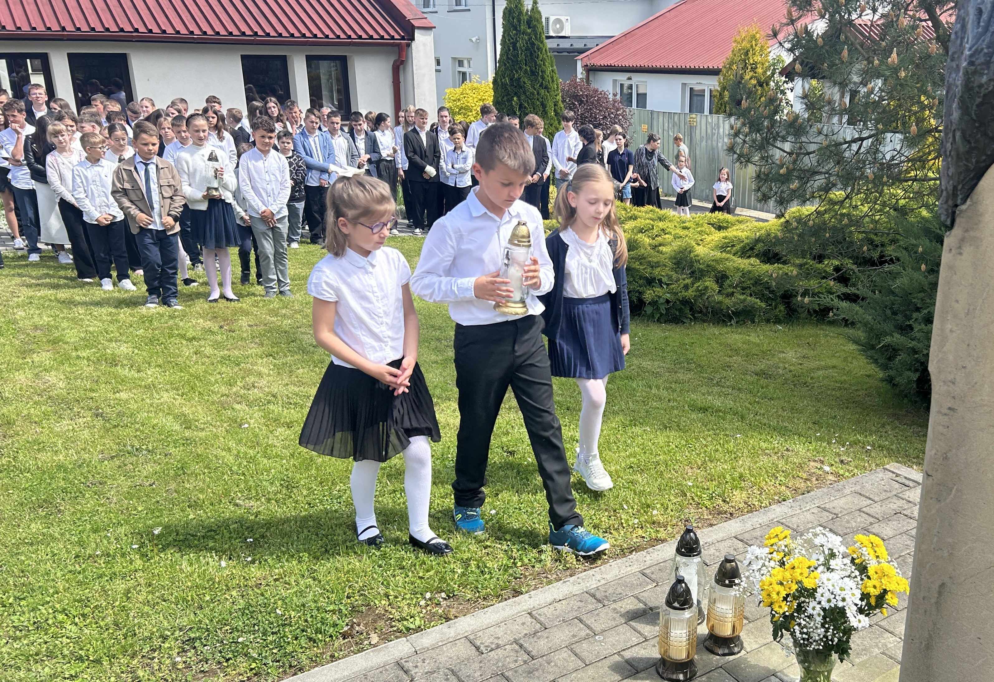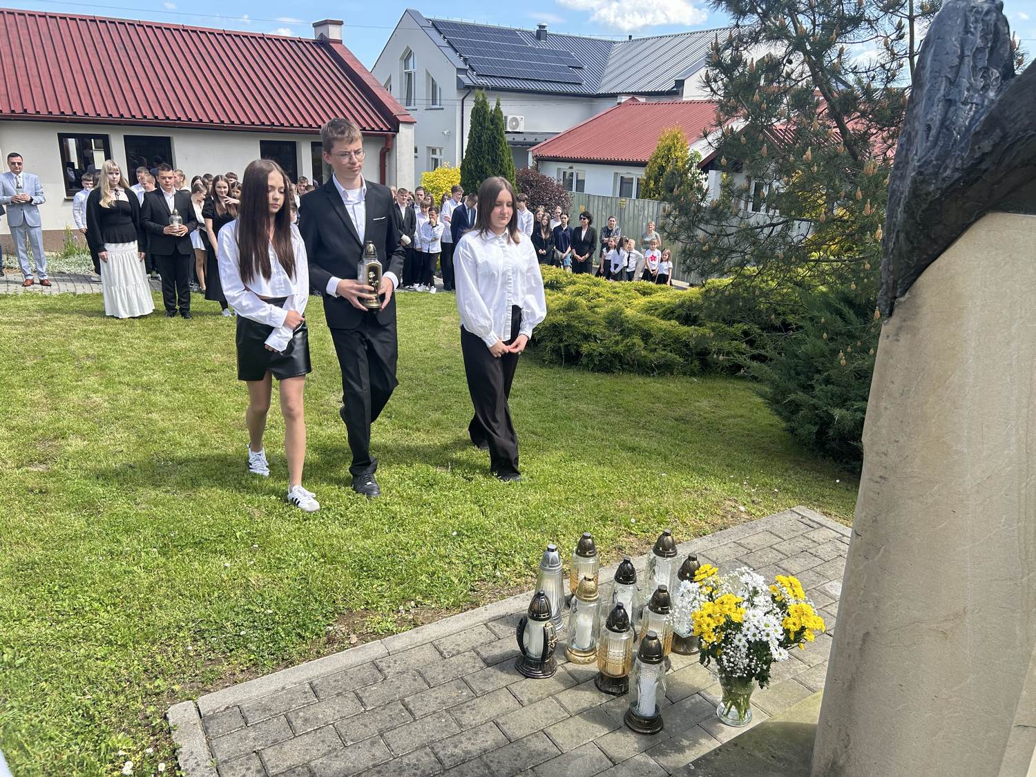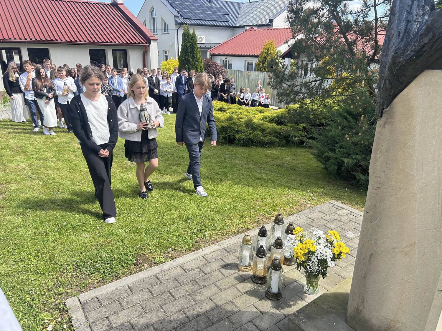 Pod pomnikiem Jana Pawła II znajdującym się na dziedzińcu szkolnym złożono kwiaty i zapalono znicze – jako wyraz pamięci i wdzięczności dla Patrona szkoły. Modlitwę poprowadził ks. Radosław Bobek. Na zakończenie uroczystości Dyrektor Szkoły Dorota Juszczyk, w okolicznościowym przemówieniu podziękowała wszystkim za obecność i wspólne uczczenie tej ważnej dla Szkoły rocznicy.
