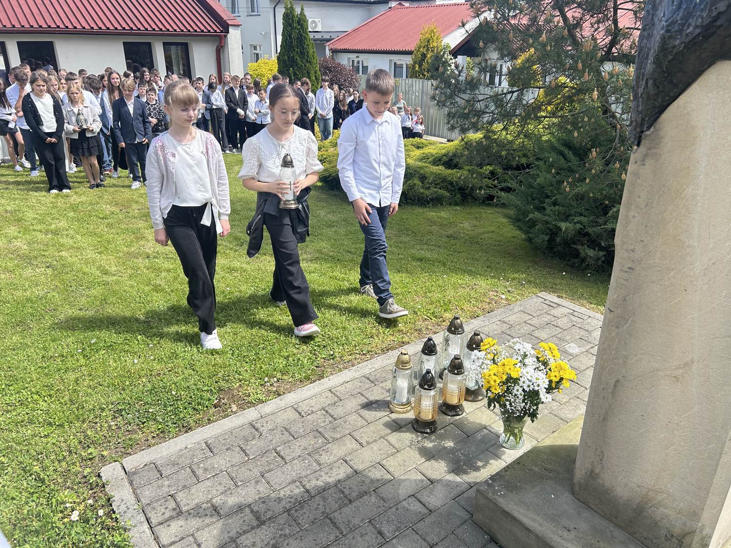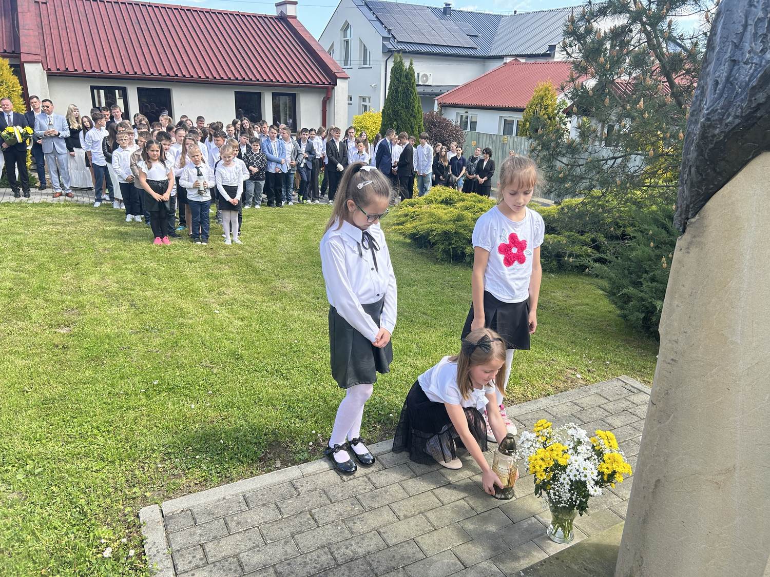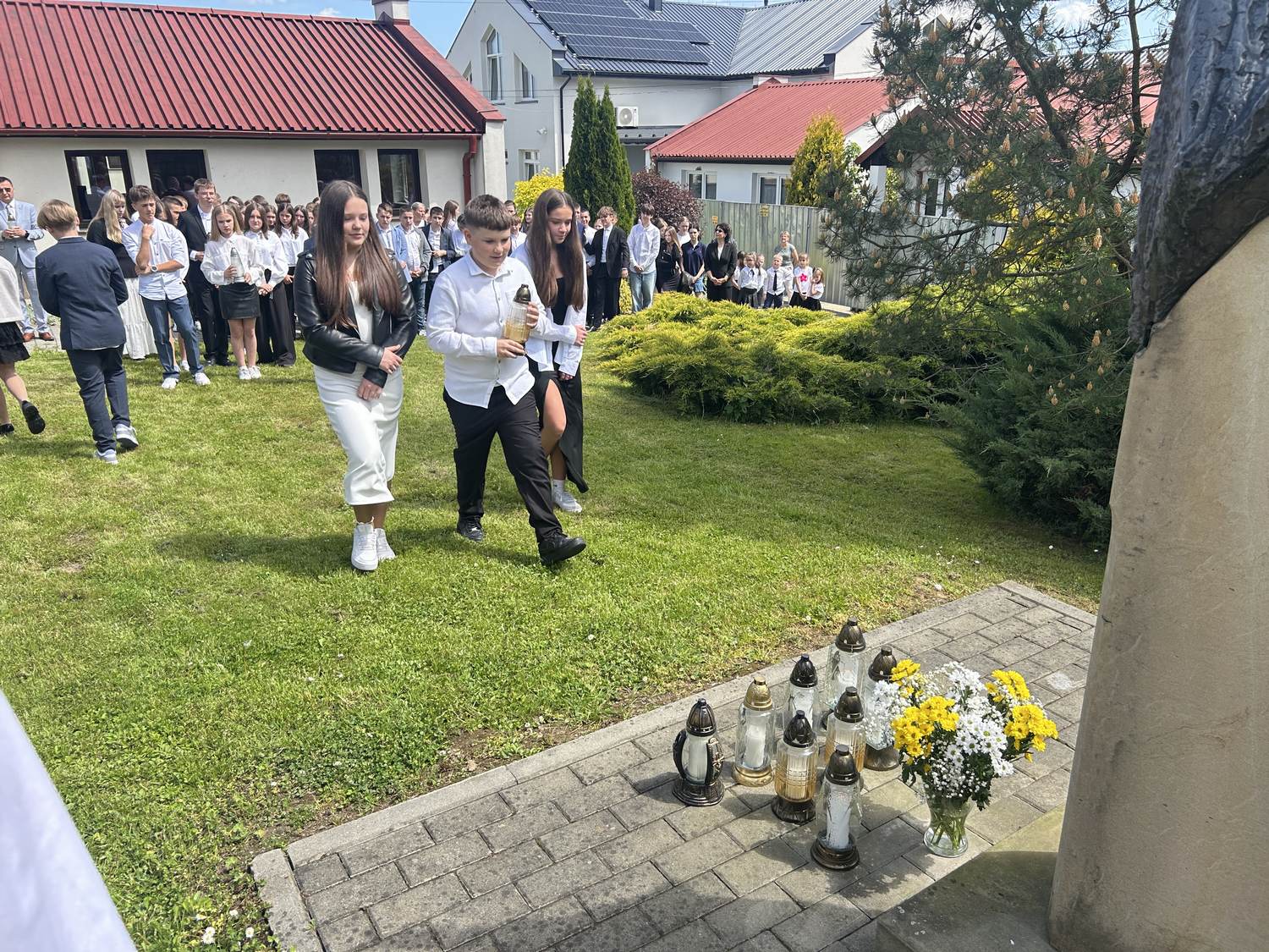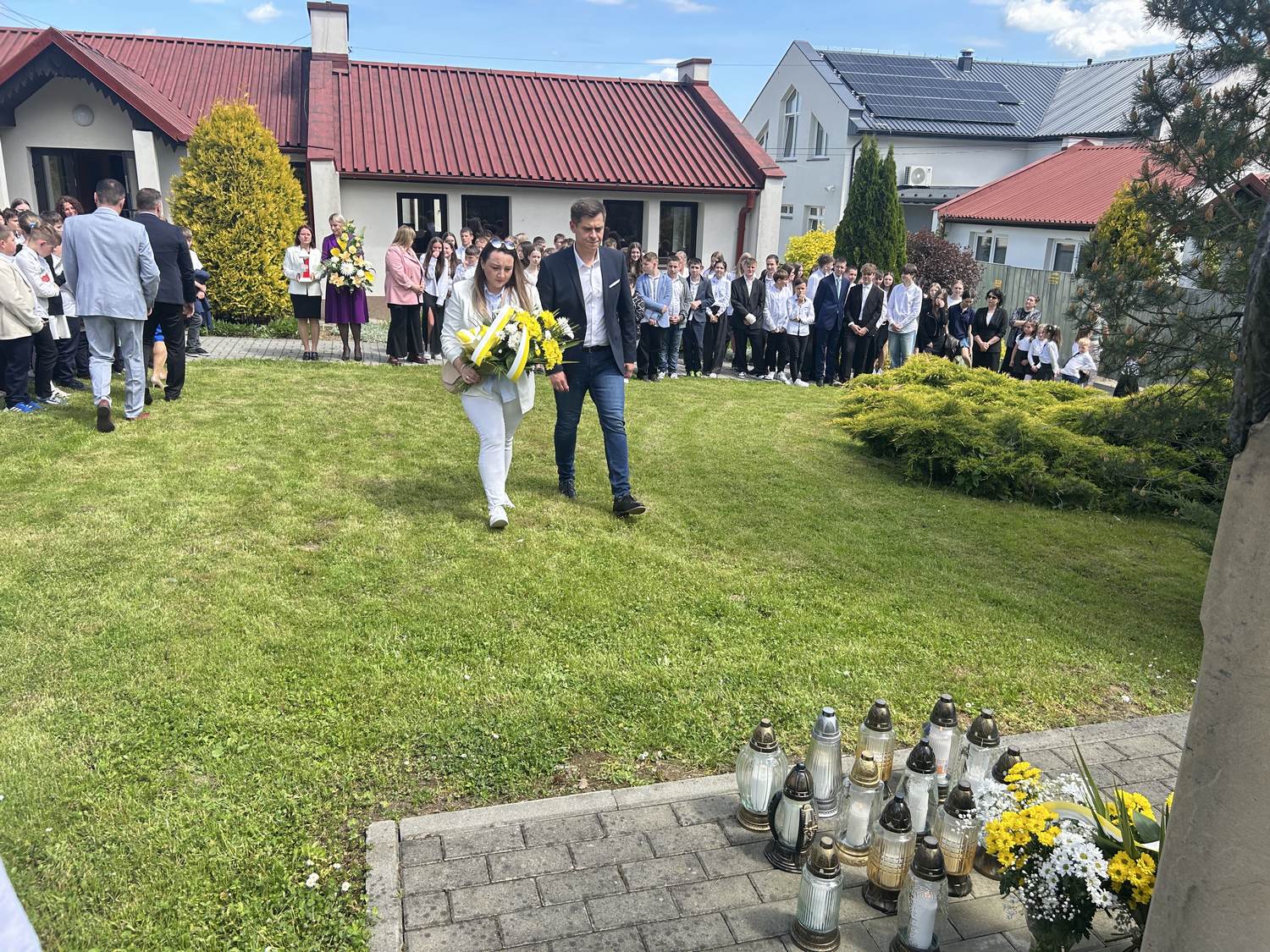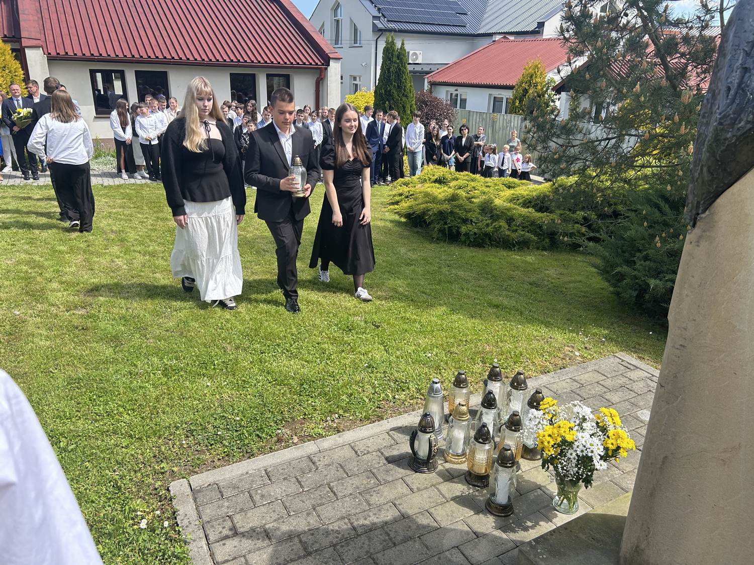 Pod pomnikiem Jana Pawła II znajdującym się na dziedzińcu szkolnym złożono kwiaty i zapalono znicze – jako wyraz pamięci i wdzięczności dla Patrona szkoły. Modlitwę poprowadził ks. Radosław Bobek. Na zakończenie uroczystości Dyrektor Szkoły Dorota Juszczyk, w okolicznościowym przemówieniu podziękowała wszystkim za obecność i wspólne uczczenie tej ważnej dla Szkoły rocznicy.