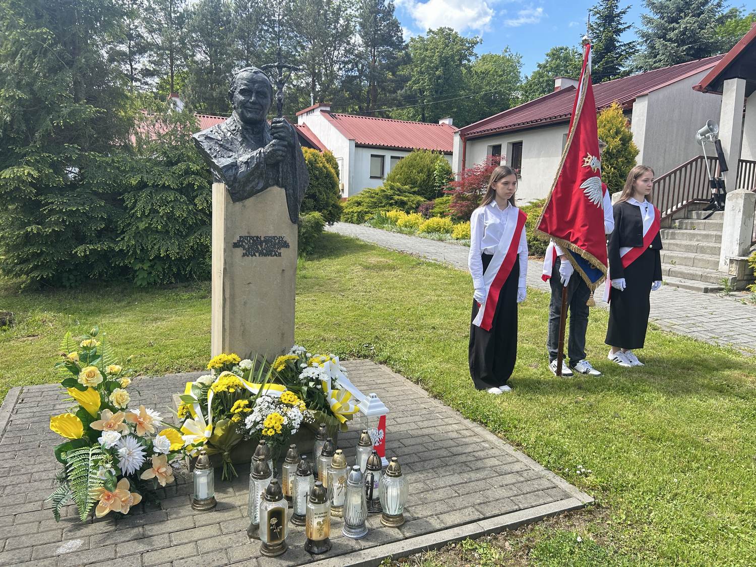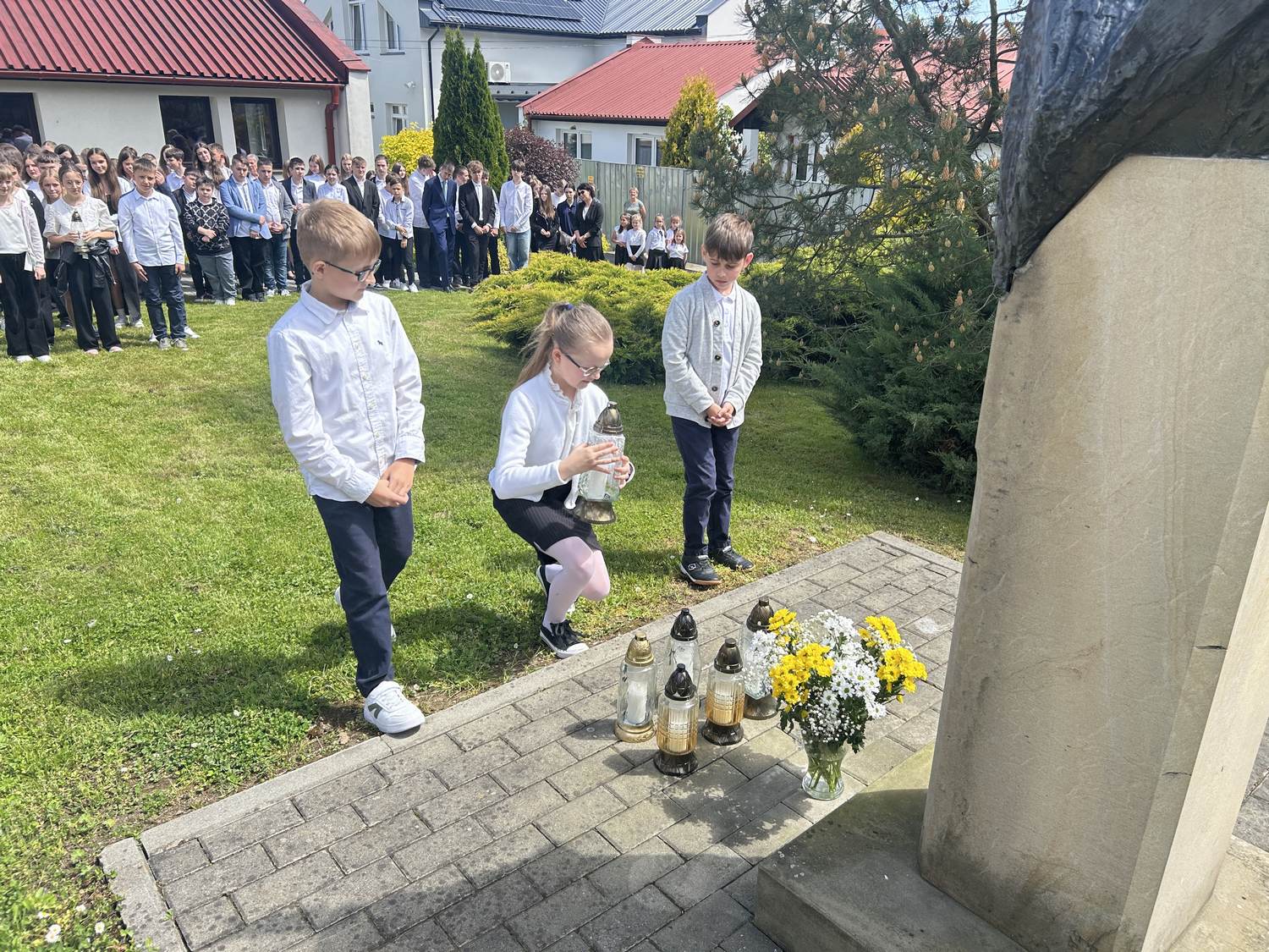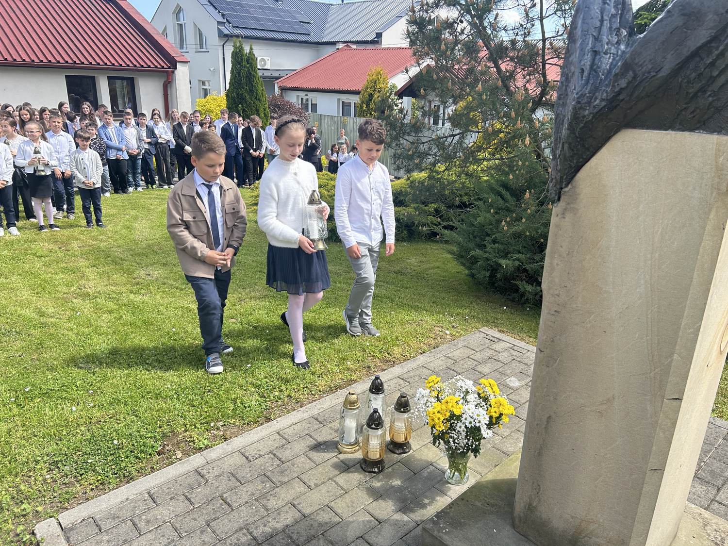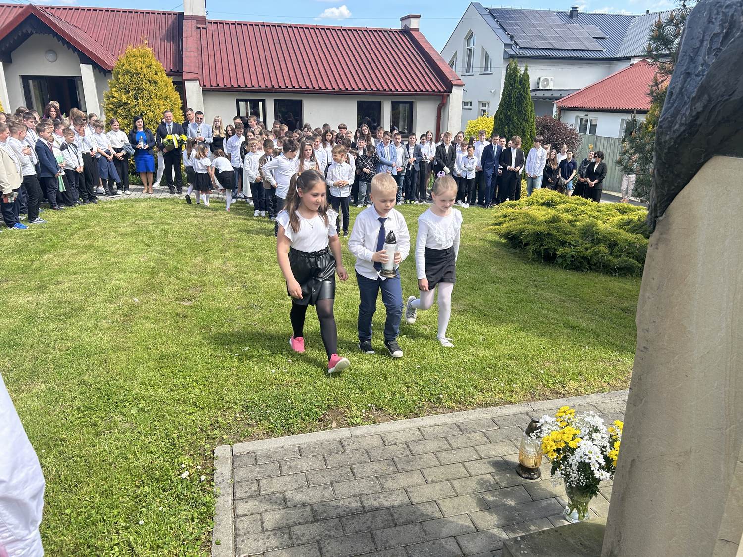 Pod pomnikiem Jana Pawła II znajdującym się na dziedzińcu szkolnym złożono kwiaty i zapalono znicze – jako wyraz pamięci i wdzięczności dla Patrona szkoły. Modlitwę poprowadził ks. Radosław Bobek. Na zakończenie uroczystości Dyrektor Szkoły Dorota Juszczyk, w okolicznościowym przemówieniu podziękowała wszystkim za obecność i wspólne uczczenie tej ważnej dla Szkoły rocznicy.