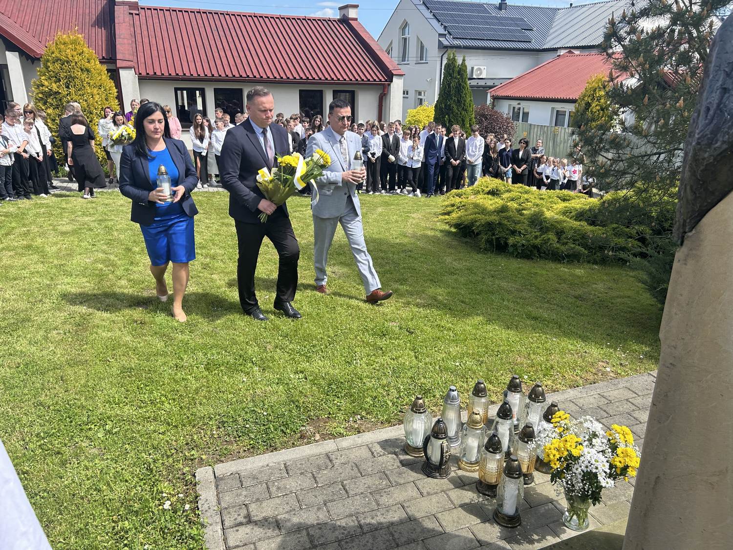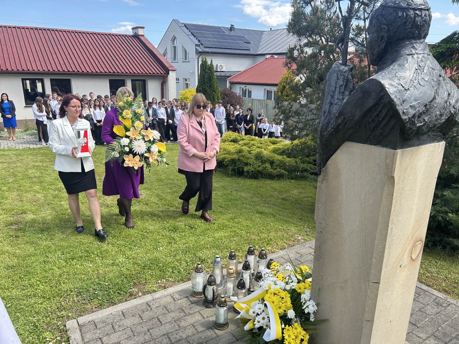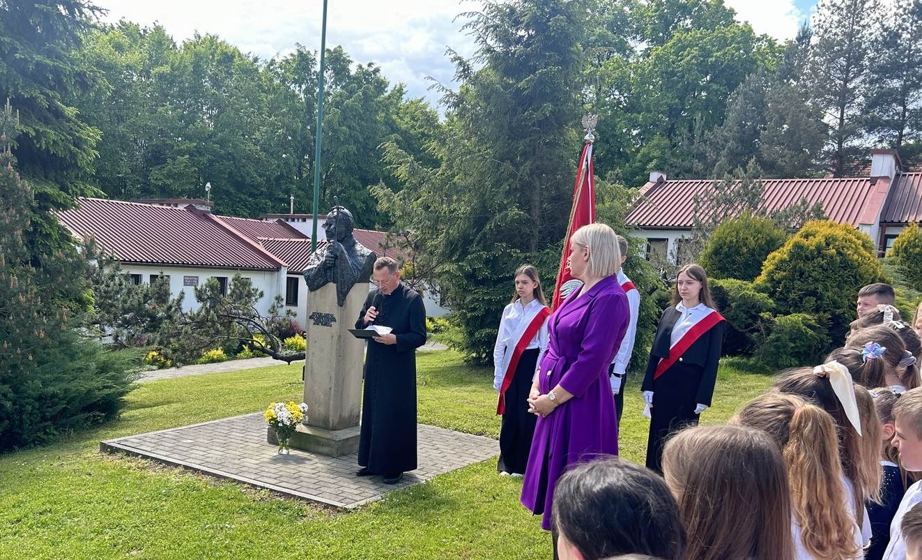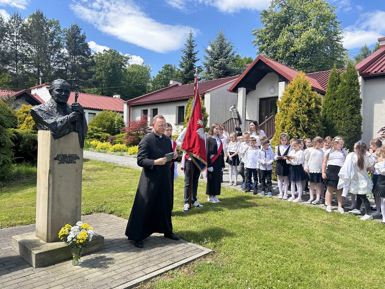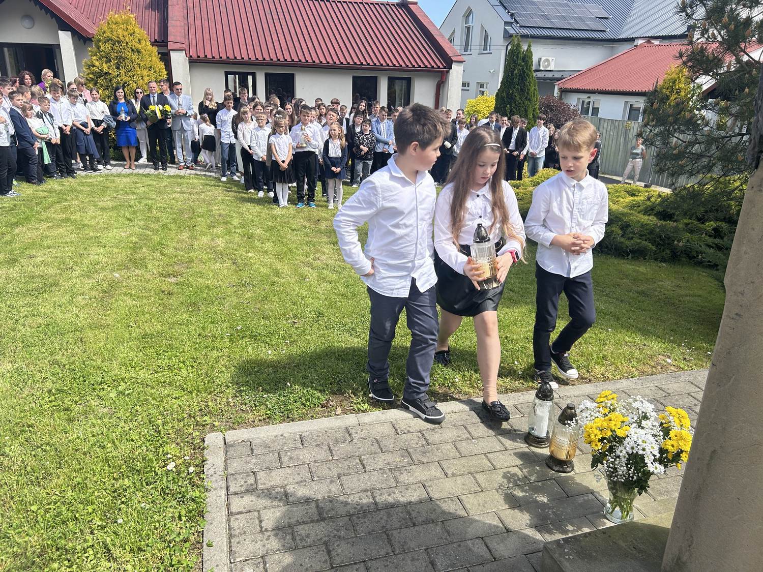 Pod pomnikiem Jana Pawła II znajdującym się na dziedzińcu szkolnym złożono kwiaty i zapalono znicze – jako wyraz pamięci i wdzięczności dla Patrona szkoły. Modlitwę poprowadził ks. Radosław Bobek. Na zakończenie uroczystości Dyrektor Szkoły Dorota Juszczyk, w okolicznościowym przemówieniu podziękowała wszystkim za obecność i wspólne uczczenie tej ważnej dla Szkoły rocznicy.
