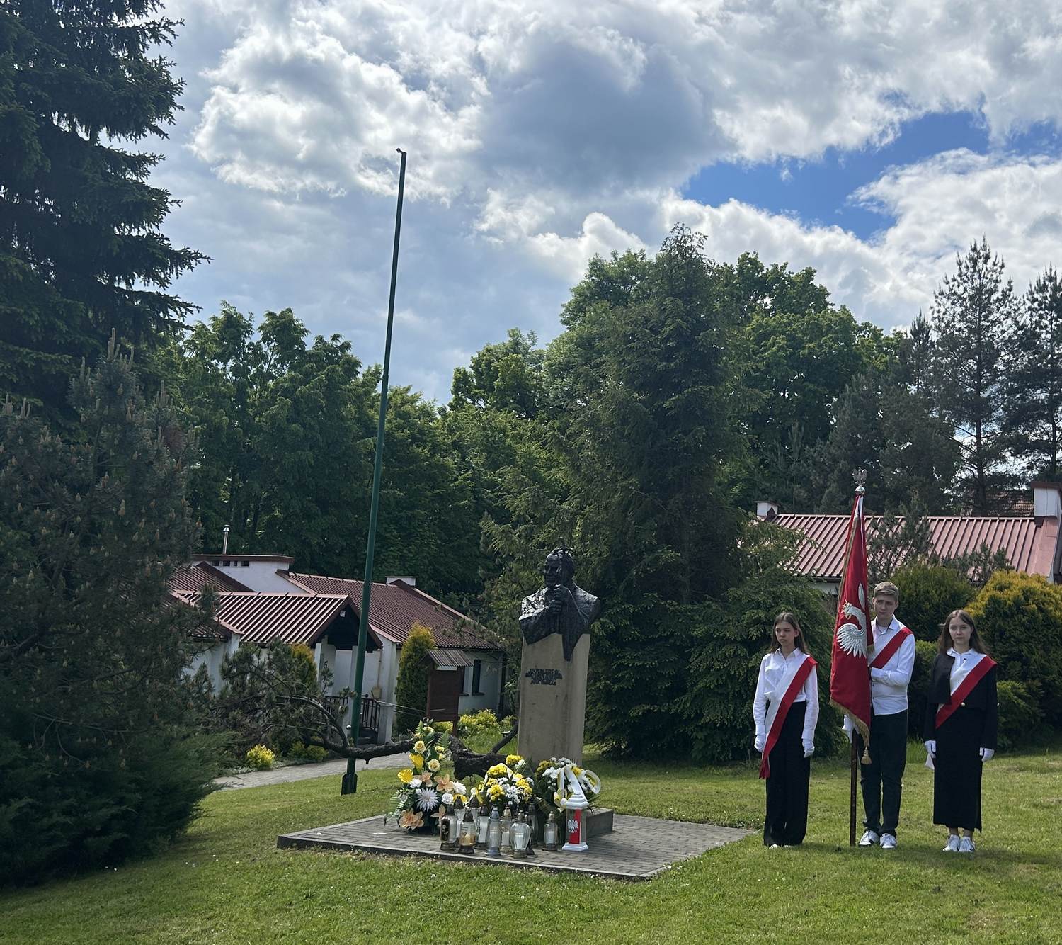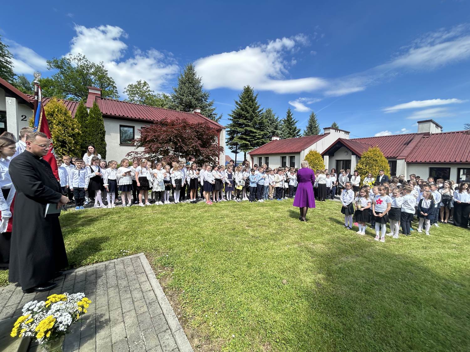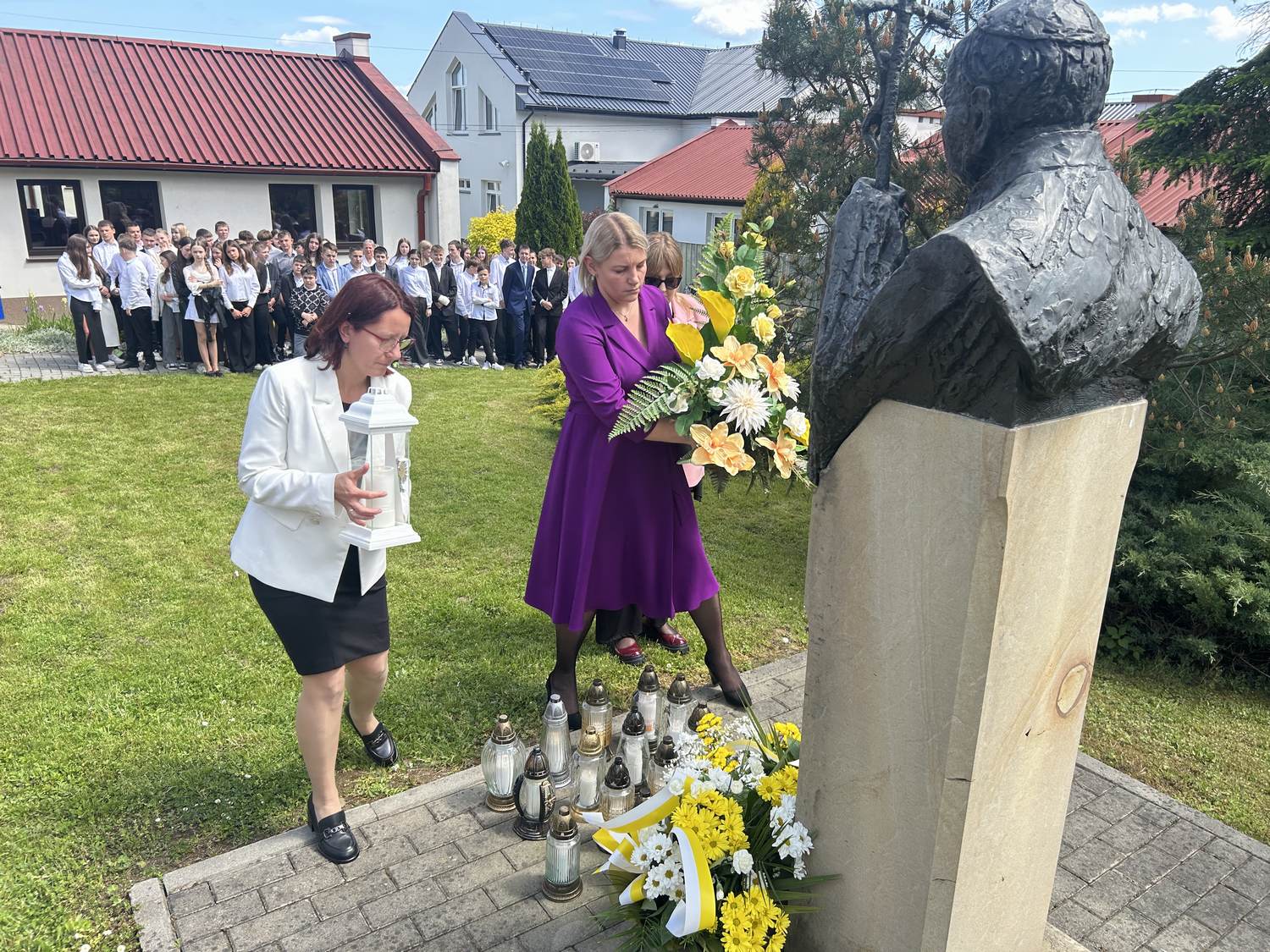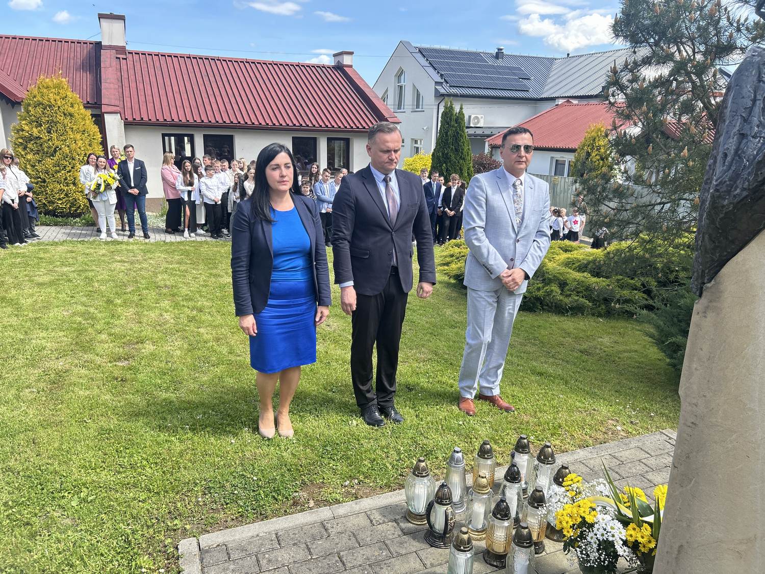 Pod pomnikiem Jana Pawła II znajdującym się na dziedzińcu szkolnym złożono kwiaty i zapalono znicze – jako wyraz pamięci i wdzięczności dla Patrona szkoły. Modlitwę poprowadził ks. Radosław Bobek. Na zakończenie uroczystości Dyrektor Szkoły Dorota Juszczyk, w okolicznościowym przemówieniu podziękowała wszystkim za obecność i wspólne uczczenie tej ważnej dla Szkoły rocznicy.