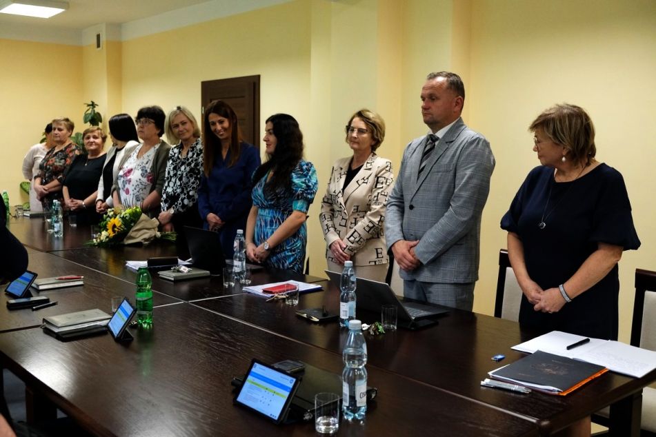 Po powitaniu wszystkich gości Przewodniczący Rady Gminy Grzegorz Gołąb zwrócił się szczególnie do Dyrektorów, którzy zostali wyłonieni w przeprowadzonych w niedawnym czasie konkursach: Dyrektor Przedszkola w Żegocinie Ewy Paruch i Dyrektor Szkoły Podstawowej w Rozdzielu Katarzyny Cudejko. Złożył życzenia sukcesów w pracy, wręczając symboliczny bukiet kwiatów. W związku ze zbliżającym się Dniem Edukacji Narodowej, życzenia oraz kwiaty otrzymali także pozostali obecni Dyrektorzy. Przewodniczący podziękował za trud i poświęcenie w minionym roku i życzył wielu sukcesów i zadowolenia w rozpoczętym właśnie nowym roku szkolnym. Głos zabrała Dyrektor SP w Żegocinie Anna Rogala dziękując za ciepłe słowa.