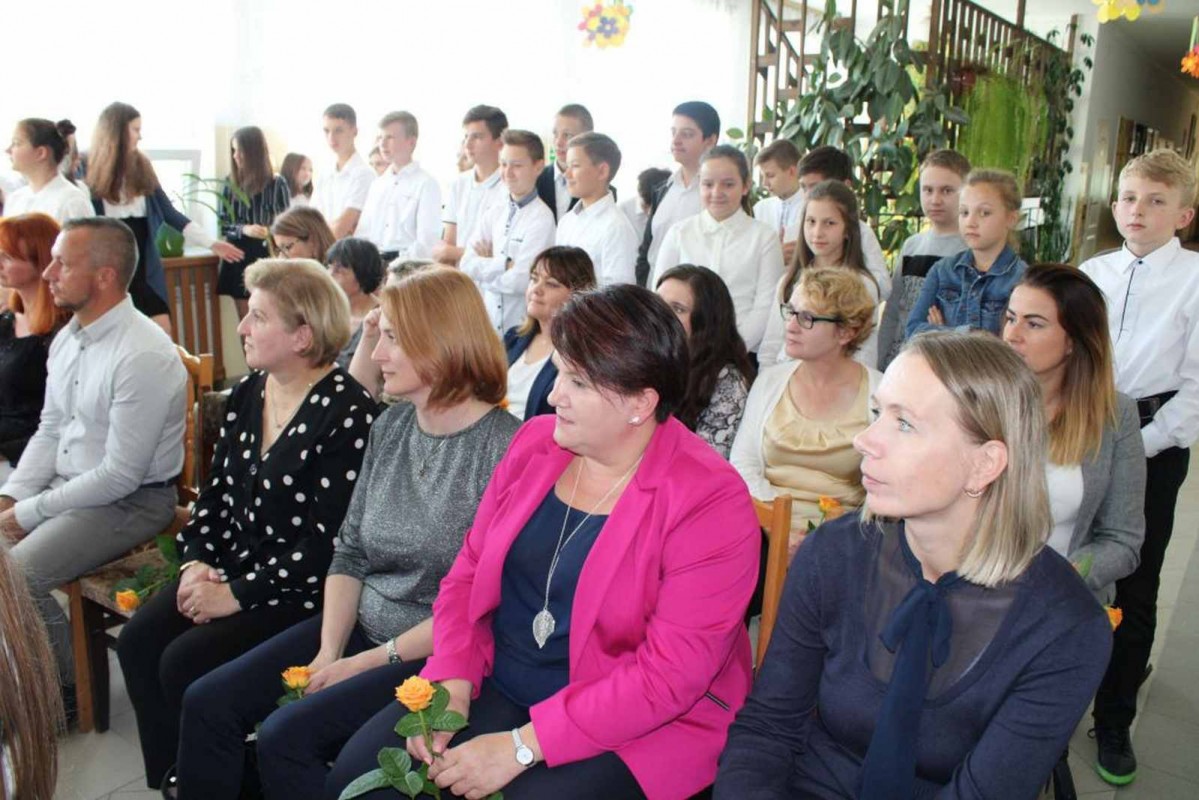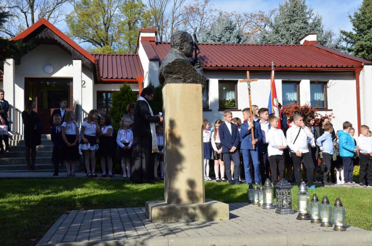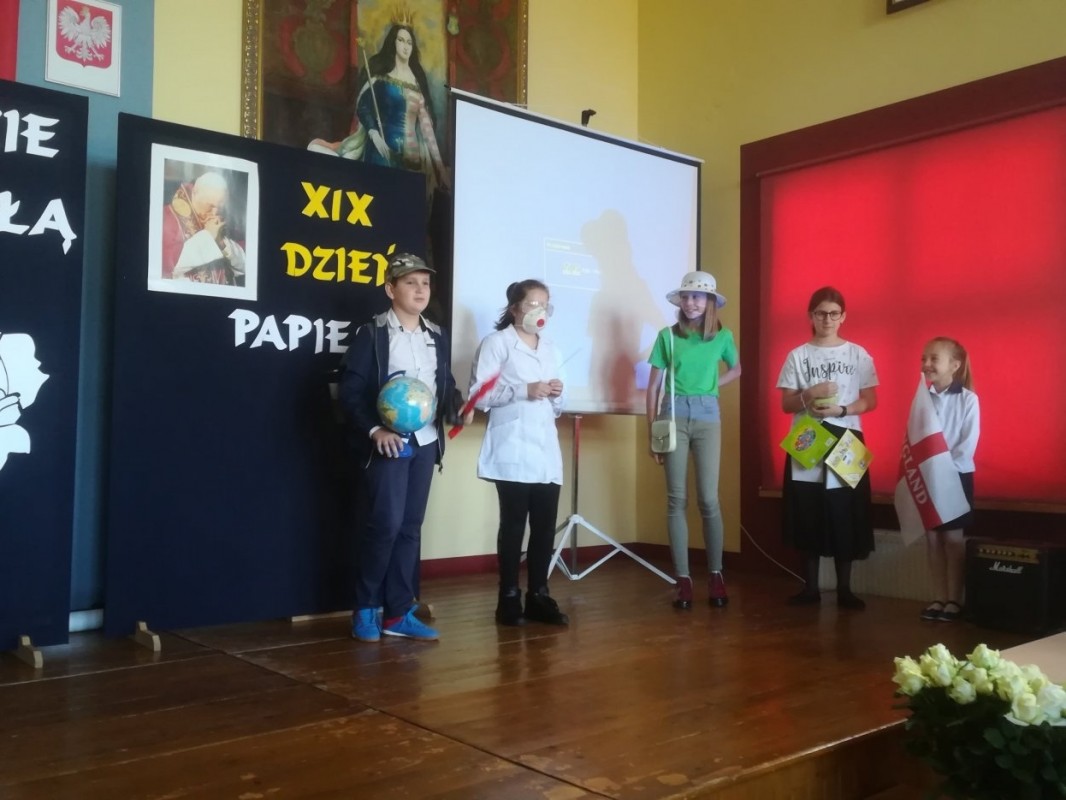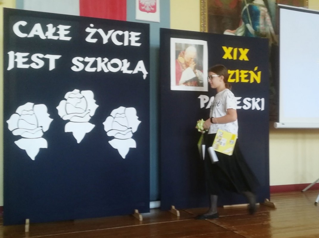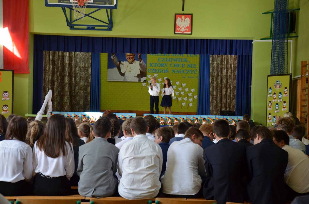 Z kolei 15 października. uczniowie szkoły podstawowej przygotowali uroczystą akademię z okazji XIX Dnia Papieskiego i Dnia Edukacji Narodowej pod kierunkiem Pań: Bożeny Banaś, Anny Maurer – Pasionek i Wiesława Wolaka. W pierwszej części wspominano Pontyfikat Jana Pawła II i odśpiewano jego ulubioną piosenkę oazową „Barkę”. Druga część akademii poświęcona była pracy nauczycieli i pracowników administracji i obsługi szkoły. Uczniowie przygotowali pełną humoru prezentację strojów dla poszczególnych nauczycieli. Przewodnicząca Rady Rodziców – Pani Agnieszka Zbyrowska złożyła wszystkim nauczycielom życzenia oraz na ręce Pani Dyrektor wręczyła kwiaty. Uczniowie przekazali dla nauczycieli prezent –niespodziankę, który będzie służył wszystkim w pokoju nauczycielskim. Na zakończenie Pani Dyrektor podziękowała wszystkim uczniom i rodzicom za życzenia.