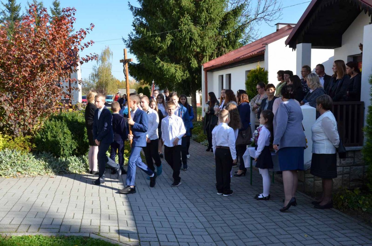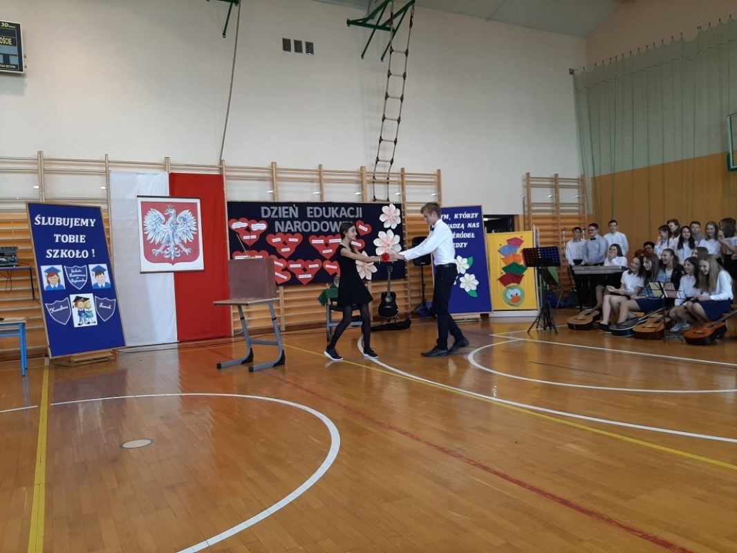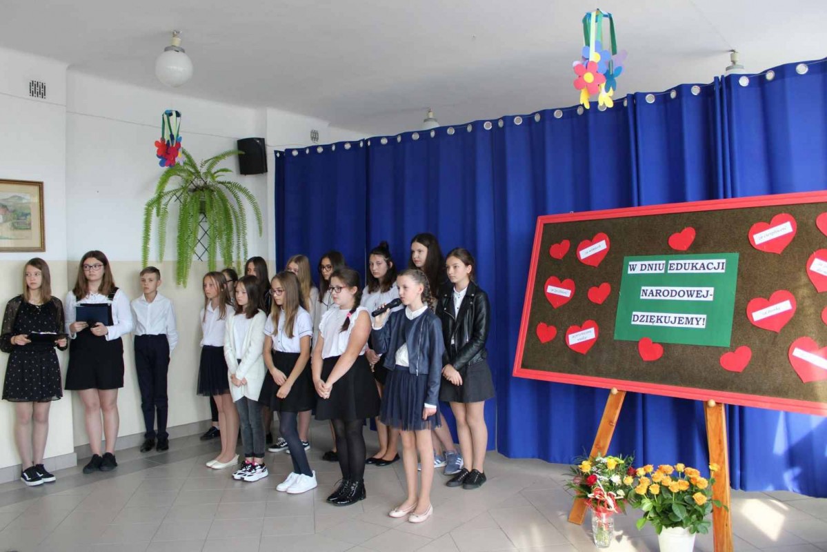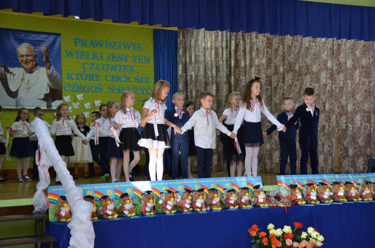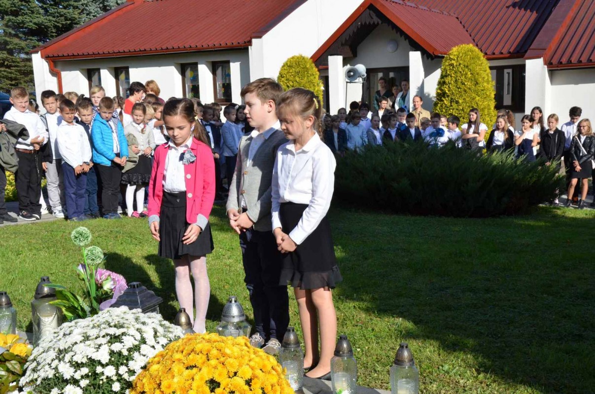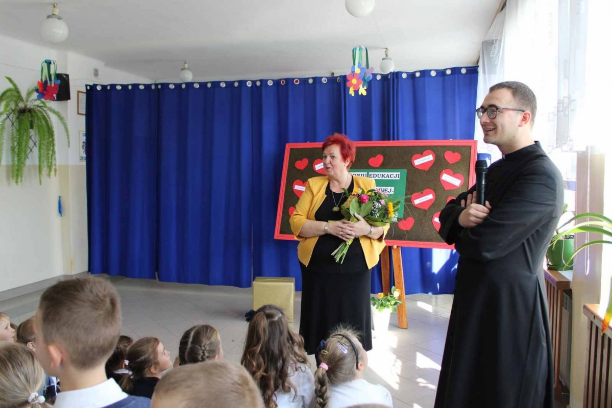 Z kolei 15 października. uczniowie szkoły podstawowej przygotowali uroczystą akademię z okazji XIX Dnia Papieskiego i Dnia Edukacji Narodowej pod kierunkiem Pań: Bożeny Banaś, Anny Maurer – Pasionek i Wiesława Wolaka. W pierwszej części wspominano Pontyfikat Jana Pawła II i odśpiewano jego ulubioną piosenkę oazową „Barkę”. Druga część akademii poświęcona była pracy nauczycieli i pracowników administracji i obsługi szkoły. Uczniowie przygotowali pełną humoru prezentację strojów dla poszczególnych nauczycieli. Przewodnicząca Rady Rodziców – Pani Agnieszka Zbyrowska złożyła wszystkim nauczycielom życzenia oraz na ręce Pani Dyrektor wręczyła kwiaty. Uczniowie przekazali dla nauczycieli prezent –niespodziankę, który będzie służył wszystkim w pokoju nauczycielskim. Na zakończenie Pani Dyrektor podziękowała wszystkim uczniom i rodzicom za życzenia.