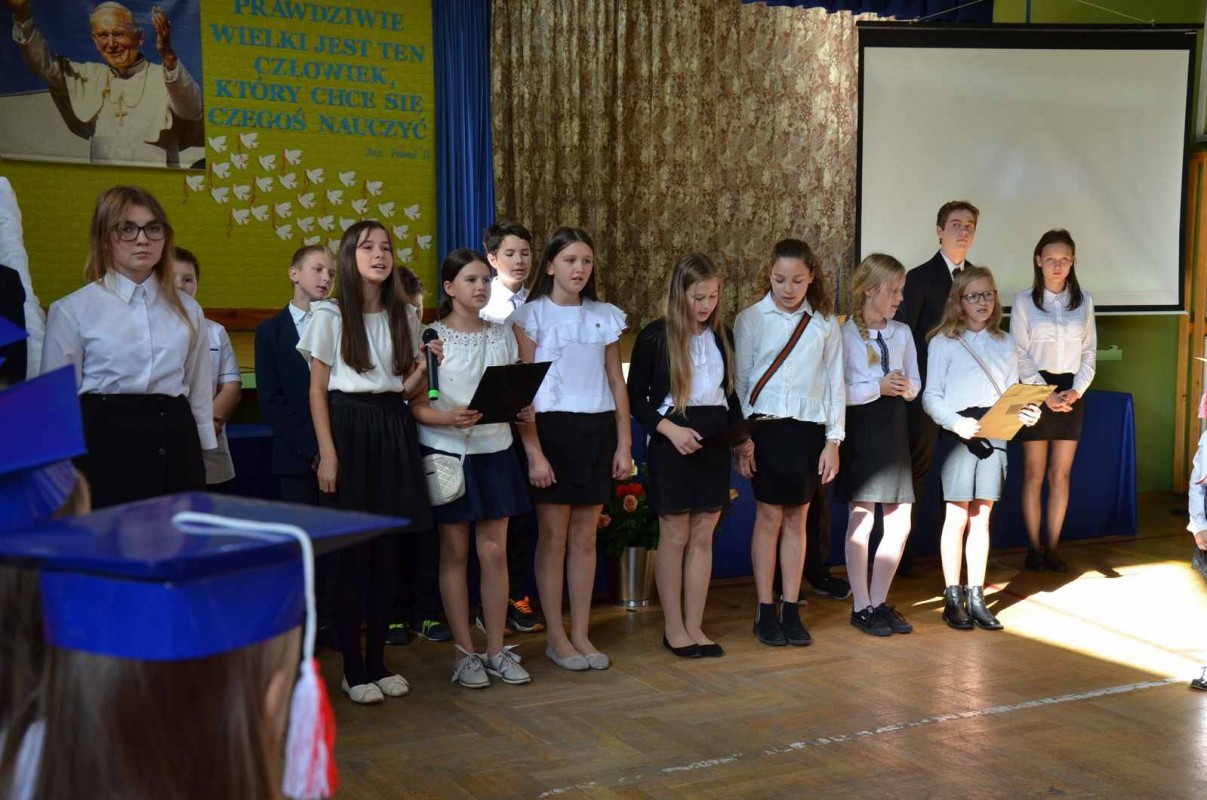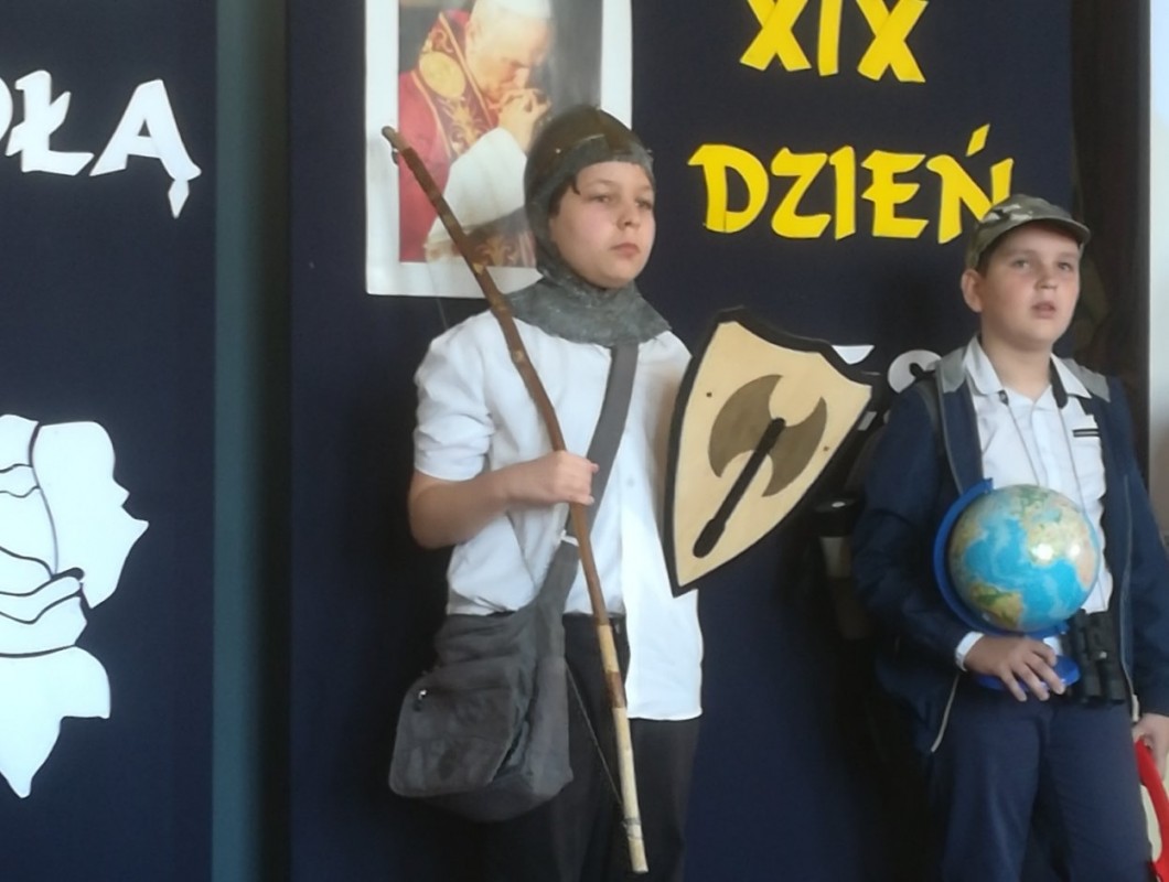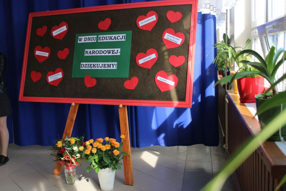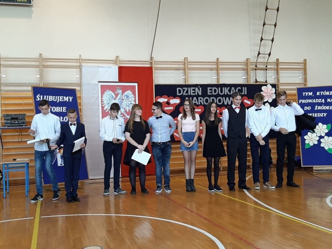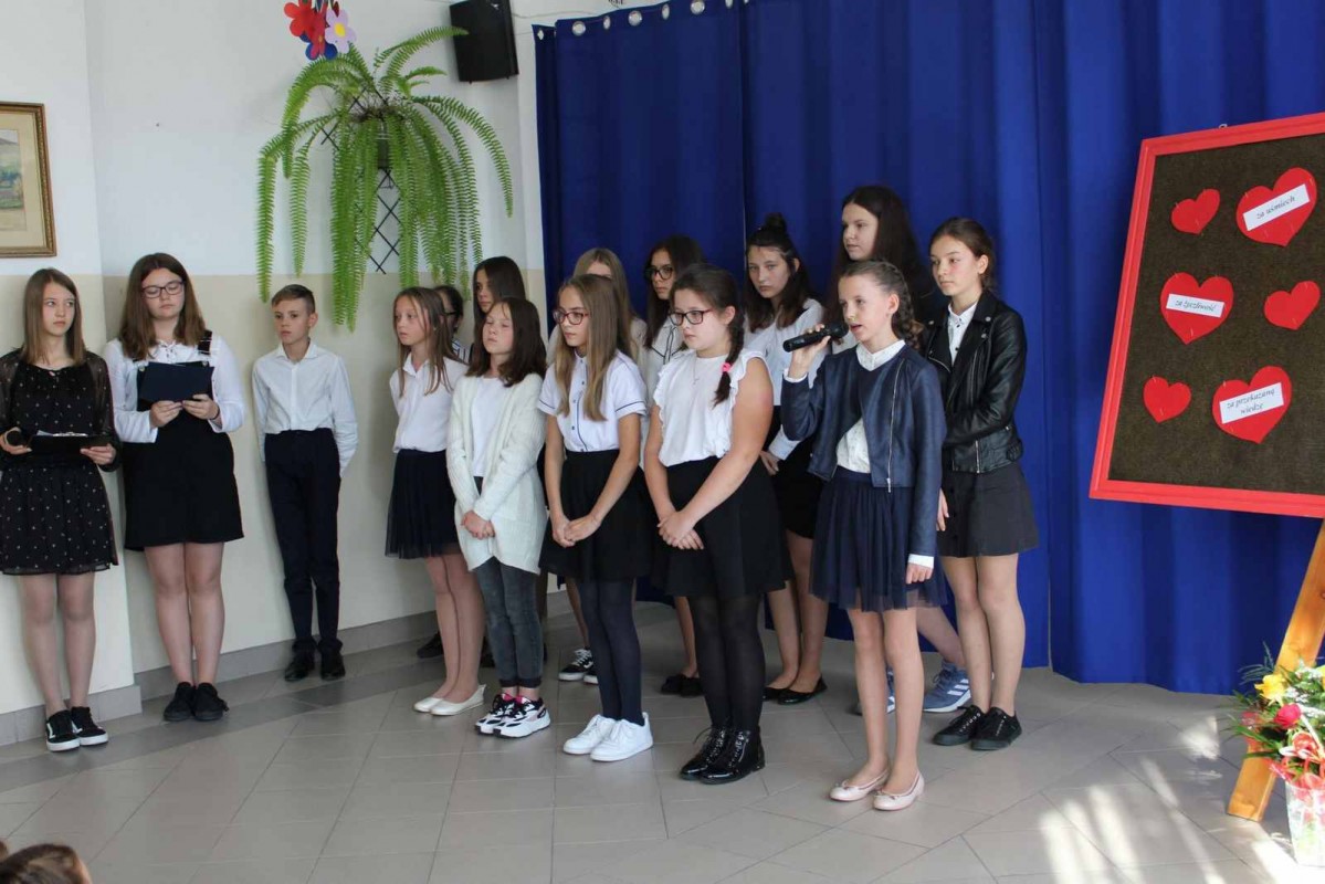 Z kolei 15 października. uczniowie szkoły podstawowej przygotowali uroczystą akademię z okazji XIX Dnia Papieskiego i Dnia Edukacji Narodowej pod kierunkiem Pań: Bożeny Banaś, Anny Maurer – Pasionek i Wiesława Wolaka. W pierwszej części wspominano Pontyfikat Jana Pawła II i odśpiewano jego ulubioną piosenkę oazową „Barkę”. Druga część akademii poświęcona była pracy nauczycieli i pracowników administracji i obsługi szkoły. Uczniowie przygotowali pełną humoru prezentację strojów dla poszczególnych nauczycieli. Przewodnicząca Rady Rodziców – Pani Agnieszka Zbyrowska złożyła wszystkim nauczycielom życzenia oraz na ręce Pani Dyrektor wręczyła kwiaty. Uczniowie przekazali dla nauczycieli prezent –niespodziankę, który będzie służył wszystkim w pokoju nauczycielskim. Na zakończenie Pani Dyrektor podziękowała wszystkim uczniom i rodzicom za życzenia.