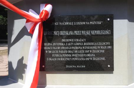 Jesienią 2017 roku strażacy Gminy Żegocina zdecydowali uszkodzoną i nadgryzioną zębem czasu ceramiczną Figurę Św. Floriana zamienić na nową. 26 maja 2018 roku odbyła się ceremonia poświęcenia nowej figury. Na początku lipca2018 roku poprzednią figurę przeniesiono do Izby Regionalnej prowadzonej przez Stowarzyszenie Przyjaciół Ziemi Żegocińskiej im. Czesława Blajdy. Odnowiona stoi w kąciku strażackim.