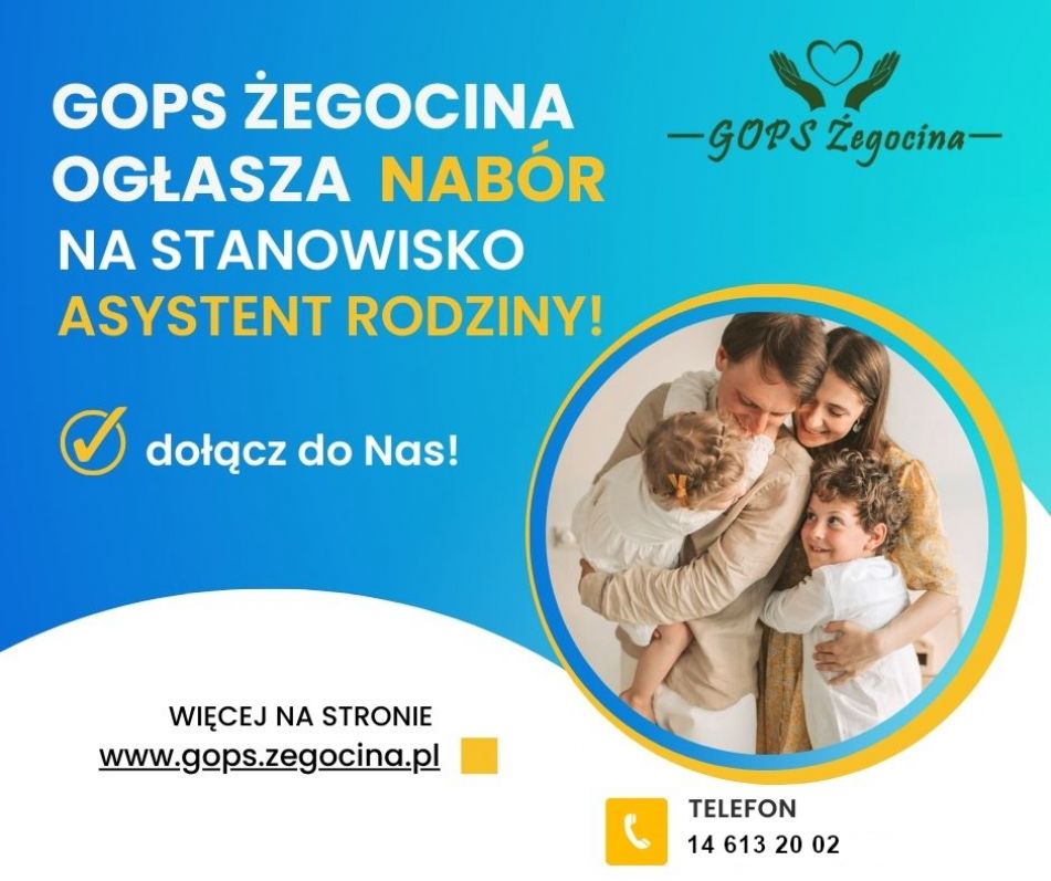 Kierownik Gminnego Ośrodka Pomocy Społecznej w Żegocinie ogłasza nabór na stanowisko " Asystent rodziny"