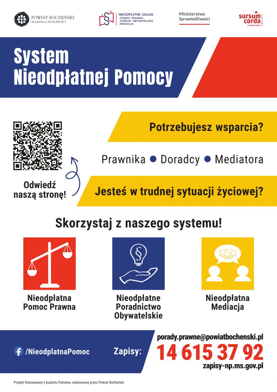 Szukasz pomocy lub wsparcia prawnego w trudnej sprawie? Nie stać Cię na skorzystanie z usług kancelarii prawnej i nie masz się do kogo zwrócić o pomoc? Zapraszamy do korzystania z punktów nieodpłatnej pomocy prawnej i poradnictwa obywatelskiego na terenie Powiatu Bocheńskiego.
