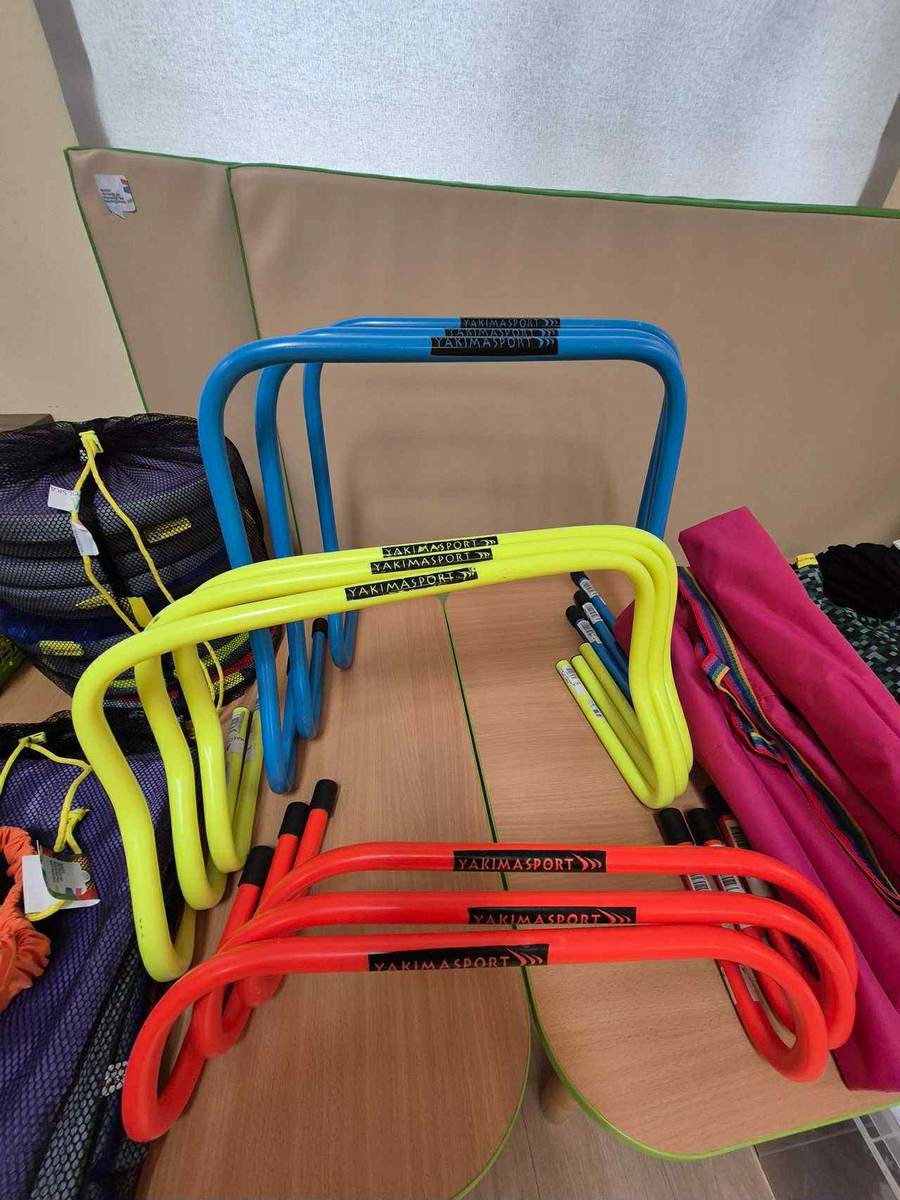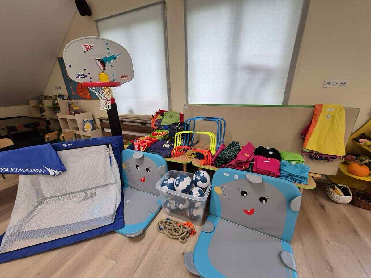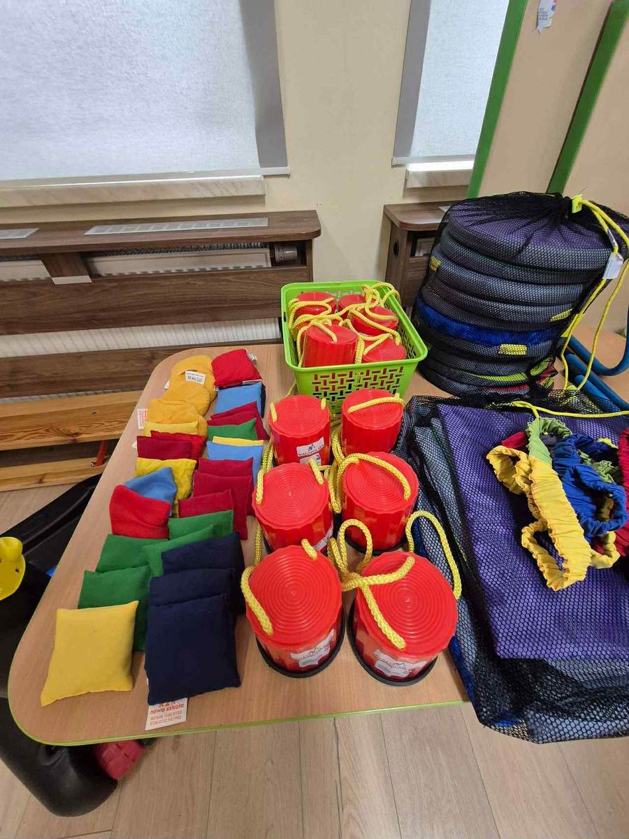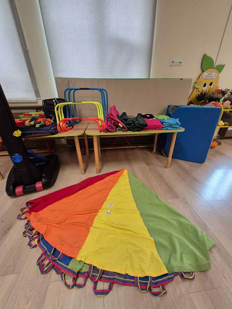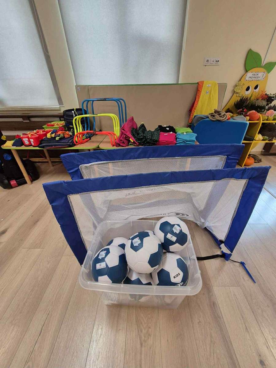 Wśród zakupionych materiałów znajdują się materace - 4 sztuki, sensoryczny tor przeszkód - 1 zestaw, bramki do piłki nożnej - 2 sztuki, piłki do gry na sali - 10 sztuk, mobilny kosz do gry w koszykówkę - 1 sztuka, płotki treningowe - 8 sztuk, worki do skakania - 8 sztuk, lina do przeciągania - 1 sztuka, woreczki gimnastyczne - 20 sztuk, mini szczudła sensoryczne - 6 sztuk, koszulki do gier zespołowych - 40 sztuk, chusta animacyjna - 1 sztuka. Koszt zakupionego sprzętu wynosi 9.000 zł.