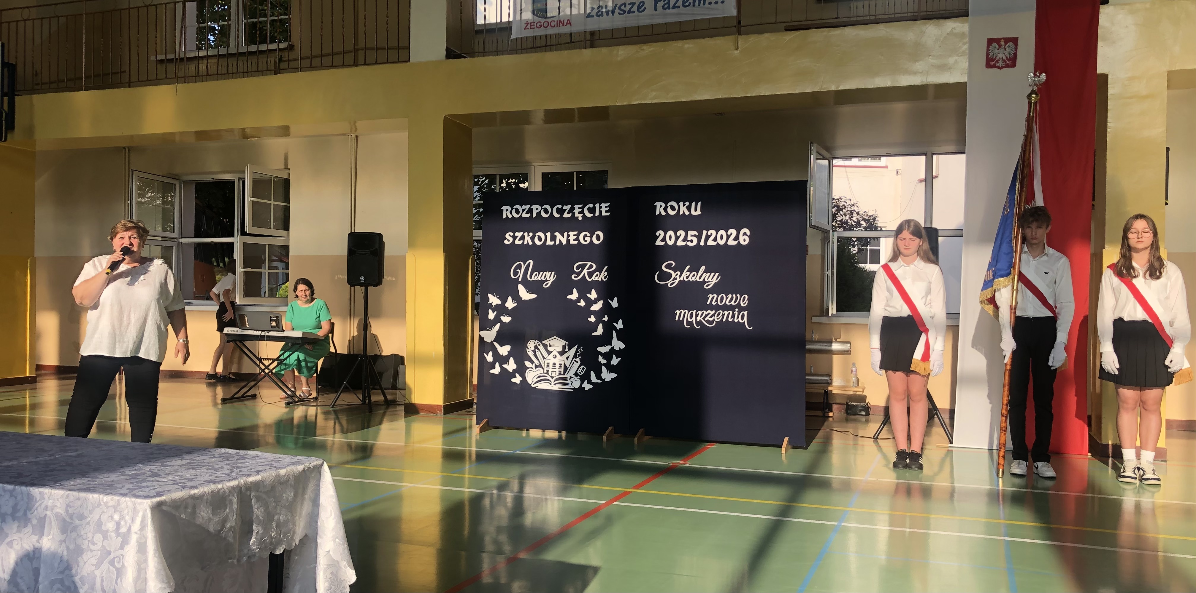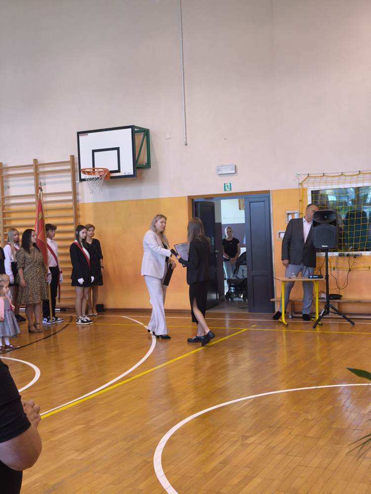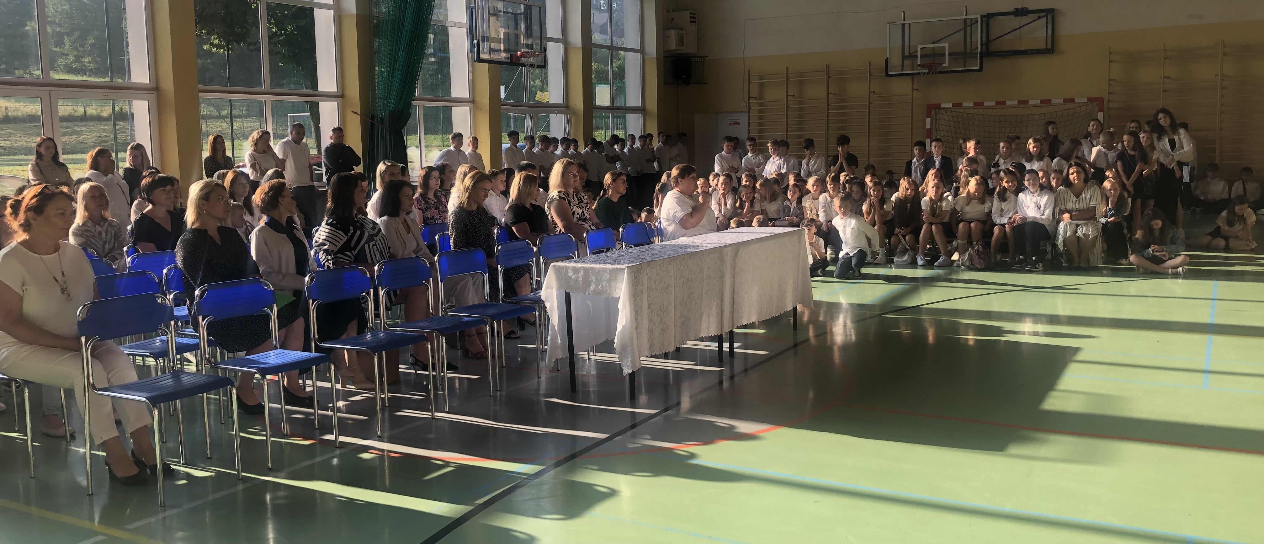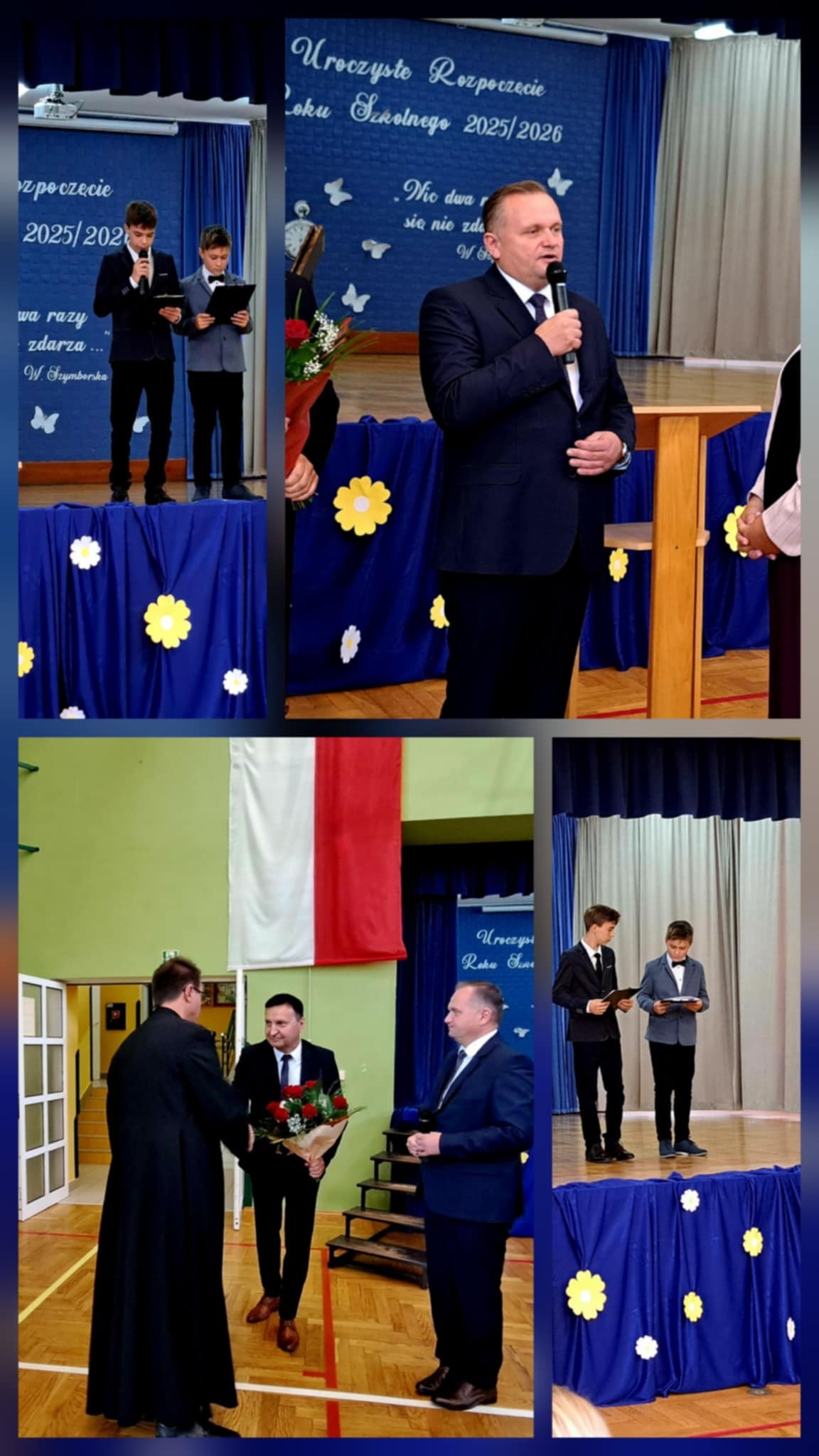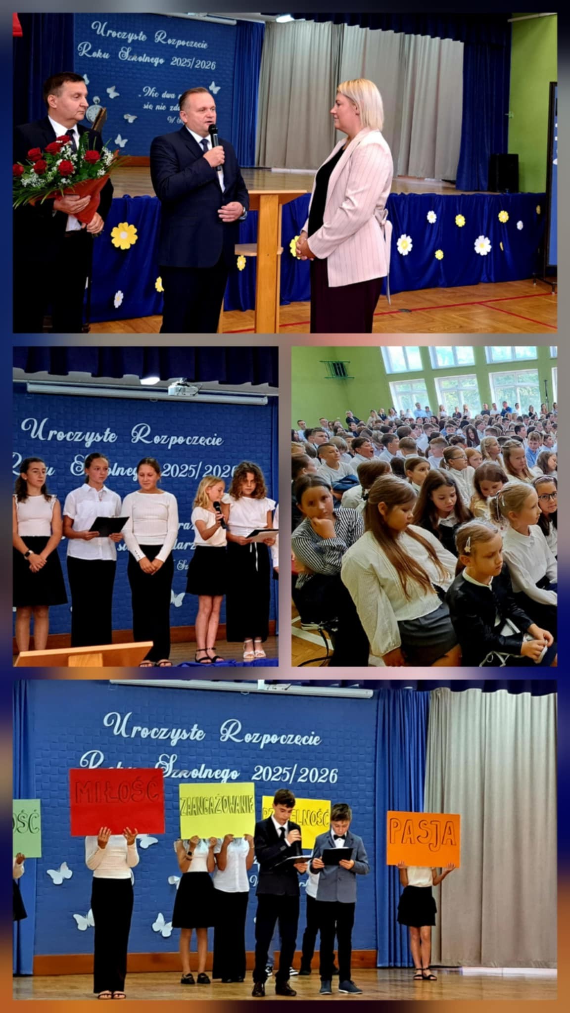Uroczystość rozpoczęła się od wprowadzenia sztandaru szkoły i odśpiewania hymnu państwowego. Wójt Gminy powitał nową dyrektor szkoły, Panią Joannę Dunikowską, której gratulacje złożyli także przedstawiciele Samorządu Uczniowskiego i Rady Rodziców.