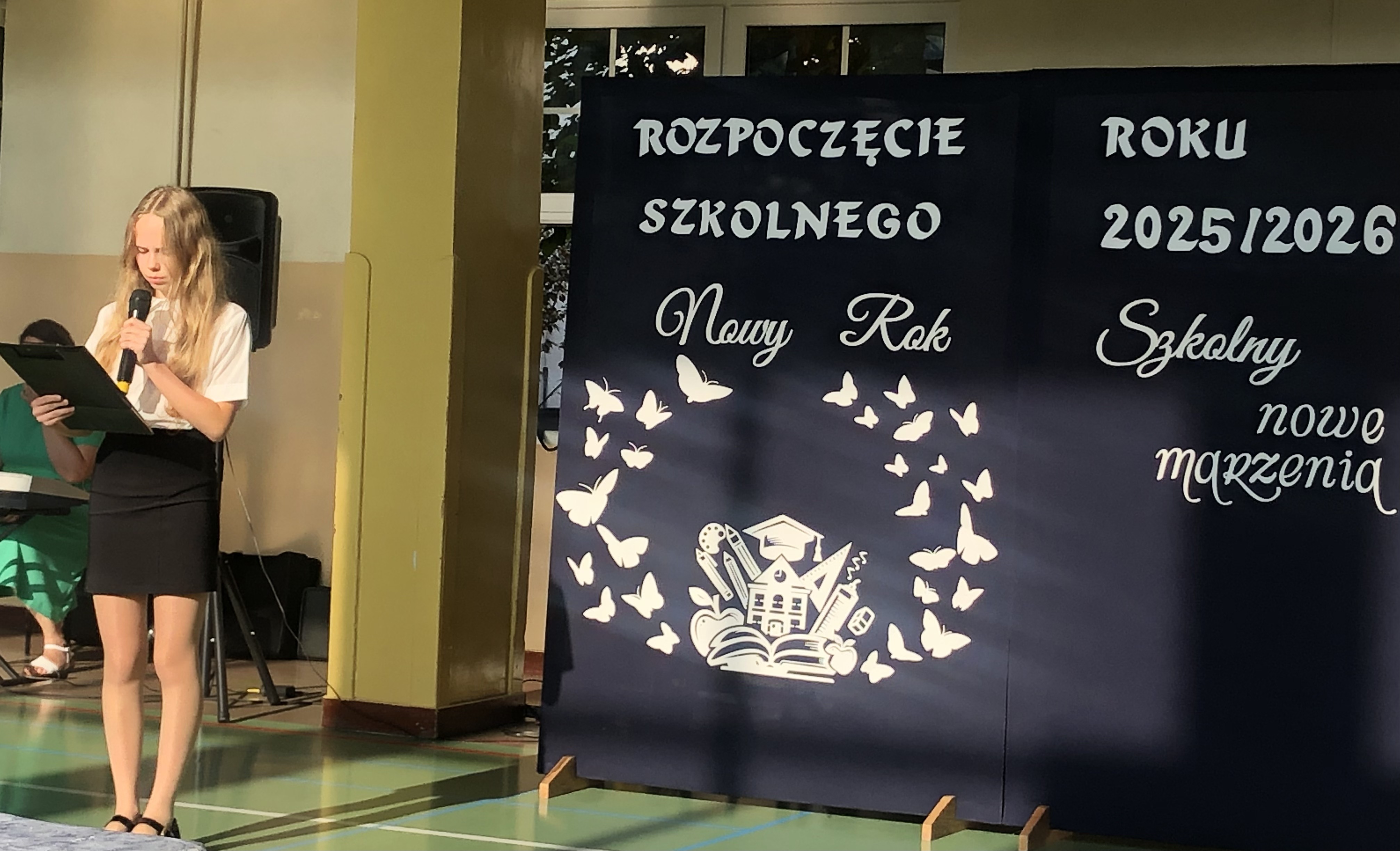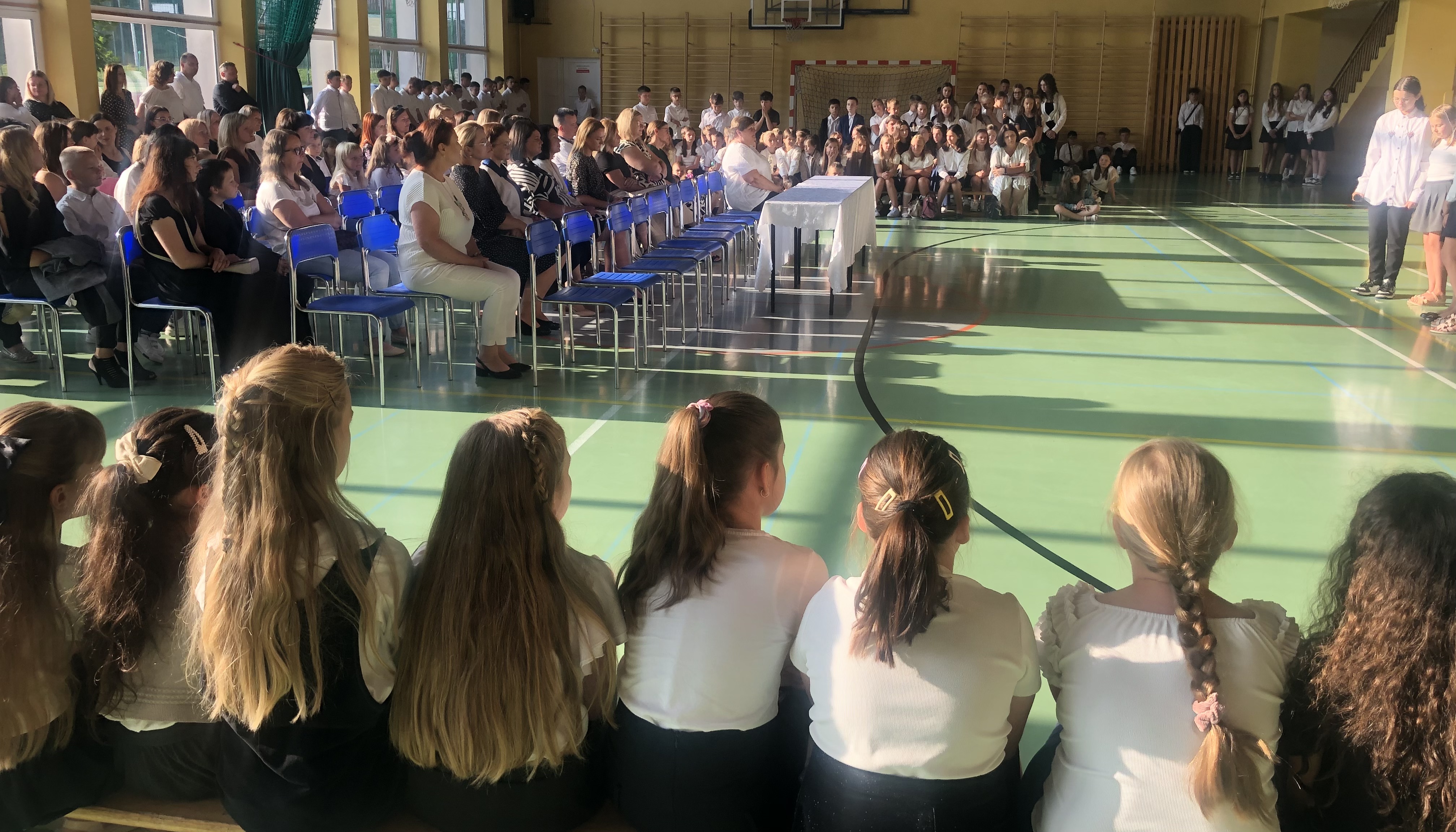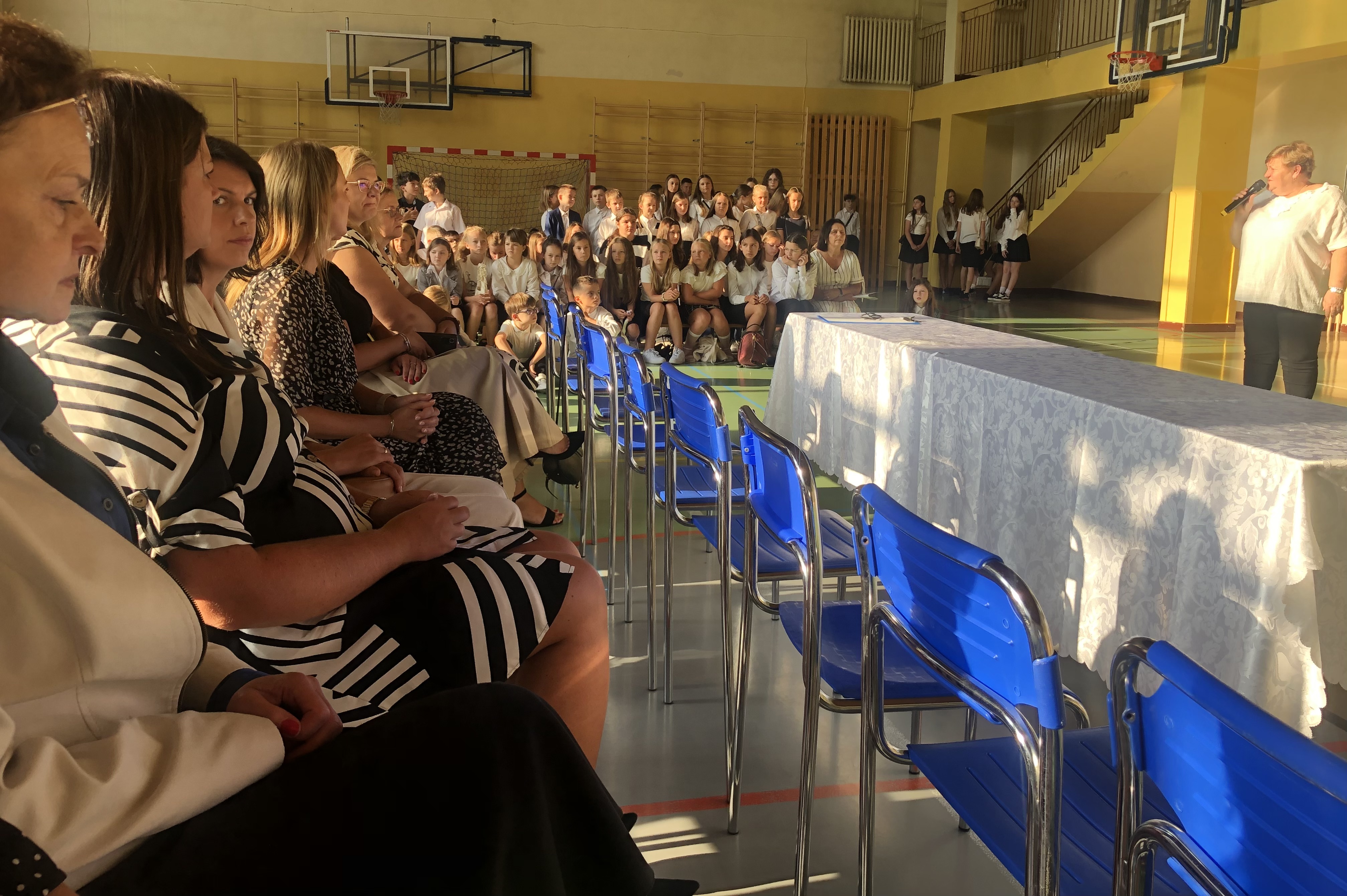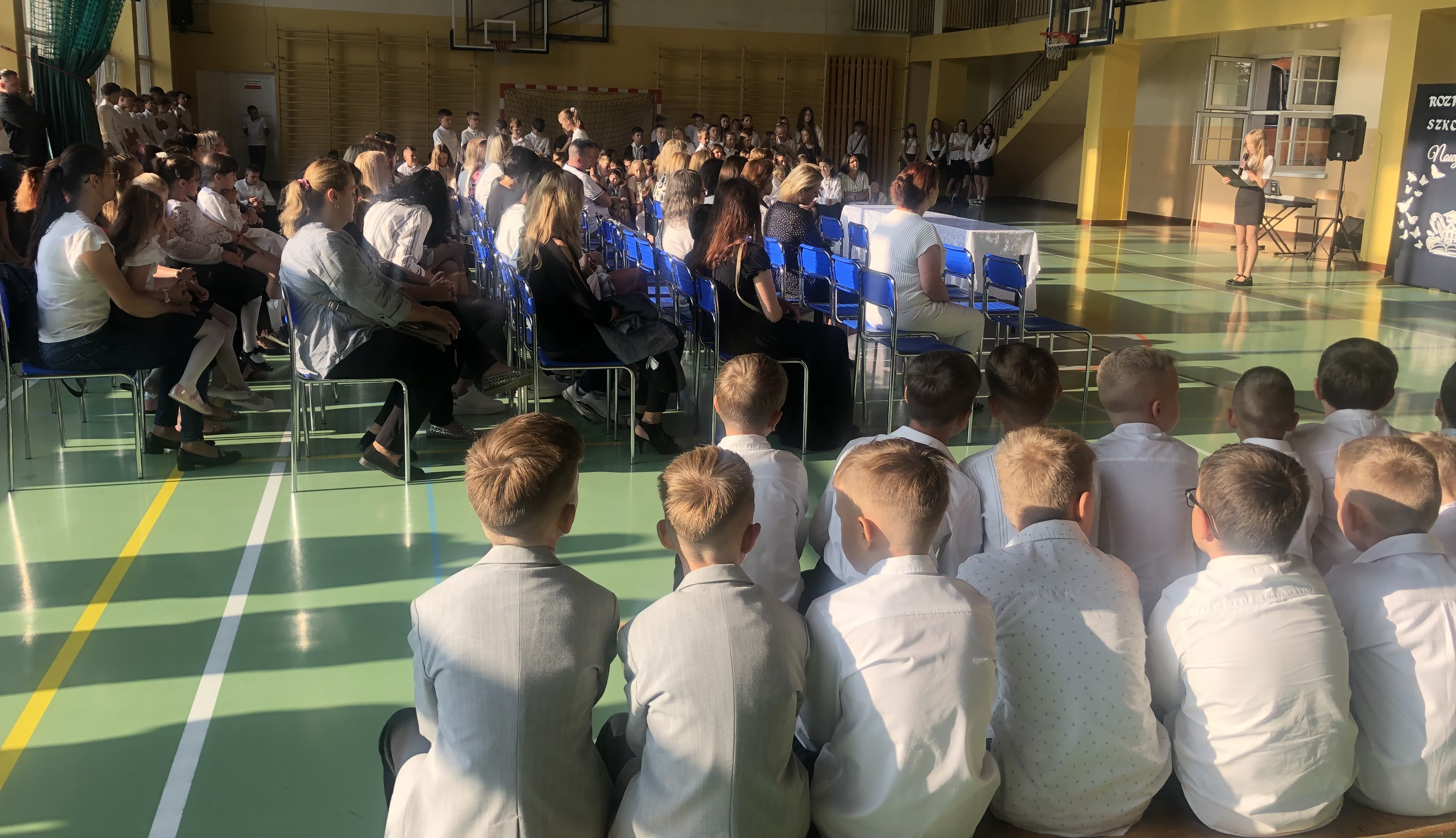 Uroczystość rozpoczęła się od wprowadzenia sztandaru szkoły i odśpiewania hymnu państwowego. Wójt Gminy powitał nową dyrektor szkoły, Panią Joannę Dunikowską, której gratulacje złożyli także przedstawiciele Samorządu Uczniowskiego i Rady Rodziców.