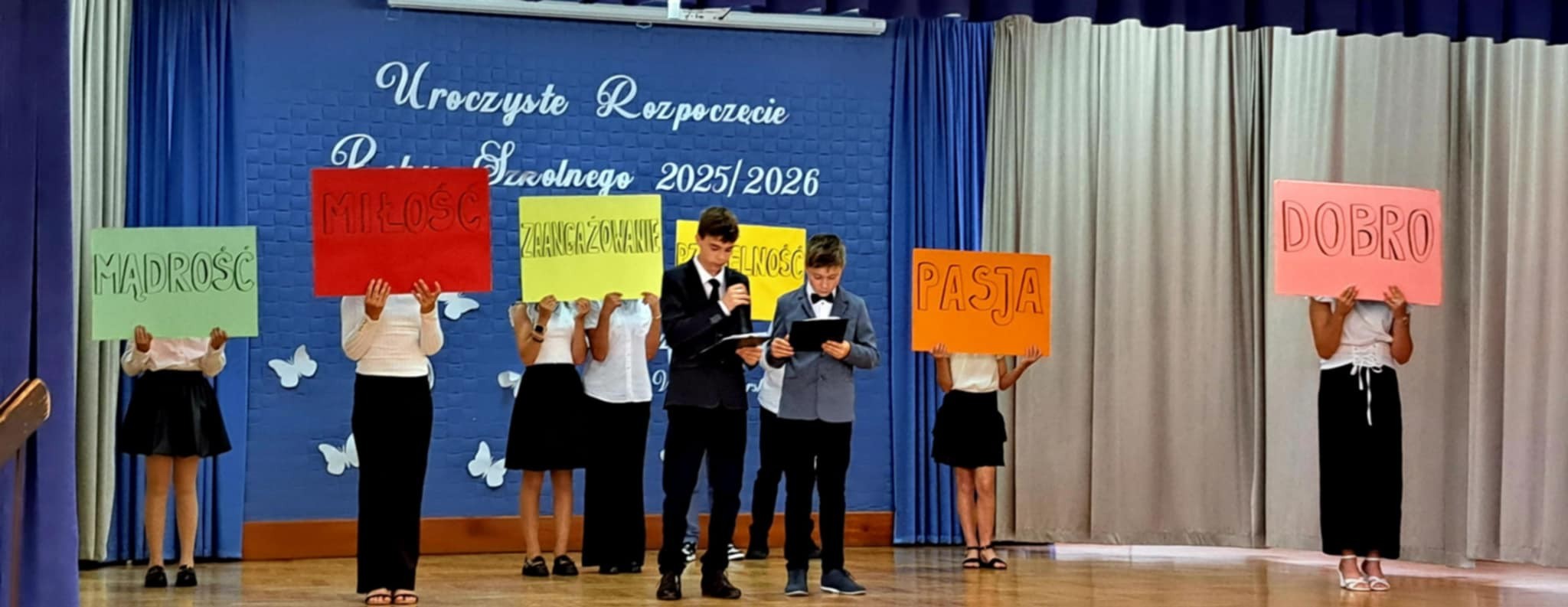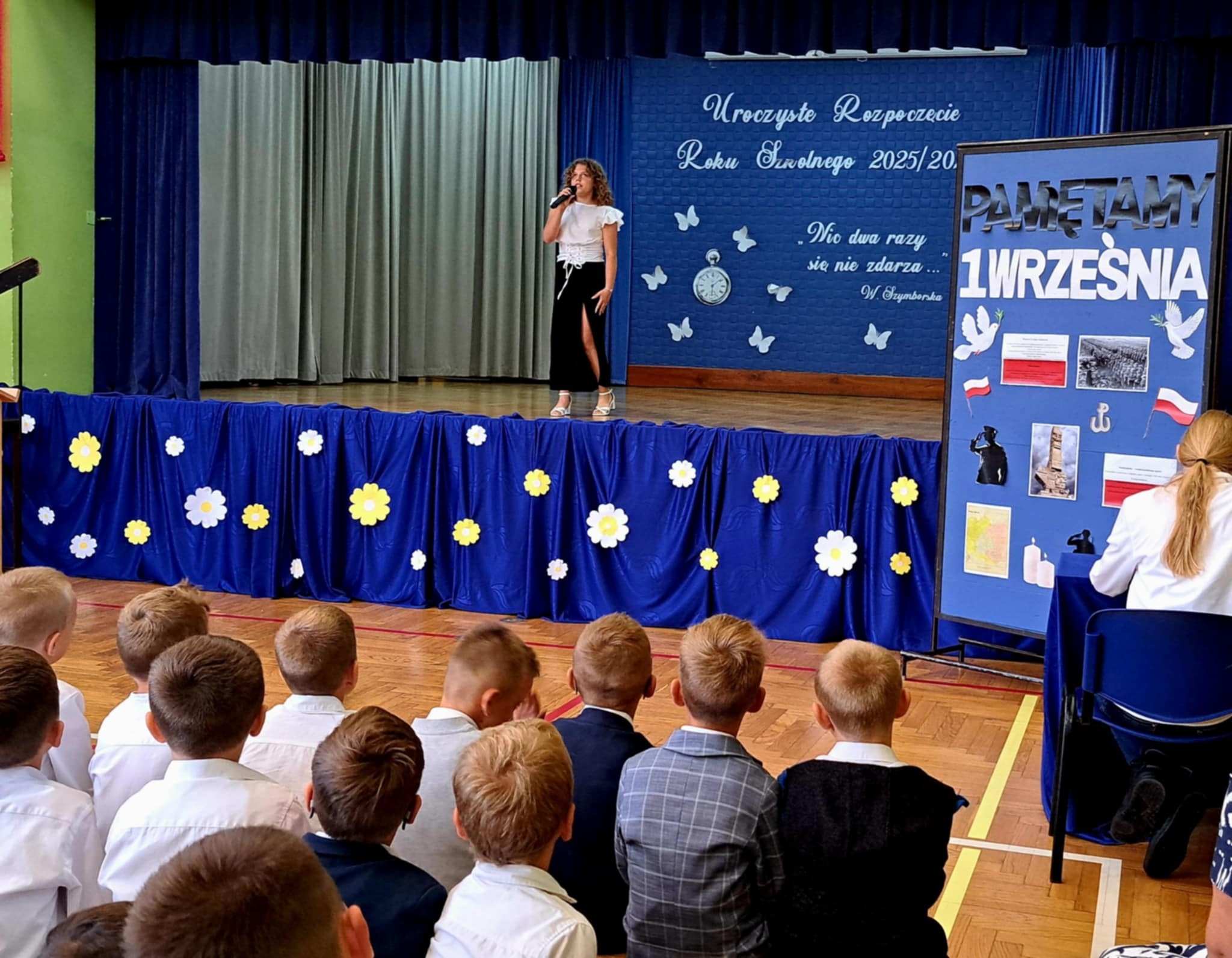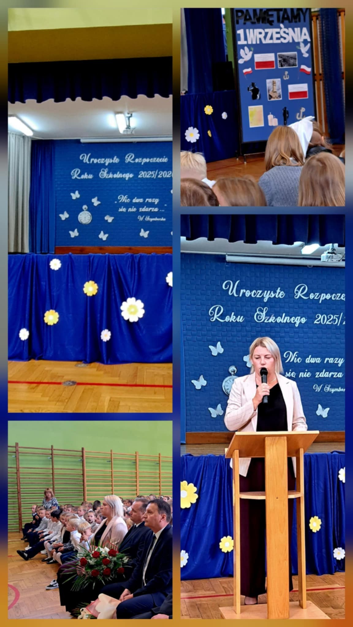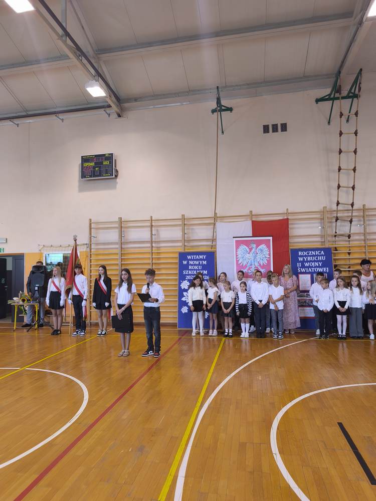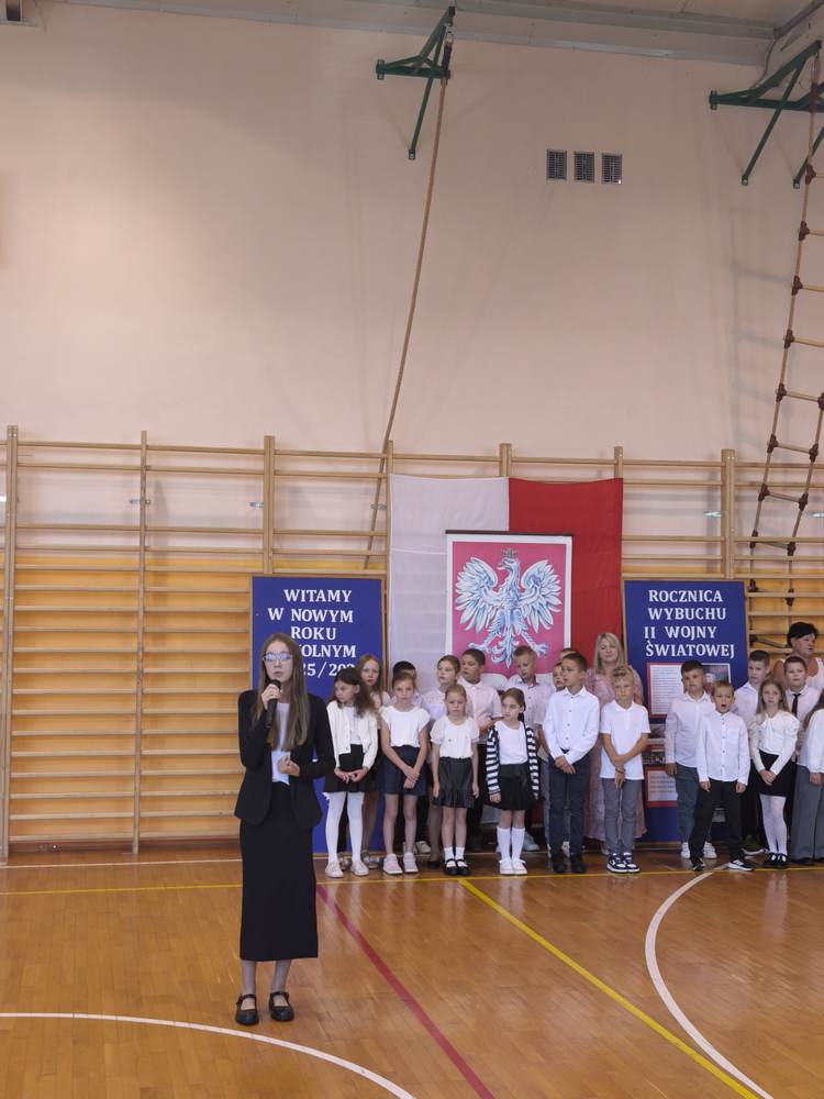 Pani Dyrektor przedstawiła wychowawców klas i życzyła wszystkim sukcesów w nowym roku szkolnym. Uczniowie klasy VII przypomnieli o rocznicy wybuchu II wojny światowej, a zebrani uczcili minutą ciszy pamięć poległych za Ojczyznę.Po akademii uczniowie spotkali się z wychowawcami, a następnie uczestniczyli w uroczystej Mszy Świętej w kościele parafialnym.