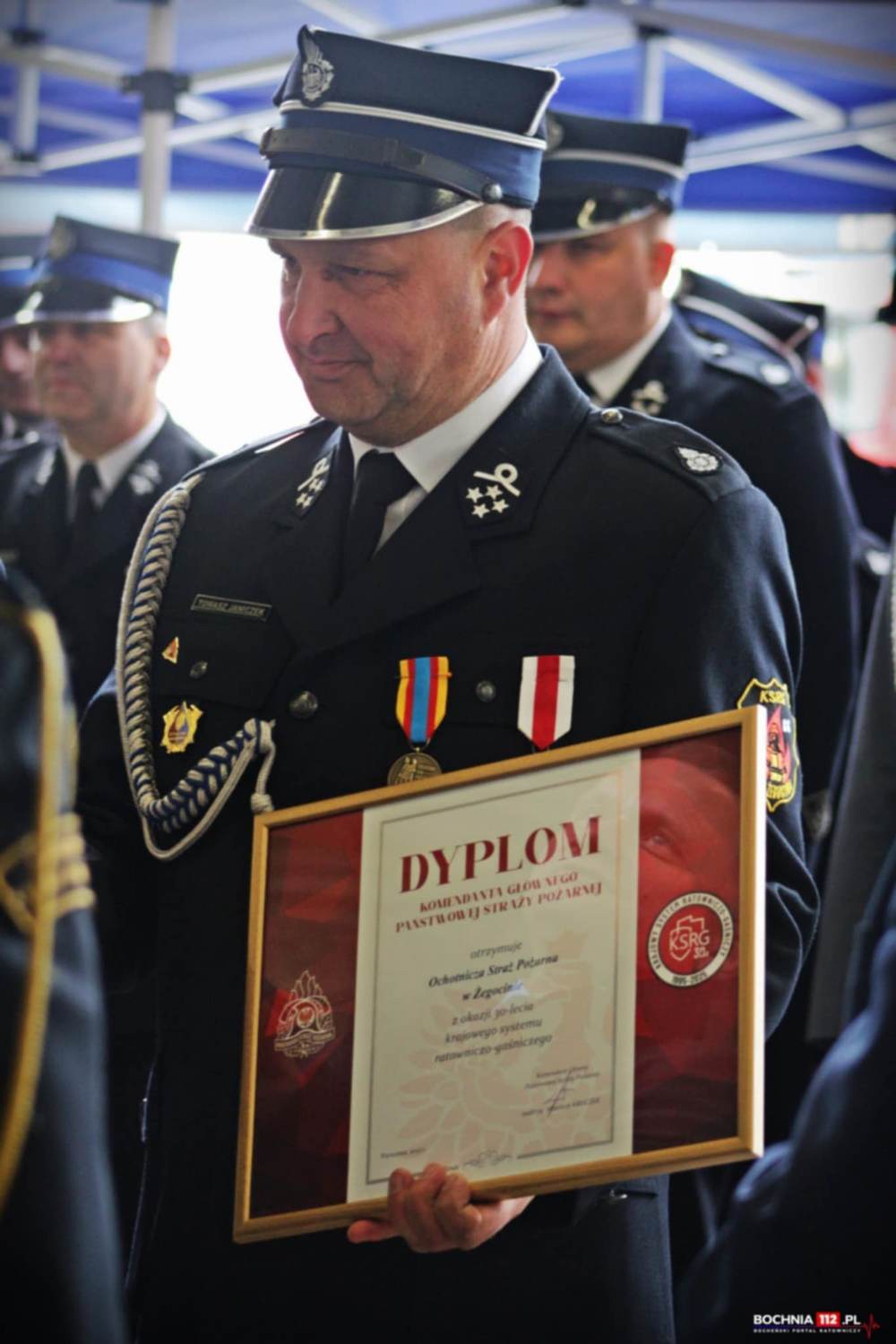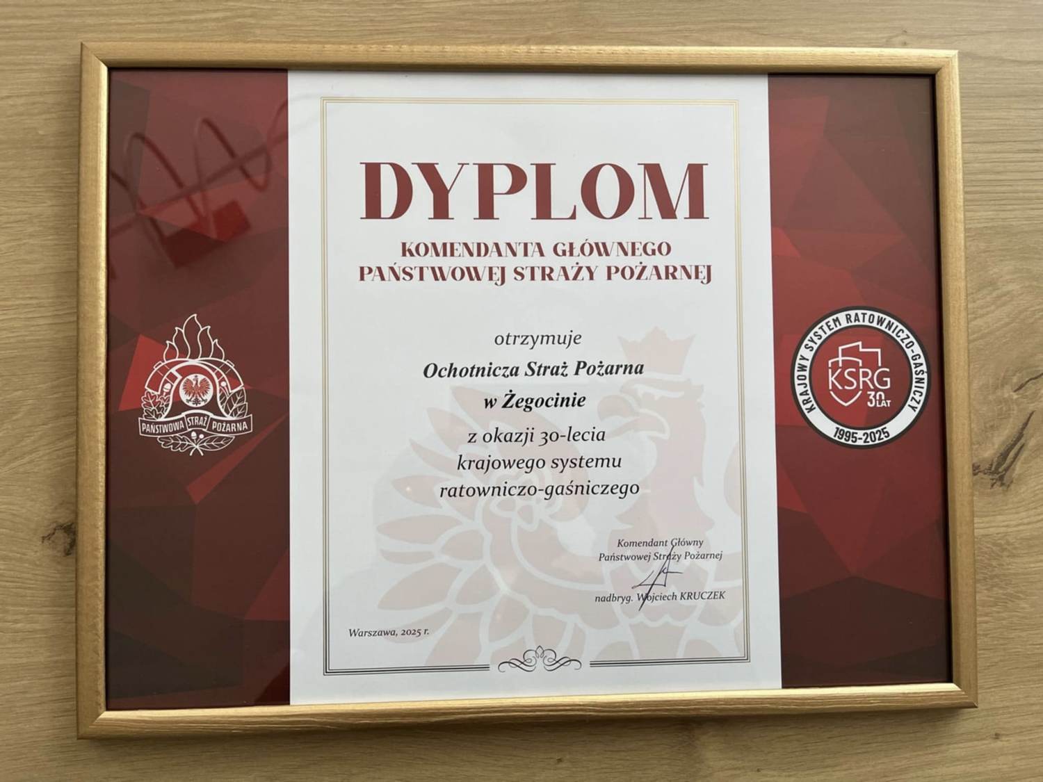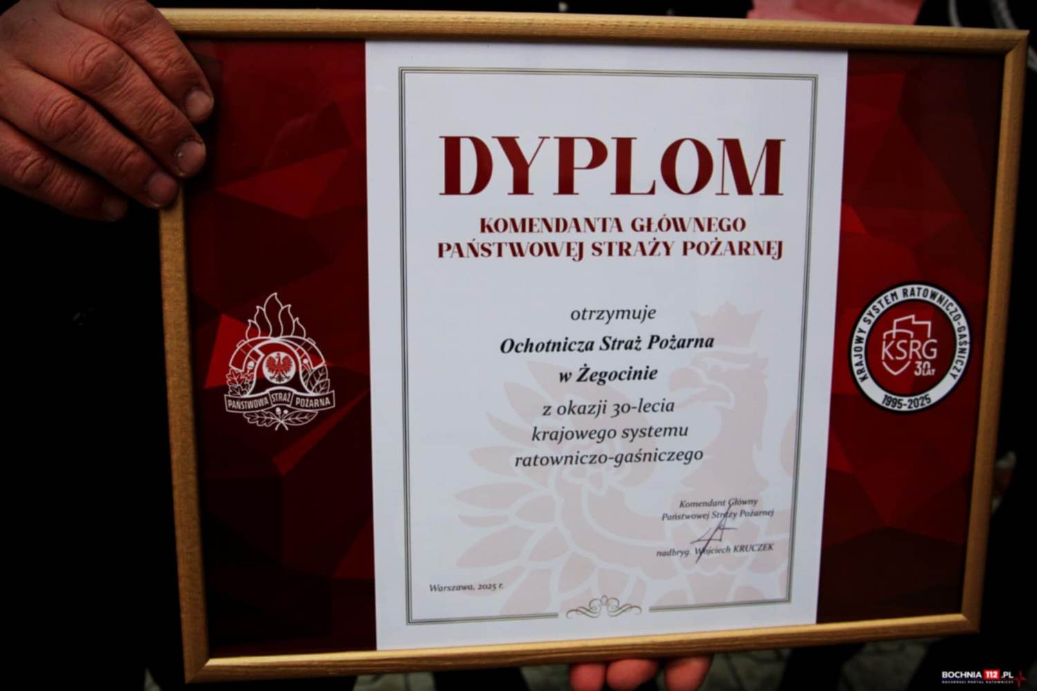 Prezes OSP Żegocina Tomasz Janiczek oraz Komendant Gminny druh Janusz Stańdo odebrali pamiątkowe dyplomy Komendanta Głównego PSP z okazji 30-lecia Krajowego Systemu Ratowniczo-Gaśniczego, będące wyrazem uznania za zaangażowanie w rozwój i funkcjonowanie systemu.