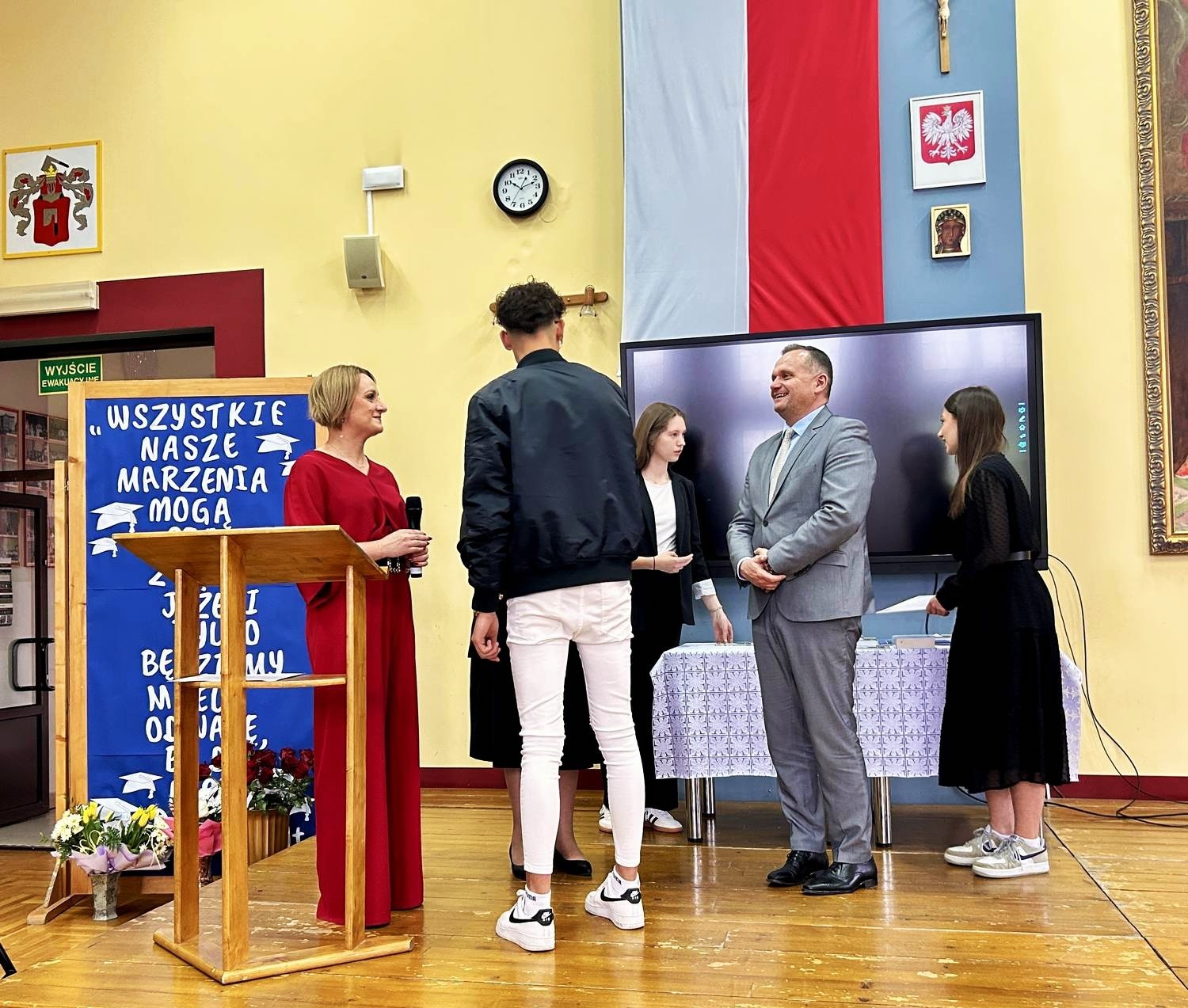 Po oficjalnych przemówieniach rozdane zostały Listy gratulacyjne Dyrektora Szkoły, Rady Pedagogicznej oraz Wychowawcy Klasy, a następnie Uczniowie otrzymali świadectwa ukończenia Szkoły oraz liczne nagrody ufundowane przez Radę Rodziców oraz Samorząd Uczniowski. Głos zabrał również przedstawiciel Akademii WSB, który wręczył Złoty Indeks Mateuszowi Moćko.