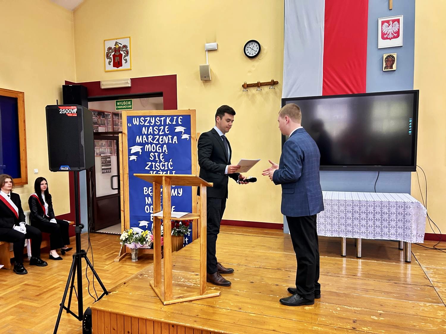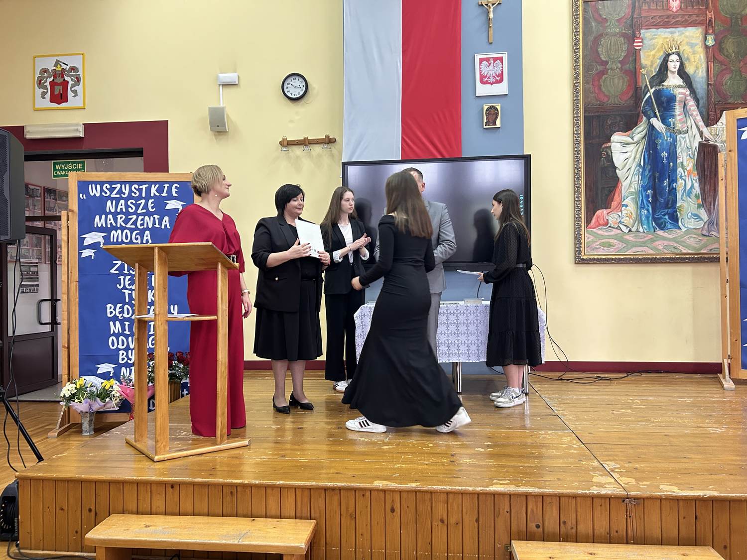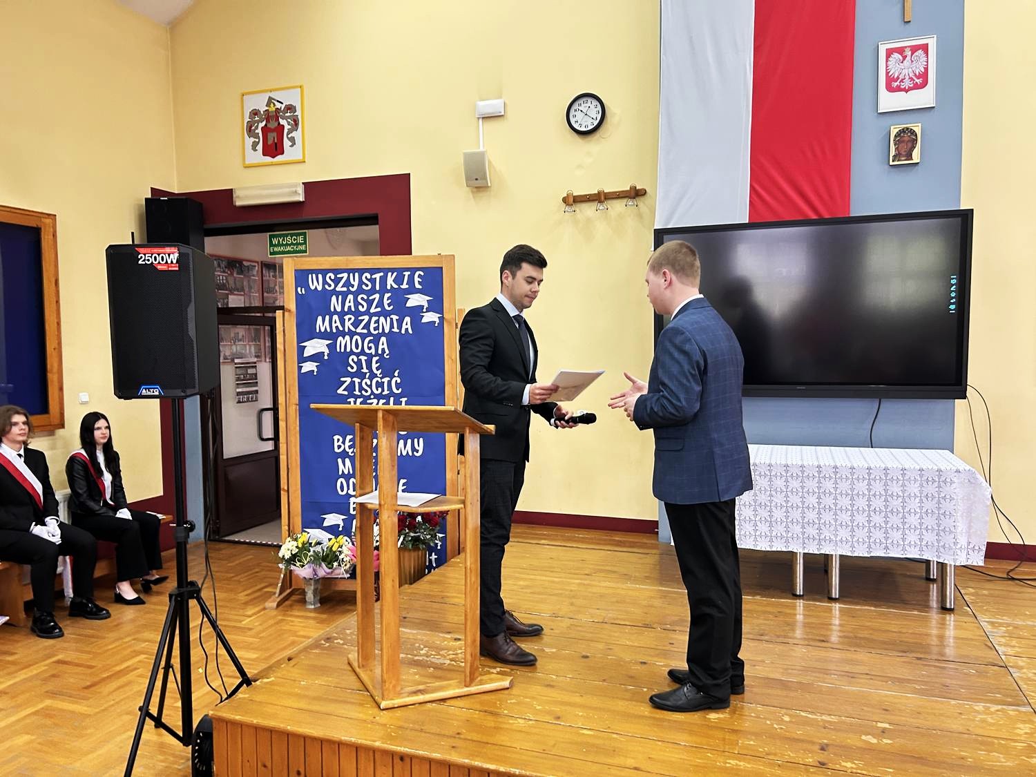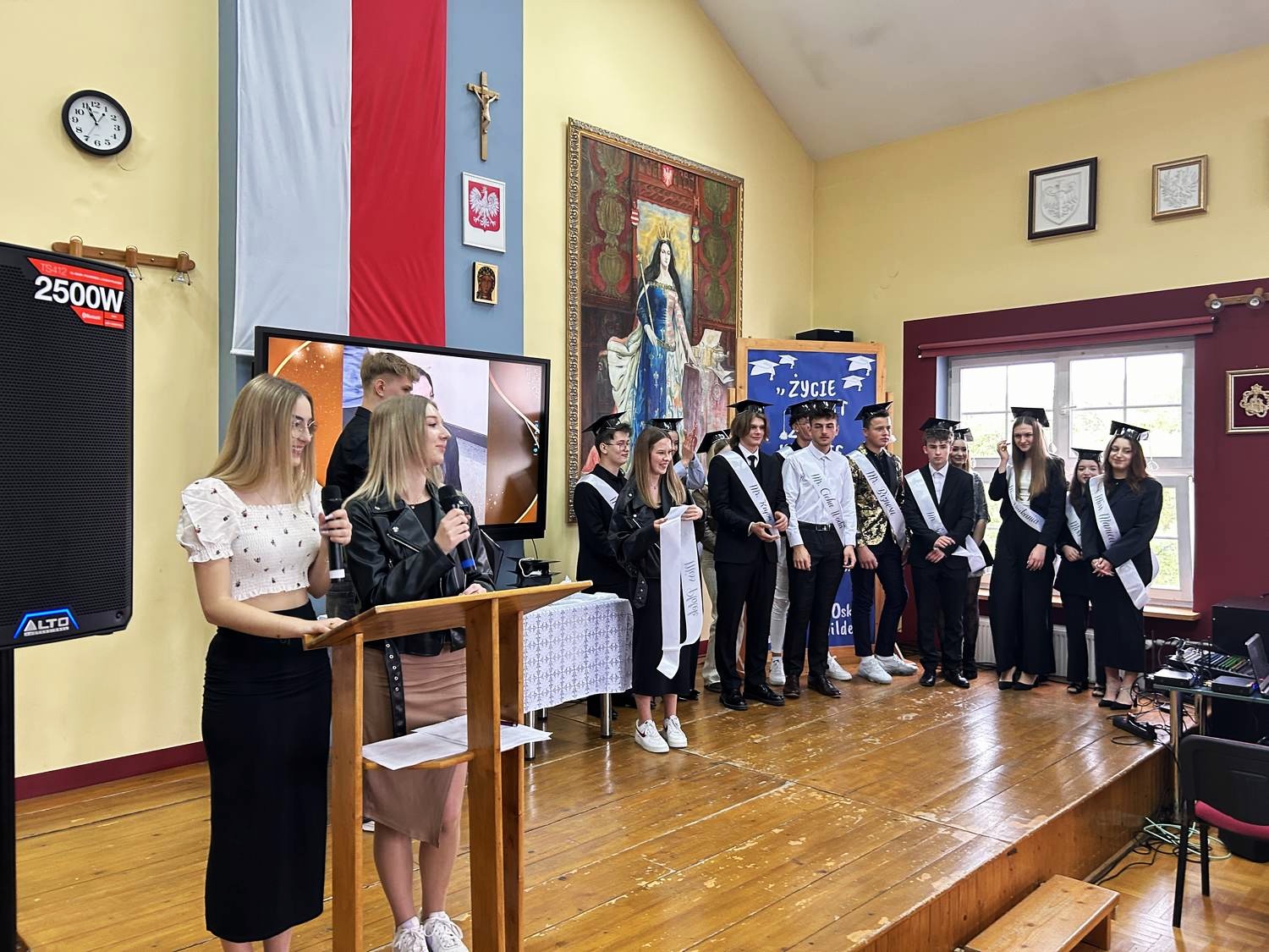 Druga część uroczystości odbyła się w auli szkolnej, była prowadzona przez Maturzystkę Weronikę Wrzyszcz. Po wprowadzeniu Sztandaru i odśpiewaniu Hymnu Narodowego głos kolejno zabierali Pani Dyrektor, Pan Wójt, Pani Wychowawczyni a także Przewodniczący Rady Rodziców, który rozdał uczniom symboliczne podarunki.