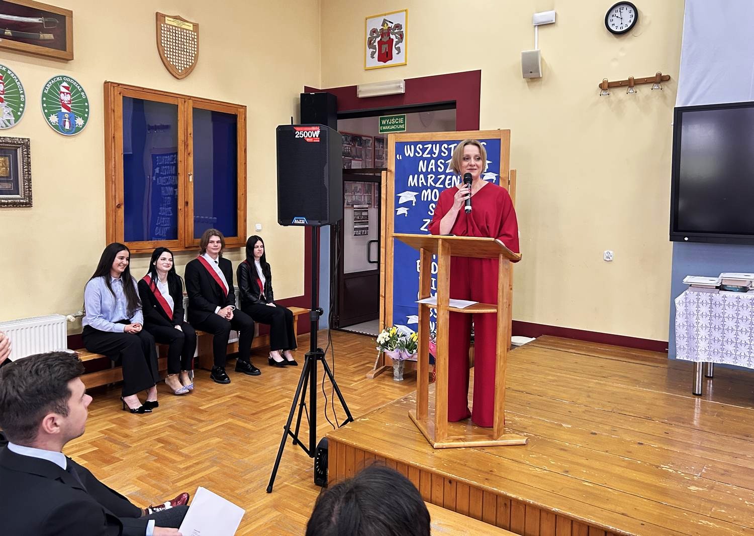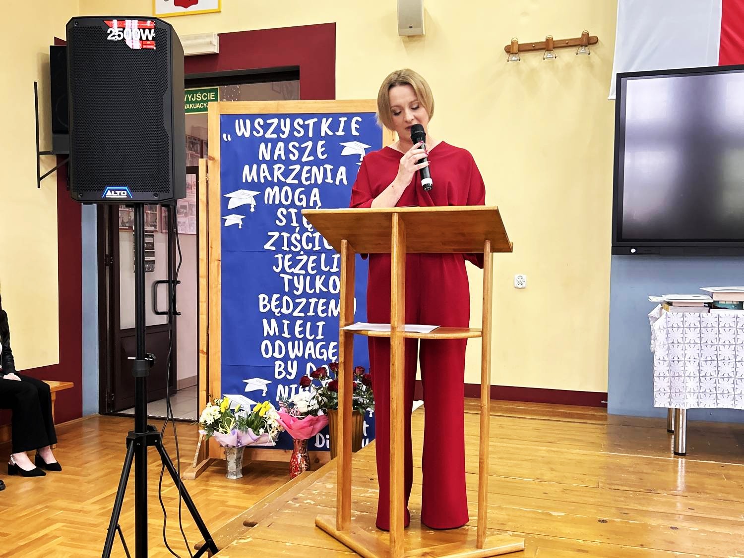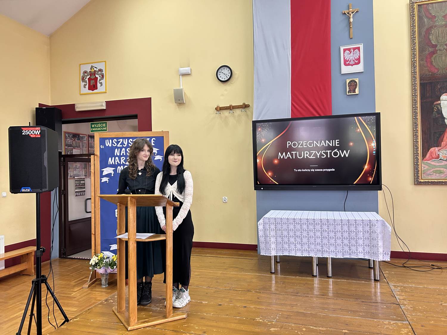 Druga część uroczystości odbyła się w auli szkolnej, była prowadzona przez Maturzystkę Weronikę Wrzyszcz. Po wprowadzeniu Sztandaru i odśpiewaniu Hymnu Narodowego głos kolejno zabierali Pani Dyrektor, Pan Wójt, Pani Wychowawczyni a także Przewodniczący Rady Rodziców, który rozdał uczniom symboliczne podarunki.