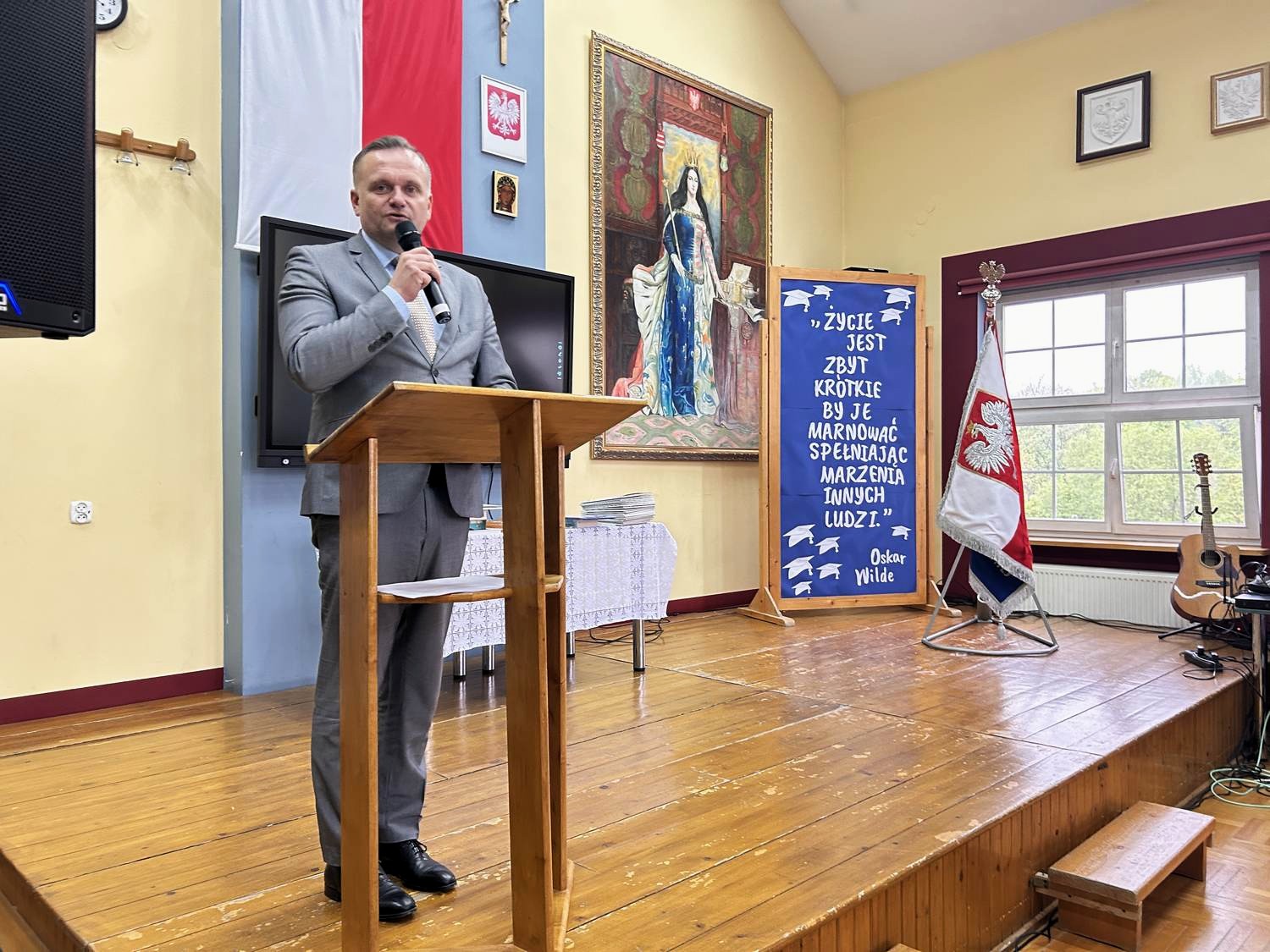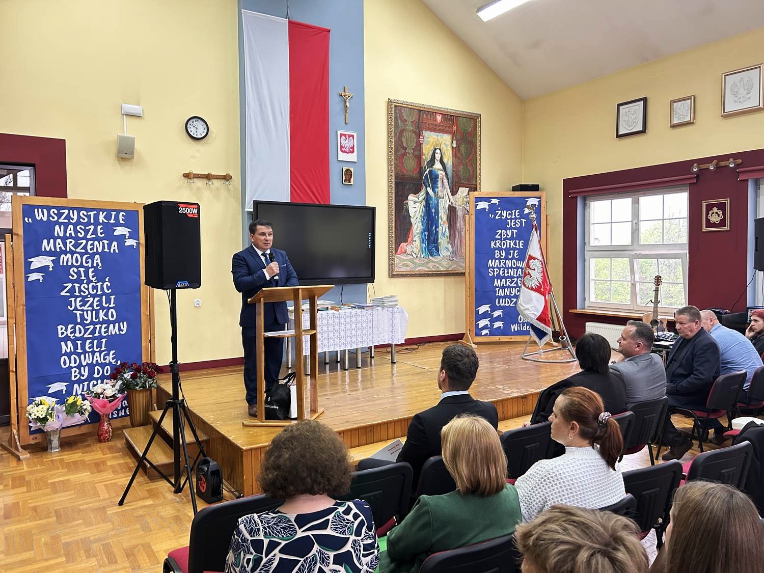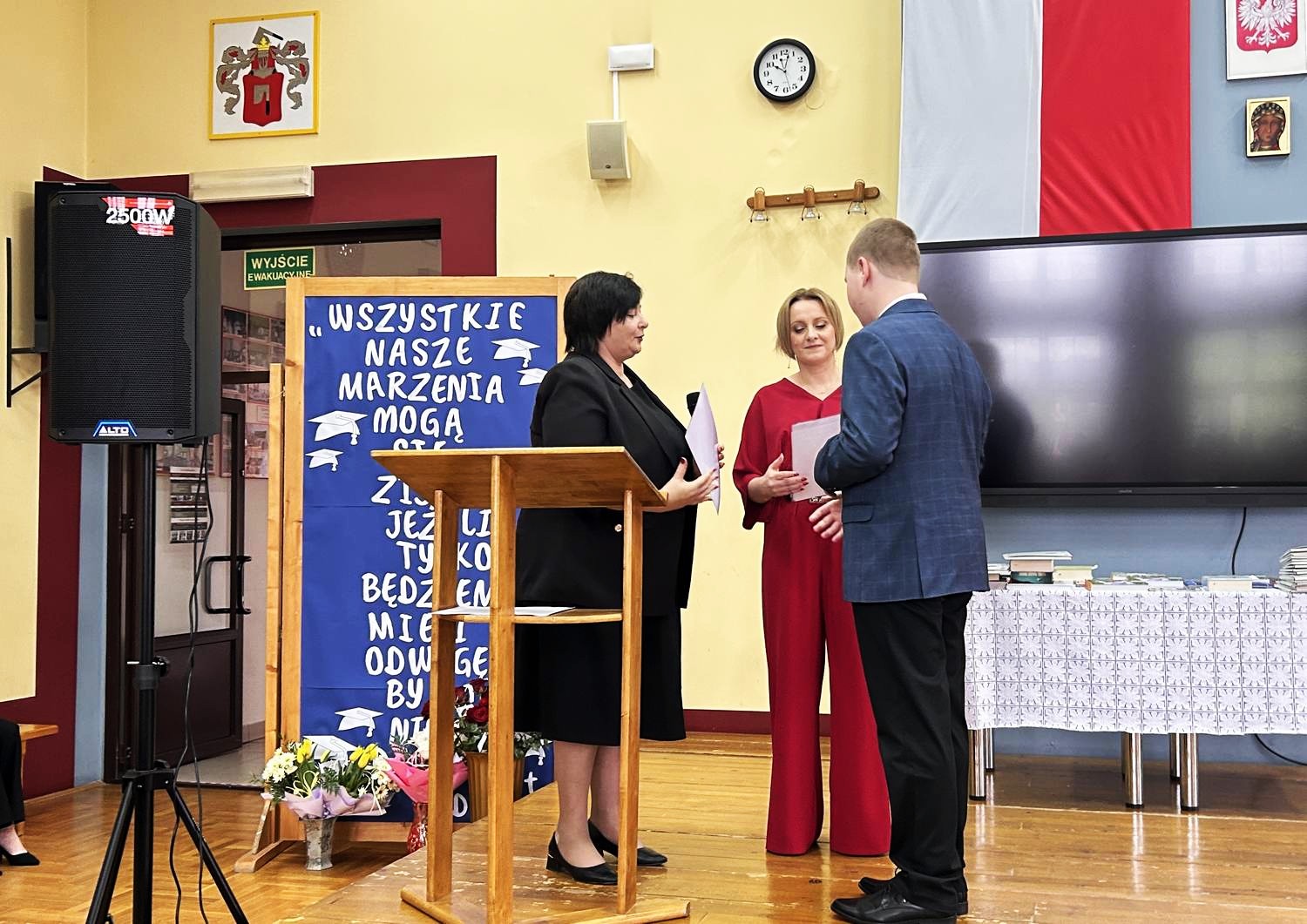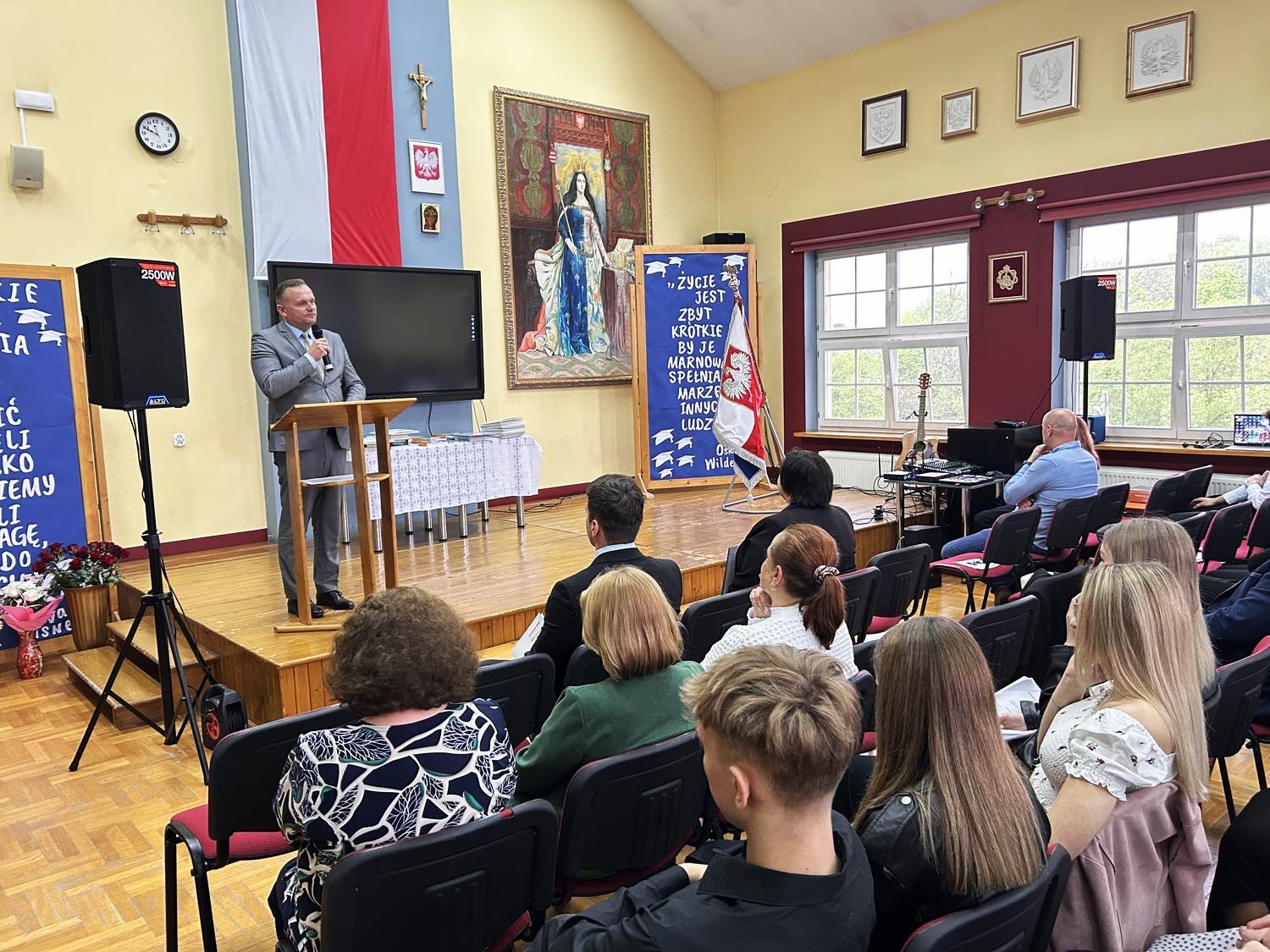 Druga część uroczystości odbyła się w auli szkolnej, była prowadzona przez Maturzystkę Weronikę Wrzyszcz. Po wprowadzeniu Sztandaru i odśpiewaniu Hymnu Narodowego głos kolejno zabierali Pani Dyrektor, Pan Wójt, Pani Wychowawczyni a także Przewodniczący Rady Rodziców, który rozdał uczniom symboliczne podarunki.
