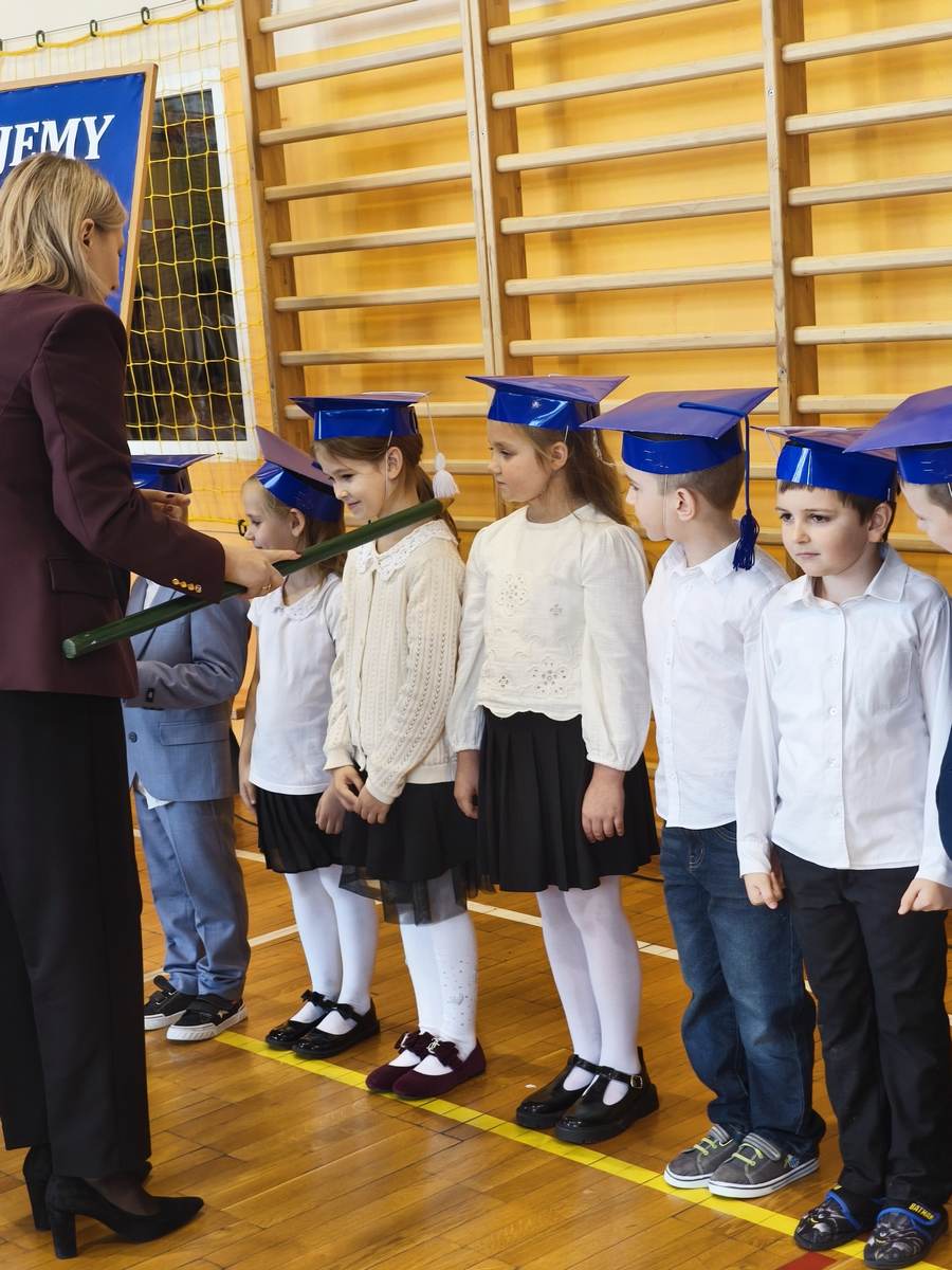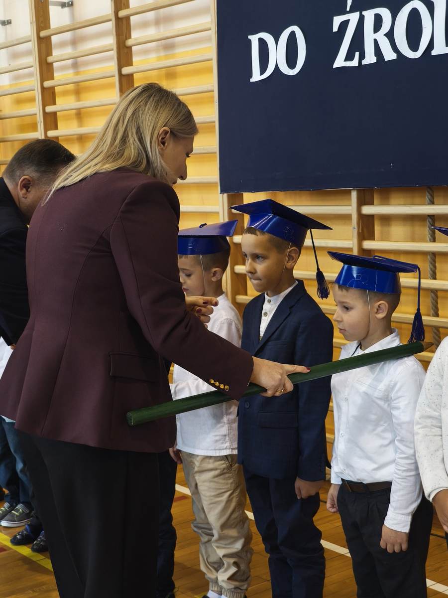 Po ślubowaniu Pani Dyrektor Joanna Dunikowska dokonała aktu pasowania, oficjalnie przyjmując pierwszoklasistów do grona uczniów.