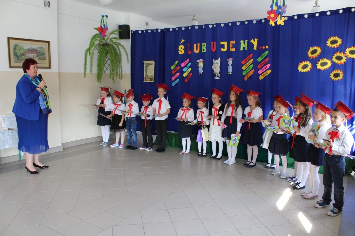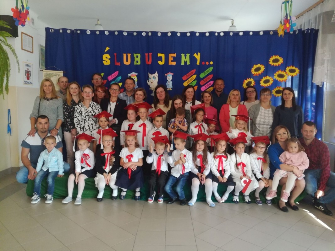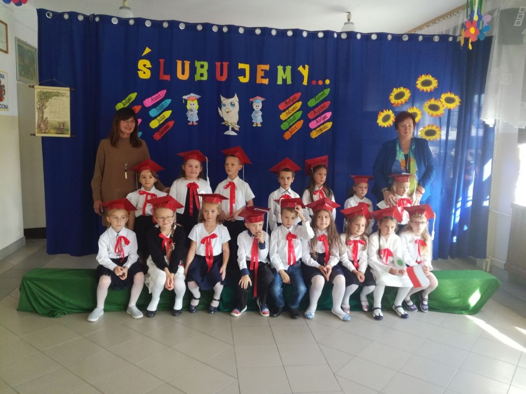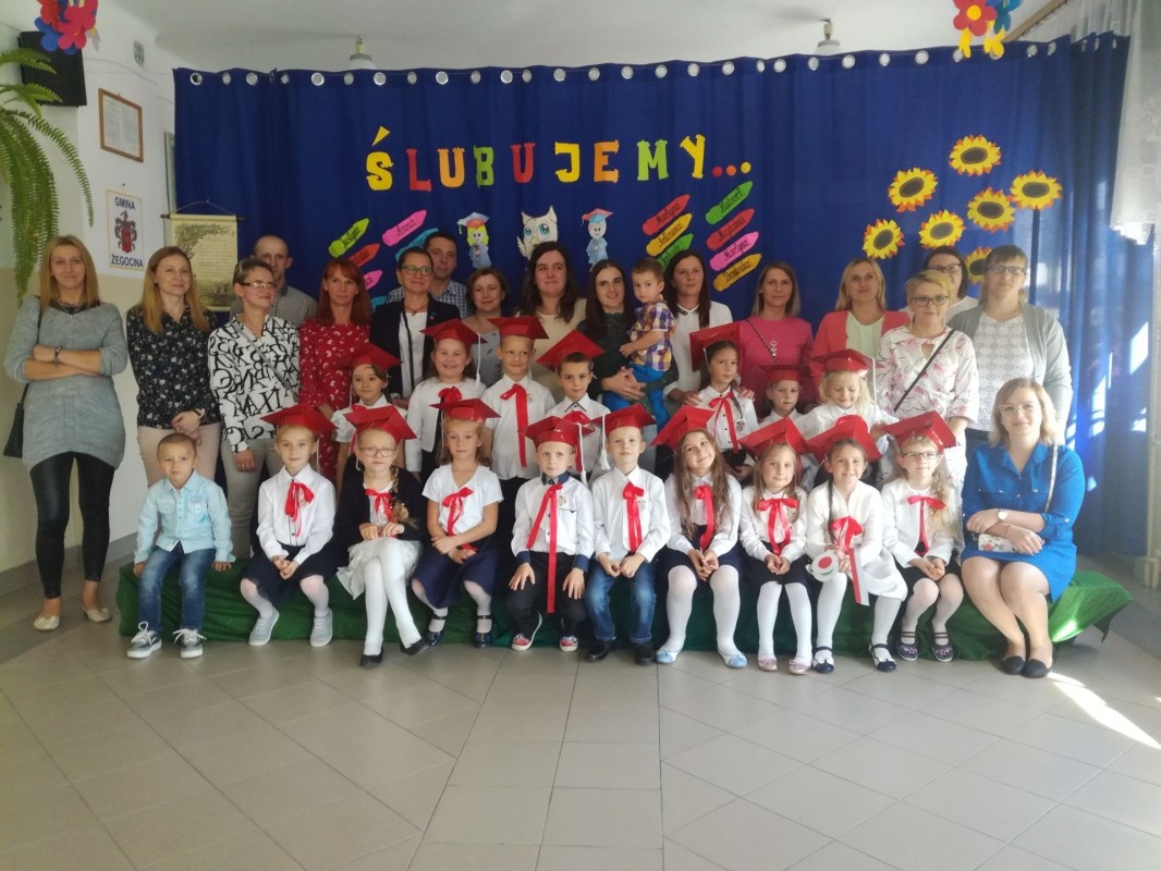 Dnia 15 października 2019 roku odbyło się ślubowanie 10 uczniów kl. I. Było to bardzo ważne wydarzenie nie tylko dla dzieci, ale także ich rodziców, którzy licznie przybyli na uroczystość. Pod opieką swojego wychowawcy – pana Jana Mikusa, pierwszaki pięknie zaprezentowały swoje umiejętności wokalno-recytatorskie. Wszyscy obecni, na czele z panią dyrektor Lucyną Nowak stwierdzili, że dzieci mogą stać się uczniami szkoły. W podniosłej atmosferze i po wzorowym złożeniu przez nich ślubowania pani dyrektor dokonała symbolicznego pasowania na uczniów. Następnie wszyscy pierwszoklasiści otrzymali gratulacje i upominki od rodziców, nauczycieli i kolegów z kl. II- III. Nowym uczniom życzymy wielu sukcesów w nauce.