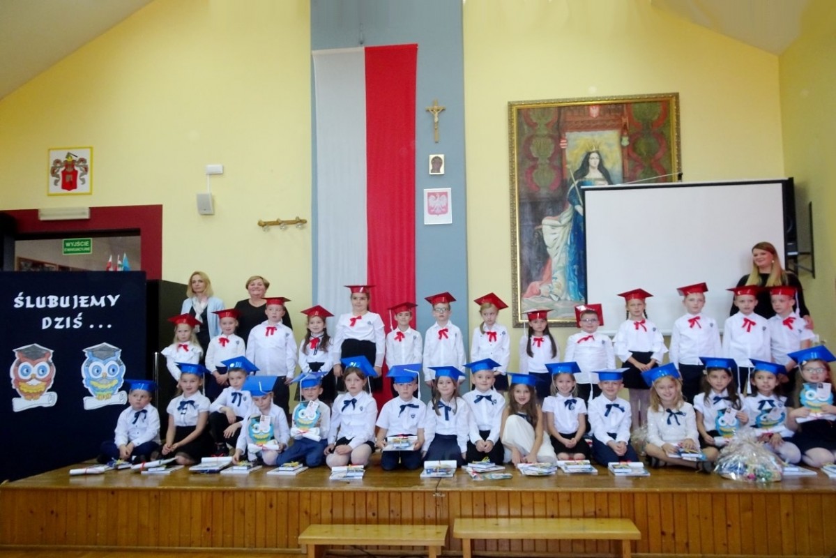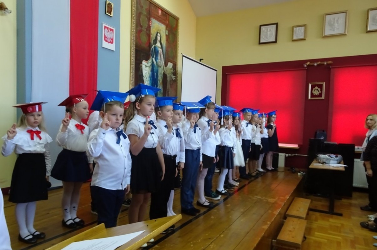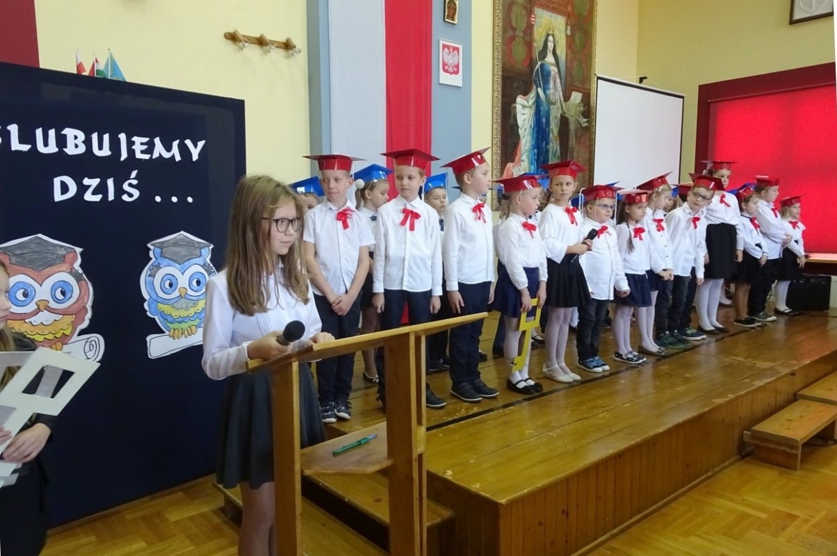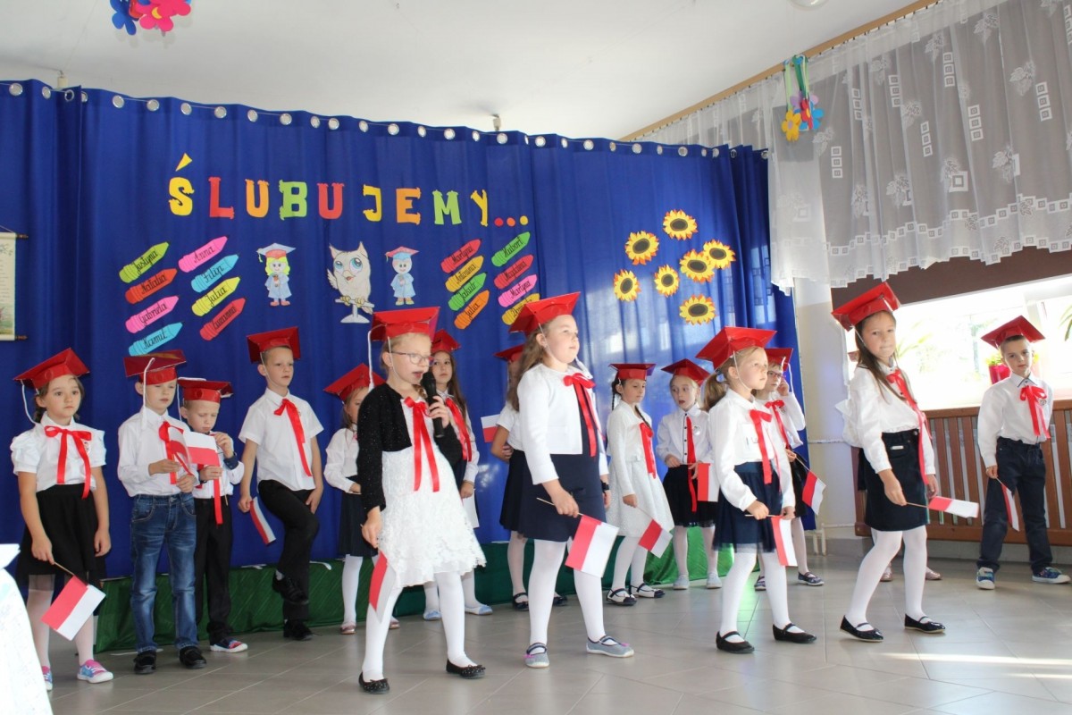 Dnia 15 października 2019 roku odbyło się ślubowanie 10 uczniów kl. I. Było to bardzo ważne wydarzenie nie tylko dla dzieci, ale także ich rodziców, którzy licznie przybyli na uroczystość. Pod opieką swojego wychowawcy – pana Jana Mikusa, pierwszaki pięknie zaprezentowały swoje umiejętności wokalno-recytatorskie. Wszyscy obecni, na czele z panią dyrektor Lucyną Nowak stwierdzili, że dzieci mogą stać się uczniami szkoły. W podniosłej atmosferze i po wzorowym złożeniu przez nich ślubowania pani dyrektor dokonała symbolicznego pasowania na uczniów. Następnie wszyscy pierwszoklasiści otrzymali gratulacje i upominki od rodziców, nauczycieli i kolegów z kl. II- III. Nowym uczniom życzymy wielu sukcesów w nauce.
