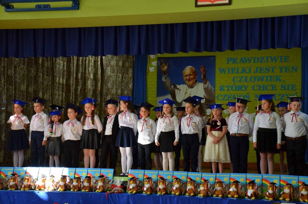 Na zakończenie uroczystości, głos zabrali uczniowie klasy trzeciej, którzy złożyli życzenia swoim młodszym kolegom, a potem z wspólnie z uczniami klasy drugiej oraz z dziećmi z Oddziałów Przedszkolnych wręczyli różne upominki.