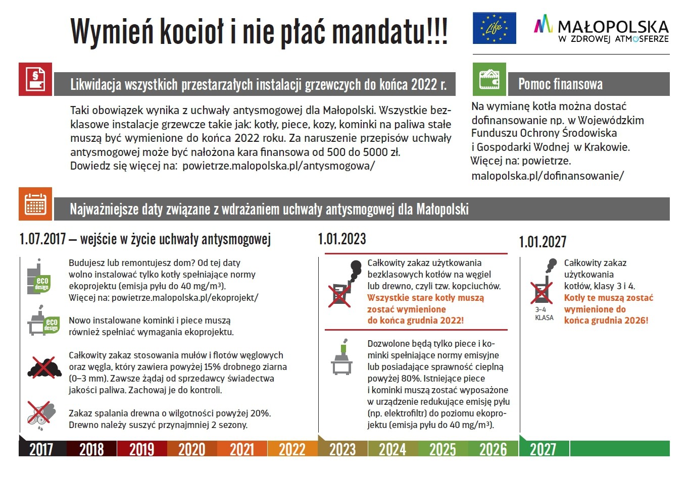 Od 1 lipca 2017 roku w Małopolsce nie można eksploatować nowego kotła na węgiel lub drewno lub kominka na drewno o parametrach emisji gorszych niż wyznaczone w unijnym rozporządzeniu w sprawie ekoprojektu (emisja pyłu do 40 mg/m³). Parametry te należy potwierdzić odpowiednią dokumentacją podczas kontroli. Za niedostosowanie się do przepisów wynikających z uchwały antysmogowej grozi mandat do 500 zł. Gdy sytuacja będzie się powtarzać sprawa może zostać skierowana do sądu - kara może wynieść nawet 5 000 zł!