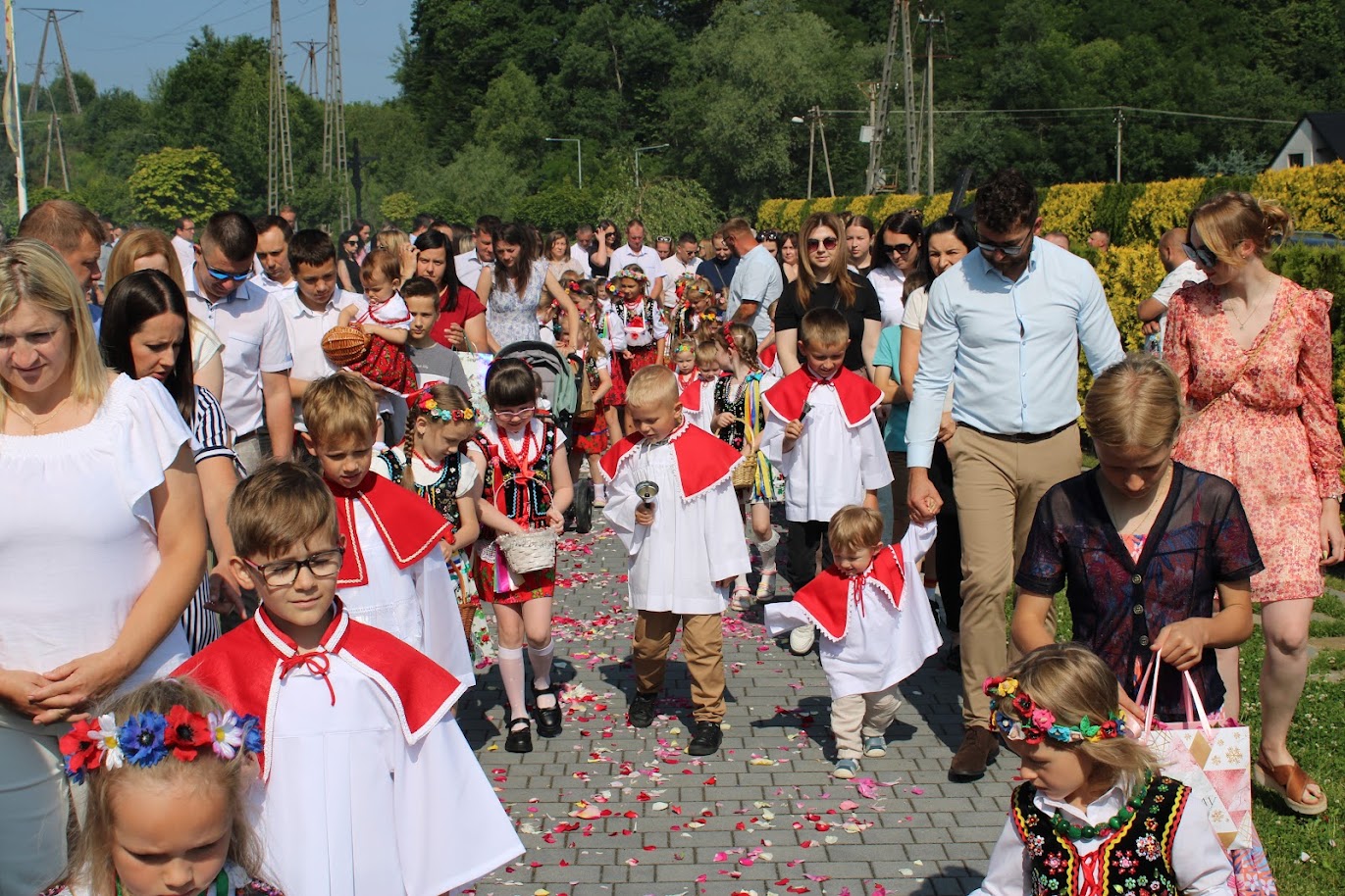 Uroczysta Msza Święta zgromadziła licznych wiernych, dzieci pierwszokomunijne, strażaków, Koło Gospodyń oraz grupy niosące figury i obrazy. Po Eucharystii wyruszyła tradycyjna procesja eucharystyczna do czterech ołtarzy, podczas której odczytano fragmenty Ewangelii i udzielono błogosławieństwa na cztery strony świata.