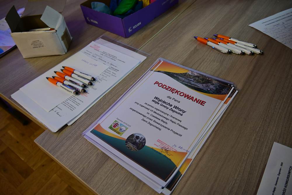 Po zakończeniu zmagań, głos zabrali zaproszeni goście. Wójt Wojciech Wrona oraz Joanna Pyrz pogratulowali młodzieży przejścia całej trasy, podziękowali nauczycielom za opiekę, a organizatorom za kolejną, udaną edycję wydarzenia promującego turystykę pieszą wśród młodych mieszkańców gminy.Wszyscy uczestnicy otrzymali pamiątkowe dyplomy oraz drobne upominki, a zwycięzcy konkursów – nagrody. Nowością tegorocznej edycji było losowanie, przez Zastępcę Wójta Joannę Pyrz, nagrody specjalnej – plecaka turystycznego, który trafił do jednego z uczestników rajdu.