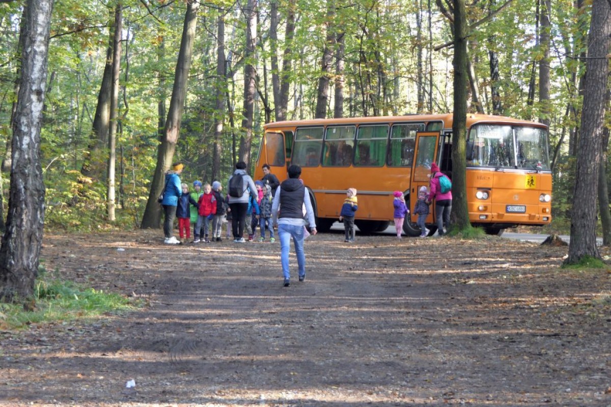 Pierwsza część imprezy – rajd pieszy, tym razem przy pięknej, słonecznej pogodzie, rozpoczęła się na przydrożnej polanie w rajbrockim lesie, dokąd dzieci zostały dowiezione przez szkolny autobus.