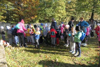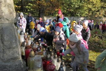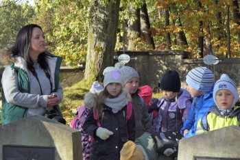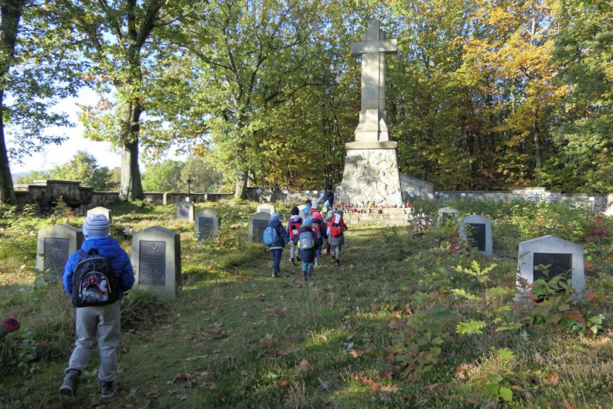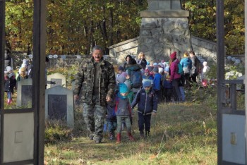 Po krótkim powitaniu przez dyrektorkę bytomskiej szkoły – Lucynę Nowak i przedstawieniu gości oraz opiekunów, wyruszono w drogę. Trasa pieszej wędrówki wiodła najpierw do cmentarza wojennego nr 303 w Rajbrocie, na którym pan Tadeusz Olszewski w krótkiej pogadance opowiedział o tym miejscu spoczynku żołnierzy I wojny światowej, poległych tu w grudniu 1914 roku. Przedszkolaki pod centralnym pomnikiem cmentarza oraz na na grobach żołnierzy symboliczne wiązanki kwiatów, zapaliły znicze oraz odmówiły modlitwę za poległych.
