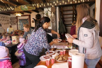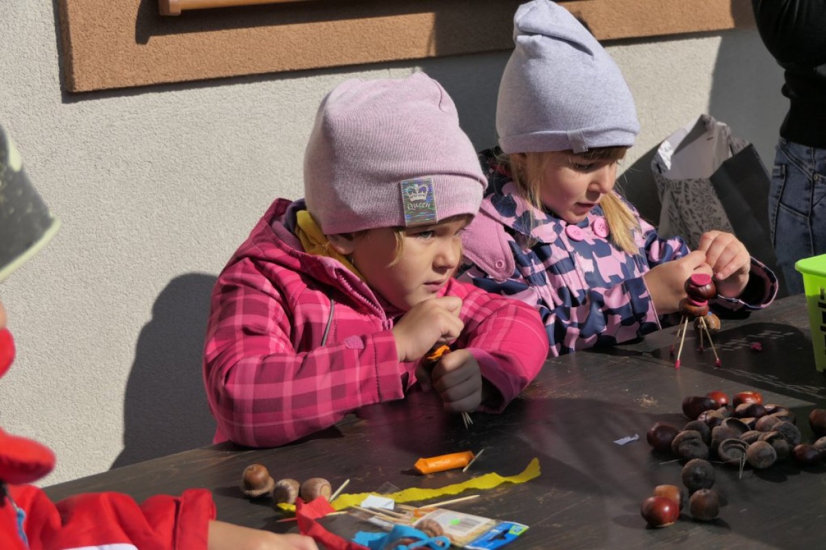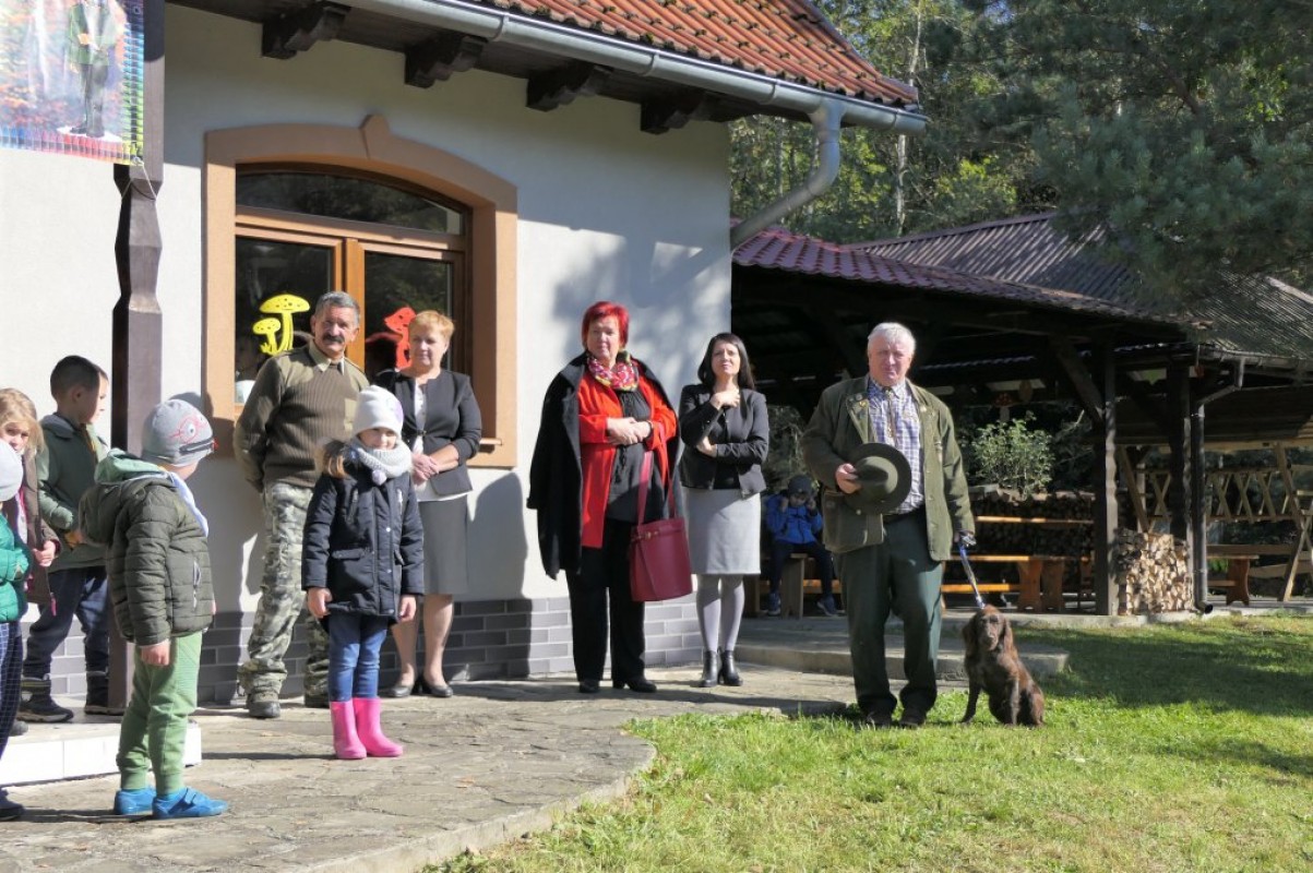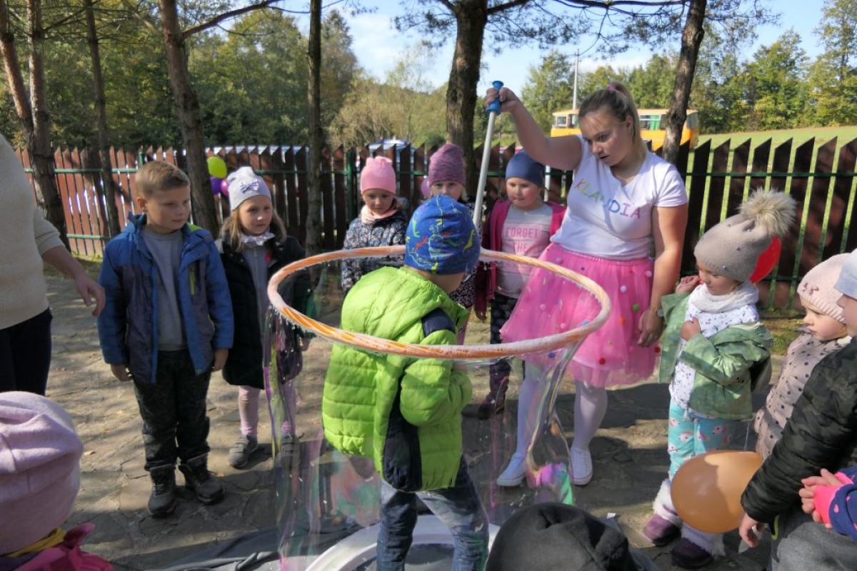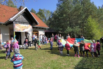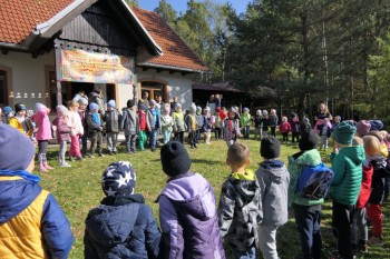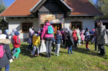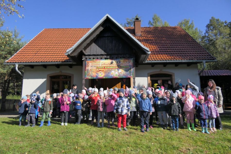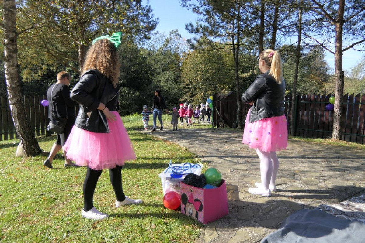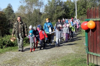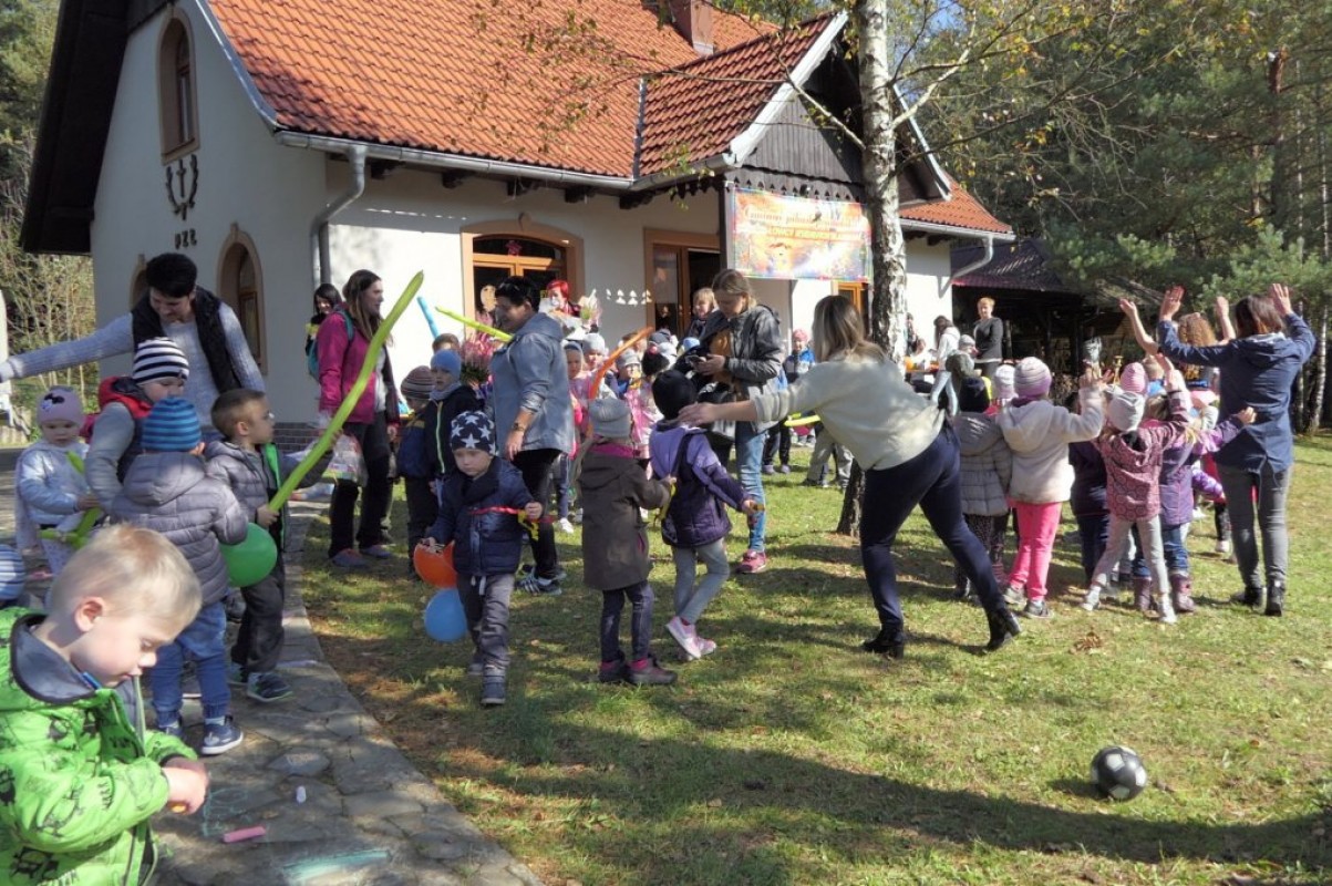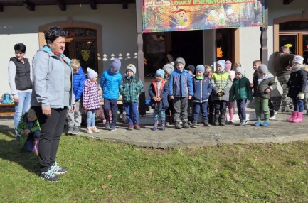 Podziwiając jesienne barwy lasu, zbierając żołędzie, wielokolorowe liście, dzieci wraz z opiekunkami dotarły do mety rajdu, czyli do położonego w Łąkcie Górnej Domku Myśliwskiego Koła Łowieckiego "Ryś". Tu czekali już na nich rodzice, a także członkowie Koła Łowieckiego z Adamem Durbasem na czele, którzy szykowali dla dzieci i gości poczęstunek, w tym kiełbaski z grilla. Po nabraniu sił przedszkolaki zostały zaproszone do zabaw, organizowanych przez animatorki i wychowawczynie. Można było nauczyć się robić zabawki z żołędzi, bawić z chusta animacyjną, robić bańki mydlane, tańczyć, rysować kredą itd.