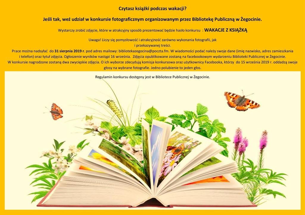 Gminna Biblioteka Publiczna w Żegocinie ogłasza konkurs fotograficzny pod hasłem „Wakacje z książką”. Wystarczy zrobić zdjęcie, które w atrakcyjny sposób będzie prezentować hasło konkursu.