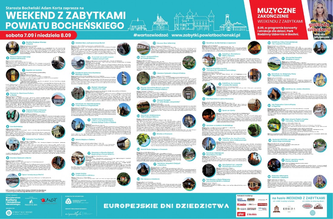 W najbliższy weekend 7 i 8 września, Starostwo Powiatowe w Bochni już po raz 12 organizuje „Weekend z zabytkami Powiatu Bocheńskiego” . Ideą wydarzenia jest umożliwienie mieszkańcom i turystom zwiedzenia najciekawszych obiektów i miejsc Powiatu, na co dzień niedostępnych, bądź takich, których zwiedzanie wiąże się z opłatami. W pierwszy weekend września, wstęp do tych miejsc będzie darmowy! (Z wyjątkiem Kopalni Soli w Bochni, gdzie będzie obowiązywał 50% rabat na zjazdy).