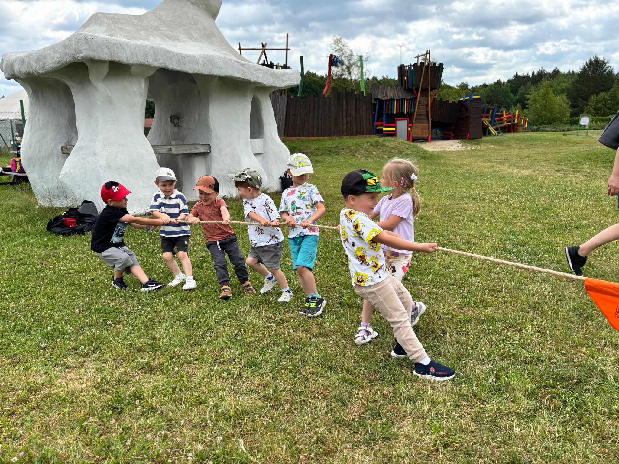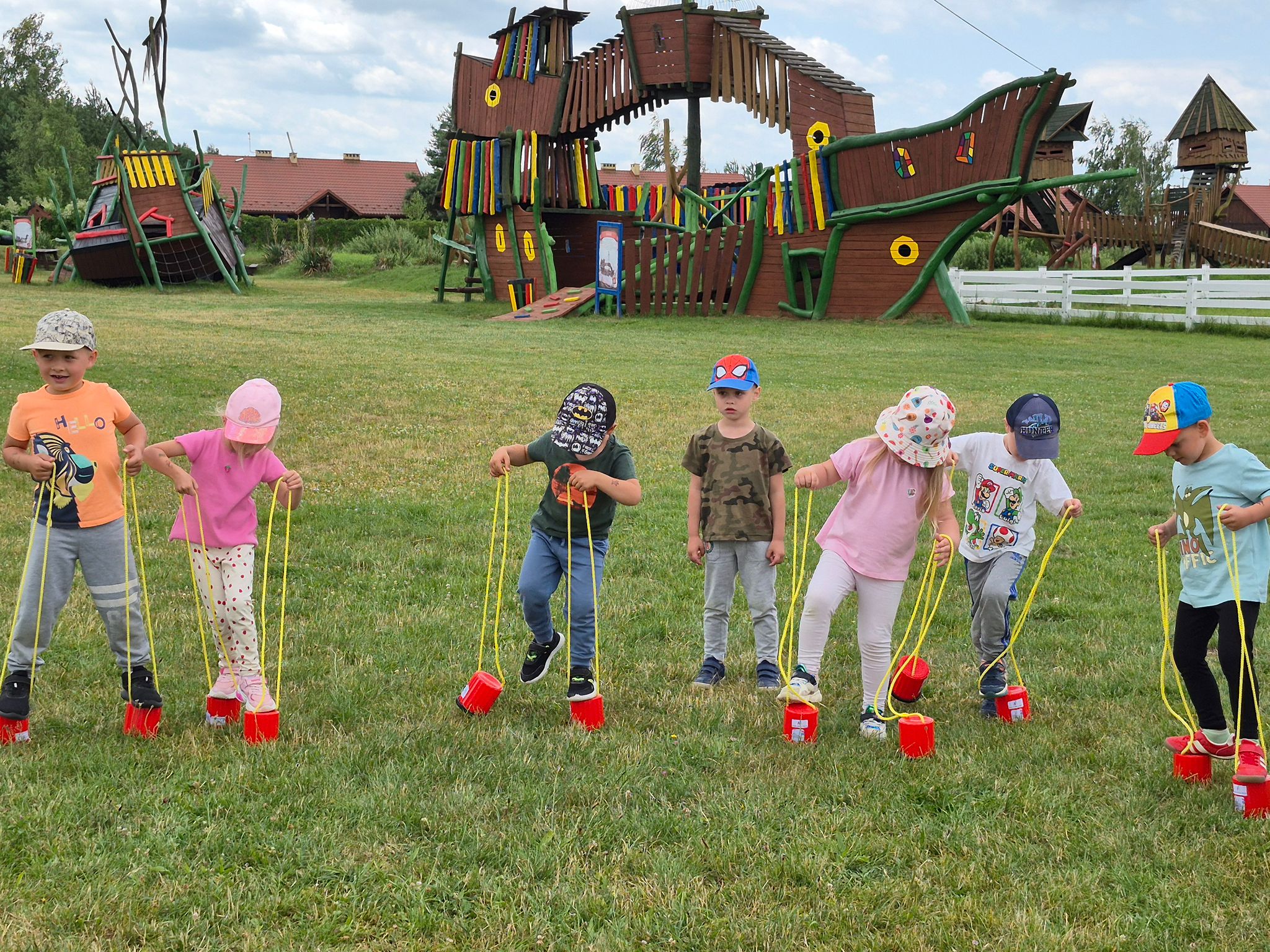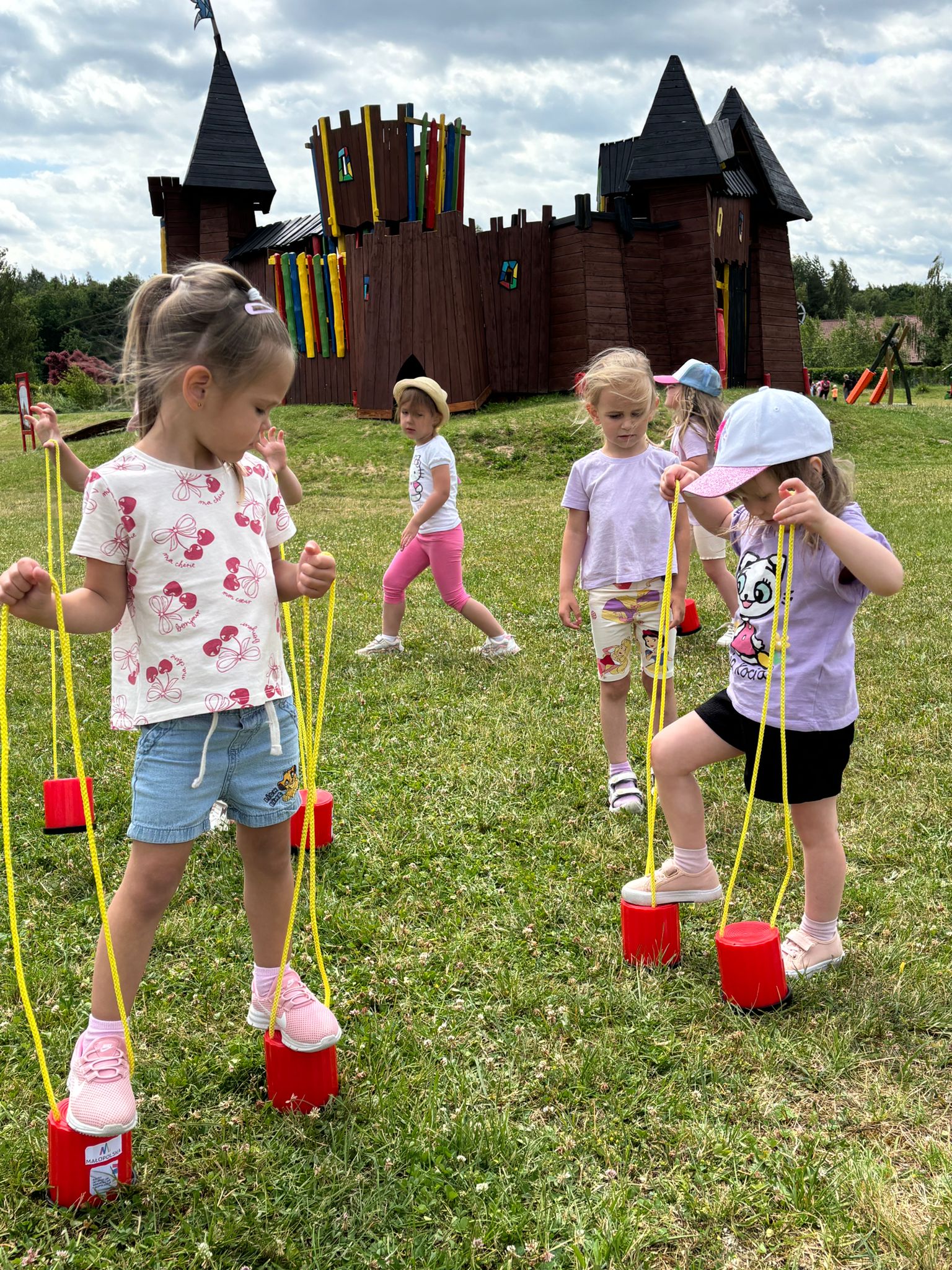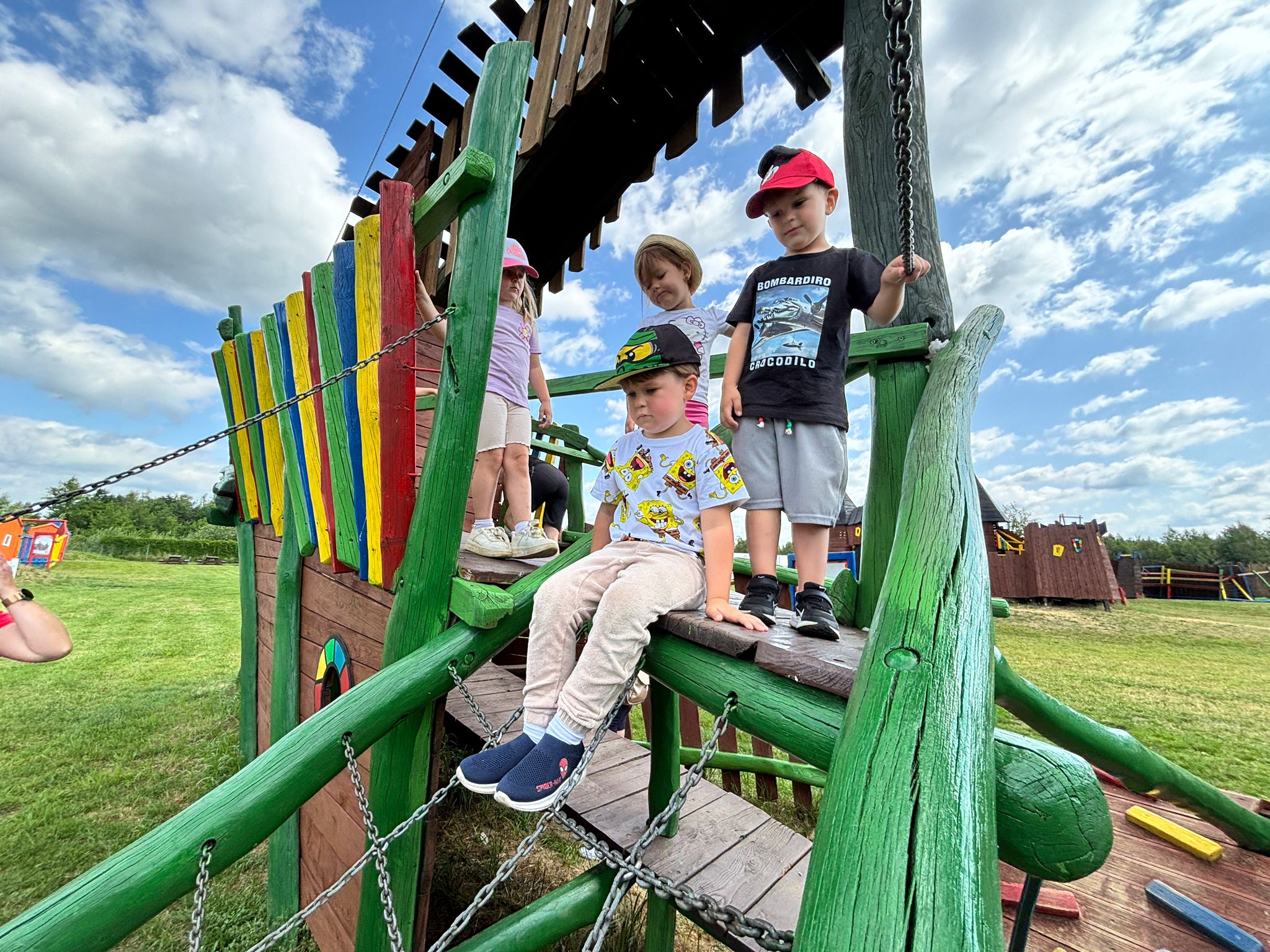 Następnie dzieci mogły skorzystać z różnorodnych atrakcji terenowych. Dużym zainteresowaniem cieszyły się drewniane budowle do wspinaczki, labirynt oraz zjazd na tyrolce. Nie zabrakło również aktywności sportowych – w ramach „sportowych potyczek” dzieci brały udział w przeciąganiu liny, wyścigach w workach oraz chodzeniu na szczudłach. Zabawy te dostarczyły uczestnikom wiele radości i okazji do wspólnej integracji.