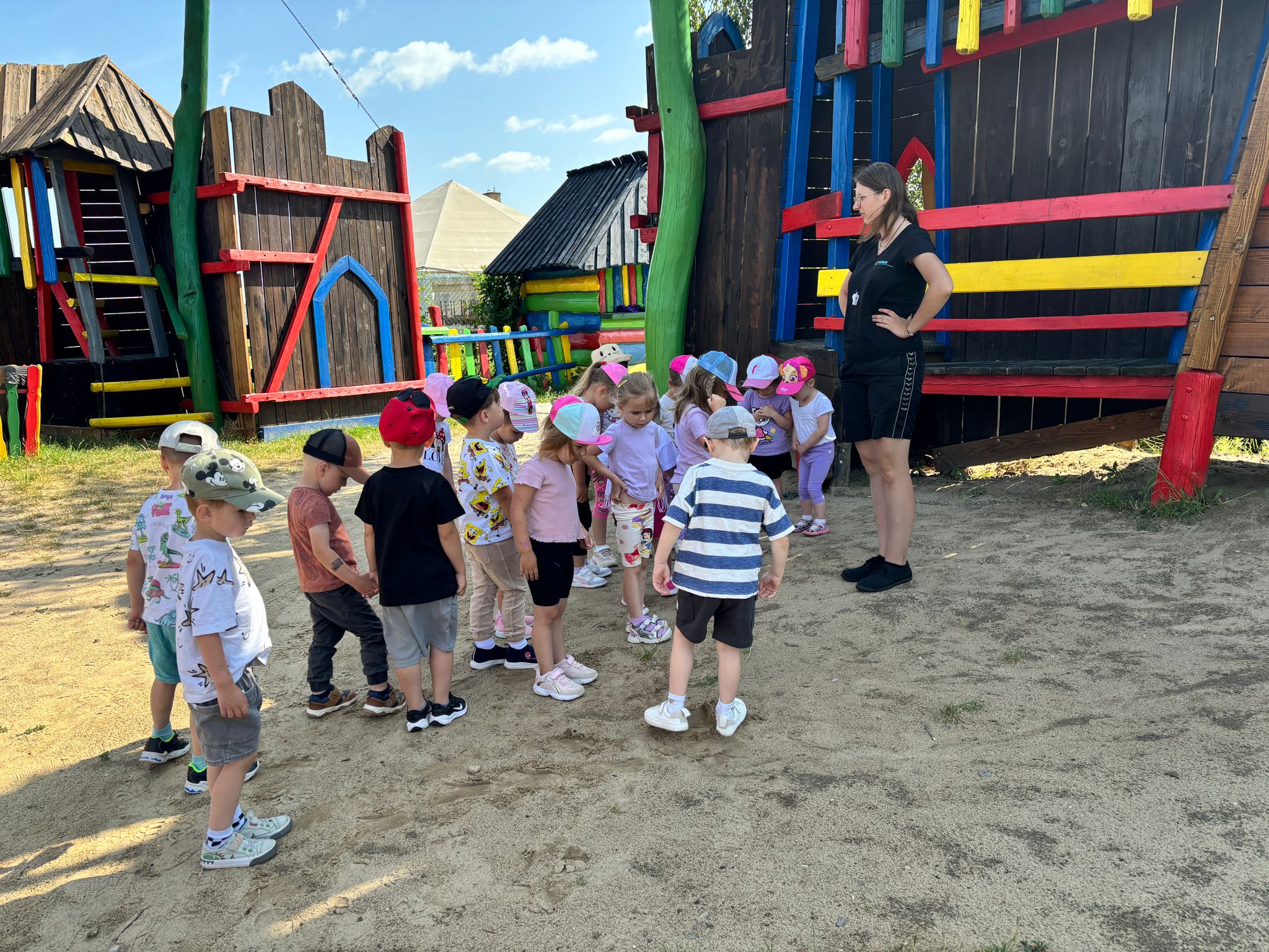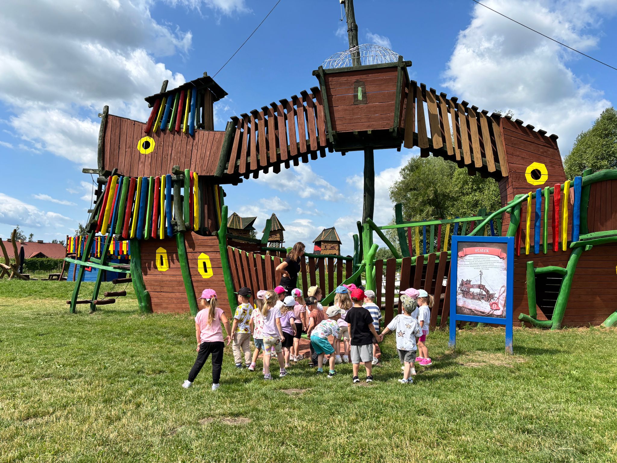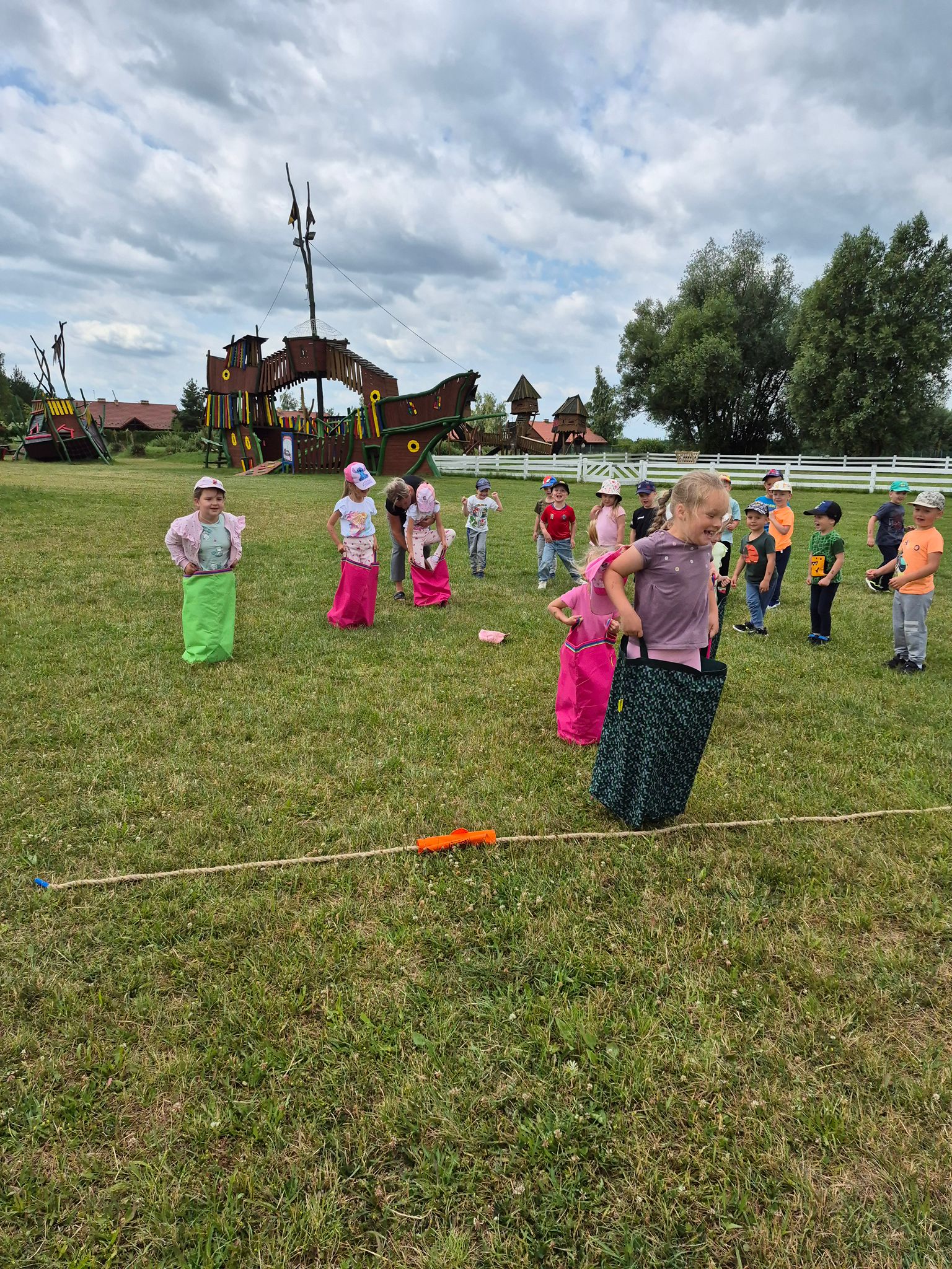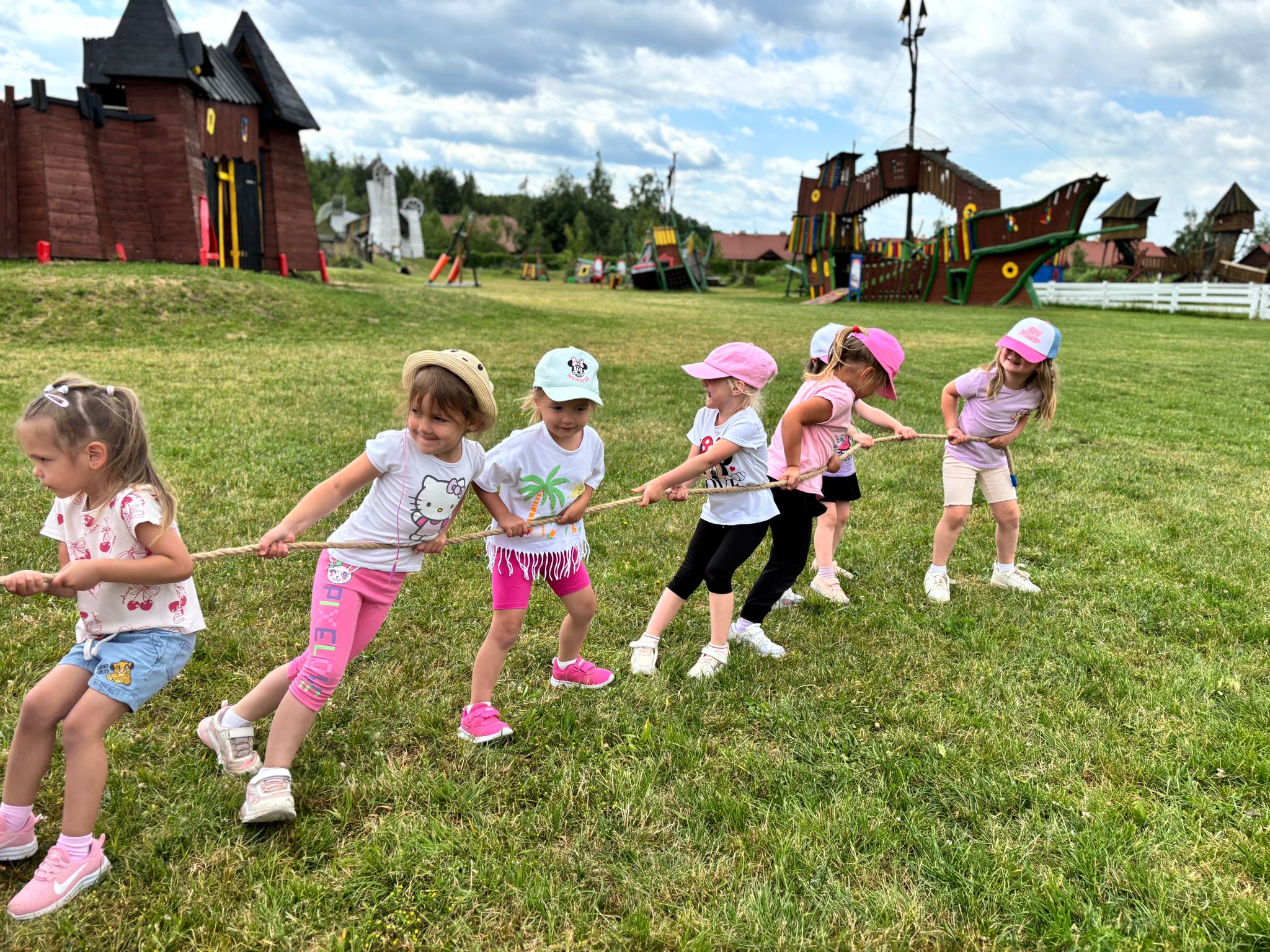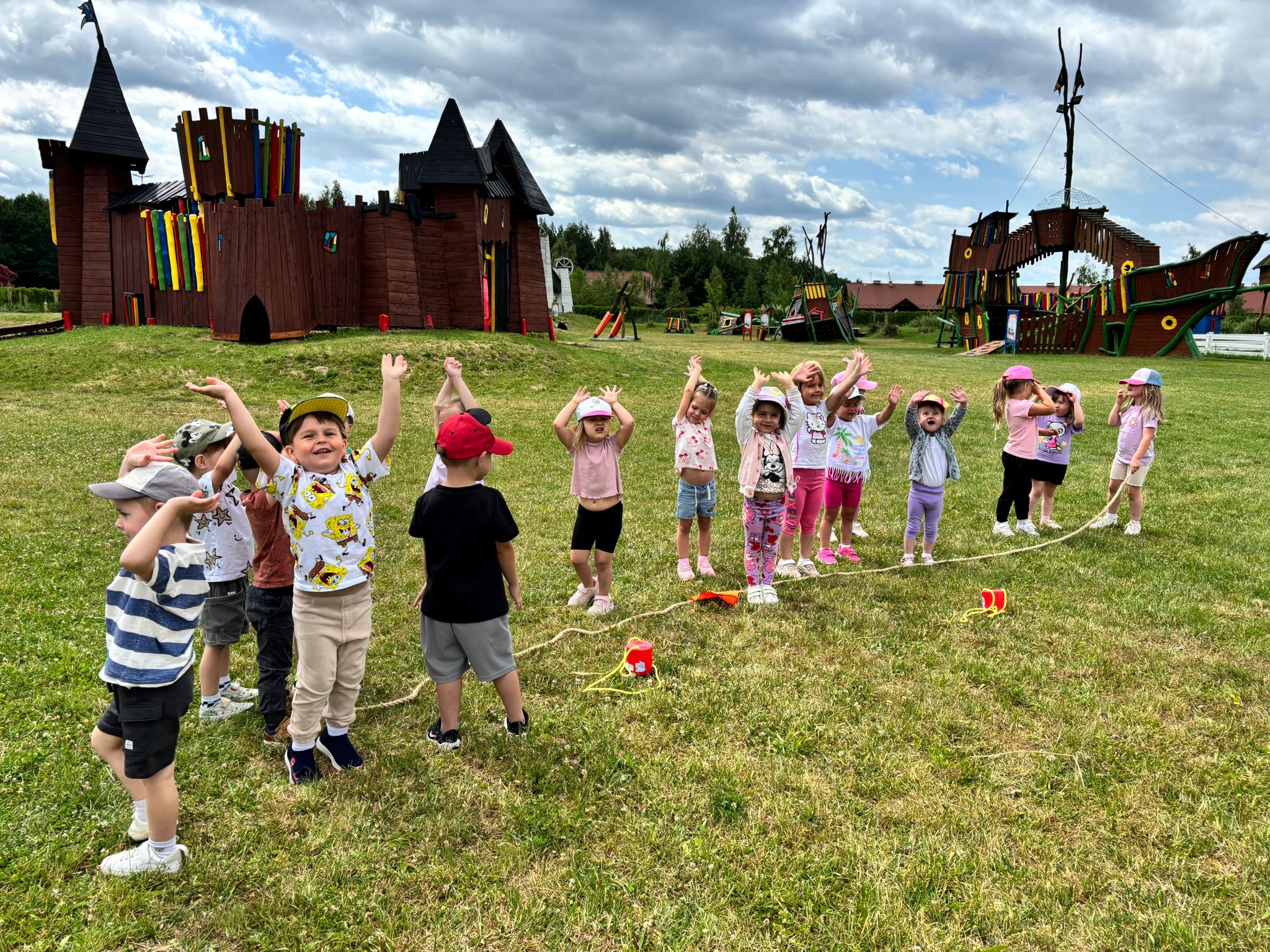 Następnie dzieci mogły skorzystać z różnorodnych atrakcji terenowych. Dużym zainteresowaniem cieszyły się drewniane budowle do wspinaczki, labirynt oraz zjazd na tyrolce. Nie zabrakło również aktywności sportowych – w ramach „sportowych potyczek” dzieci brały udział w przeciąganiu liny, wyścigach w workach oraz chodzeniu na szczudłach. Zabawy te dostarczyły uczestnikom wiele radości i okazji do wspólnej integracji.
