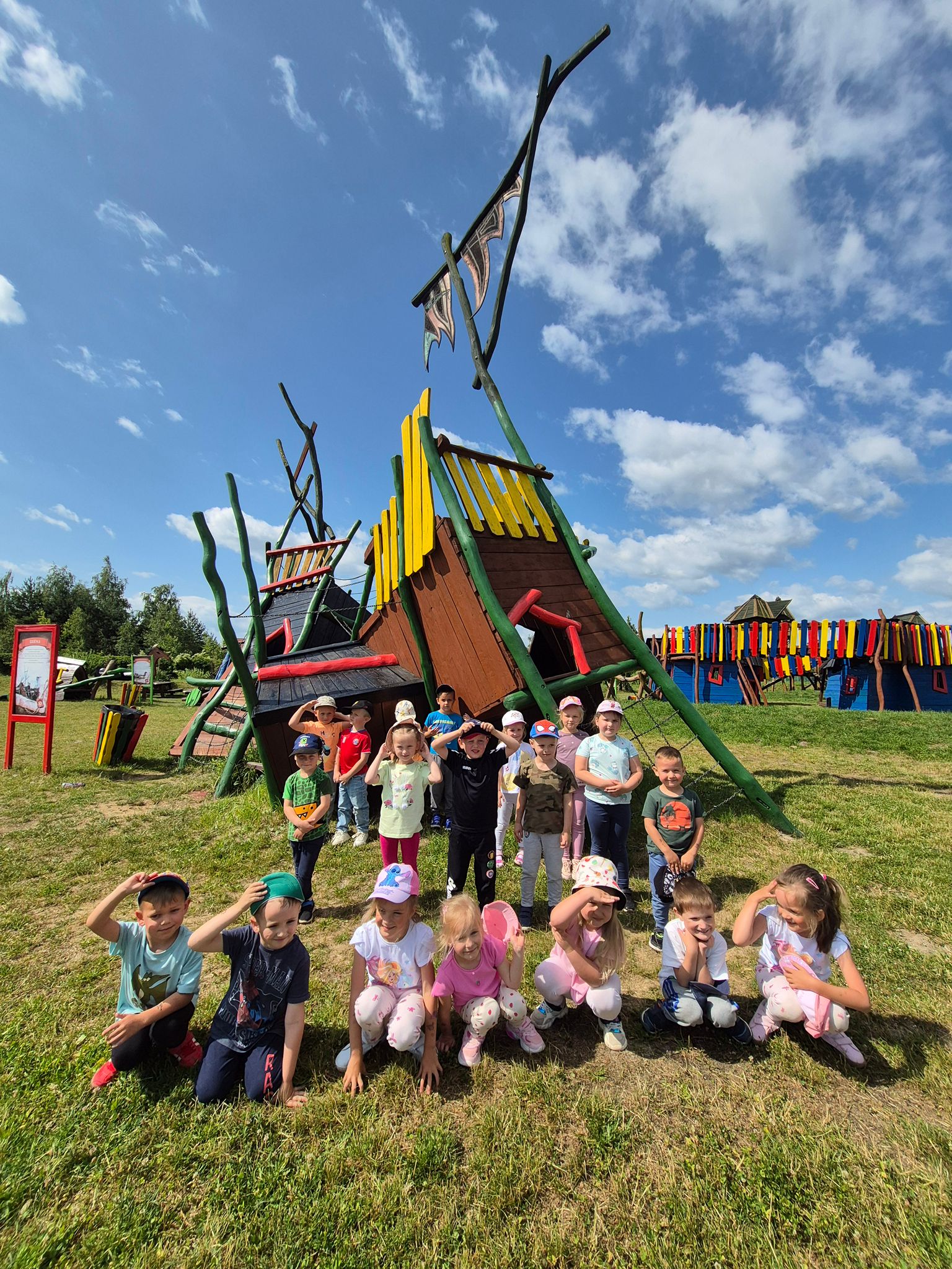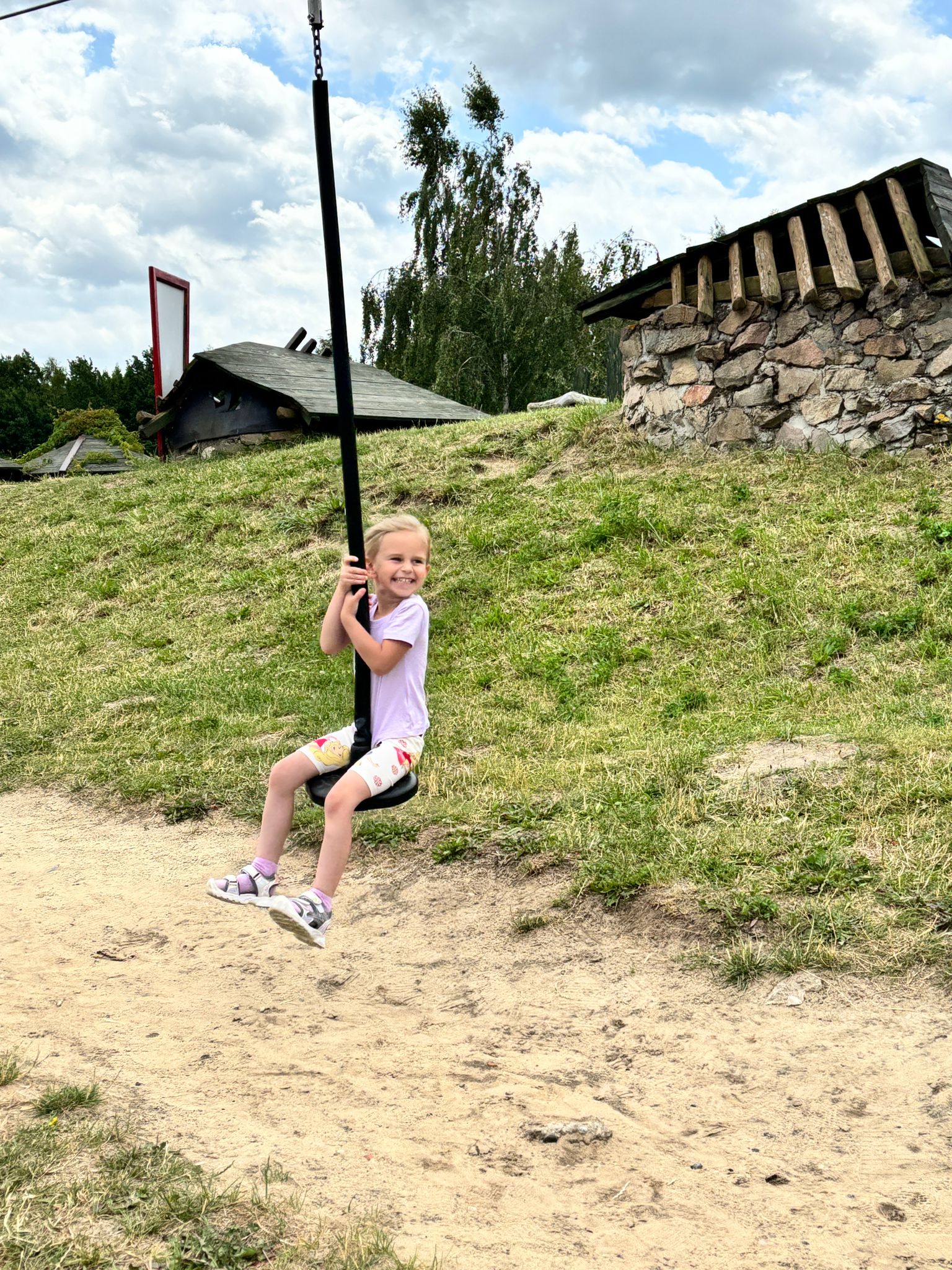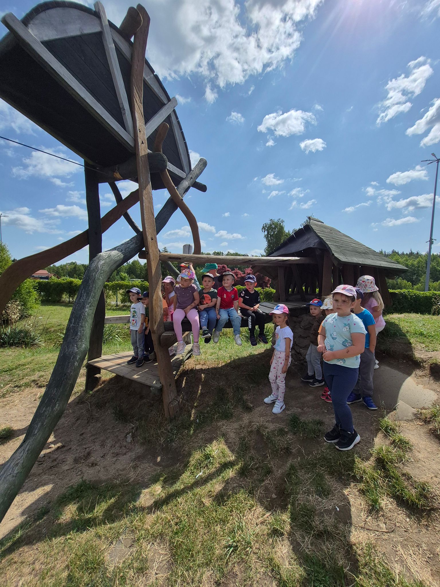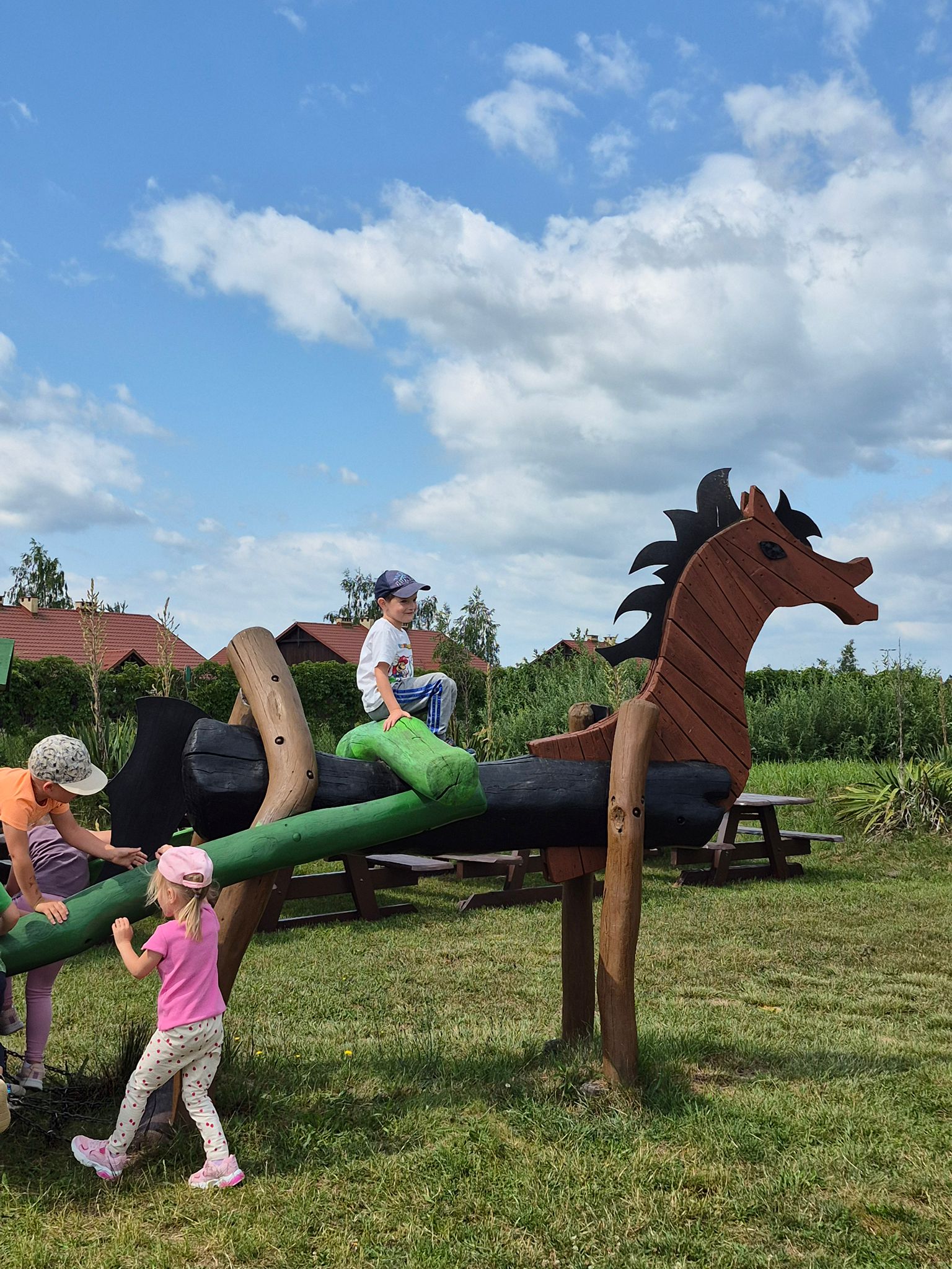 Następnie dzieci mogły skorzystać z różnorodnych atrakcji terenowych. Dużym zainteresowaniem cieszyły się drewniane budowle do wspinaczki, labirynt oraz zjazd na tyrolce. Nie zabrakło również aktywności sportowych – w ramach „sportowych potyczek” dzieci brały udział w przeciąganiu liny, wyścigach w workach oraz chodzeniu na szczudłach. Zabawy te dostarczyły uczestnikom wiele radości i okazji do wspólnej integracji.